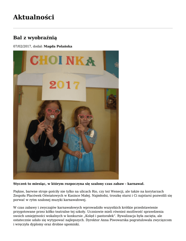 Aktualności Bal z wyobraźnią 07/02/2017, dodał: Magda Polańska Styczeń to miesiąc, w którym rozpoczyna się szalony czas zabaw - karnawał. Piękne, barwne stroje gościły nie tylko na ulicach Rio, czy też Wenecji, ale także na korytarzach Zespołu Placówek Oświatowych w Kasince Małej. Najmłodsi, troszkę starsi i Ci najstarsi pozwolili się porwać w rytm szalonej muzyki karnawałowej. W czas zabawy i zwyczajów karnawałowych wprowadziło wszystkich krótkie przedstawienie przygotowane przez kółko teatralne tej szkoły. Uczniowie mieli również możliwość sprawdzenia swoich umiejętności wokalnych w konkursie „Kolęd i pastorałek”. Rywalizacja była zacięta, ale ostatecznie udało się wytypować najlepszych. Dyrektor Anna Piwowarska pogratulowała zwycięzcom i wręczyła dyplomy oraz drobne upominki. Po wyczerpujących tańcach i zabawie przyszedł czas na pyszny poczęstunek przygotowany przez rodziców. Milusińscy mieli także okazję fotografowania się w przygotowanej specjalnie na tę okazję fotobudce. Justyna Łazorko Małgorzata Łabuz galeria zdjęć Bajkowy bal w przedszkolu