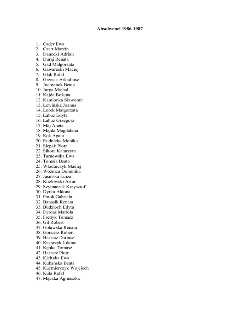 Absolwenci 1986-1987 1. Cader Ewa 2. Czart Marcin 3. Danecki Adrian 4. Duraj Renata 5. Gad Małgorzata 6. Gawarecki Maciej 7. Głąb Rafał 8. Grzesik Arkadiusz 9. Jochymek Beata 10. Jurga Michał 11. Kajda Bożena 12. Kamionka Sławomir 13. Lewińska Joanna 14. Lorek Małgorzata 15. Łabuz Edyta 16. Łabuz Grzegorz 17. Maj Aneta 18. Majda Magdalena 19. Rok Agata 20. Rudnicka Monika 21. Siepak Piotr 22. Sikora Katarzyna 23. Tarnowska Ewa 24. Tomsia Beata 25. Włodarczyk Maciej 26. Woźnica Dominika 27. Jasińska Luiza 28. Kozłowski Artur 29. Szymaczek Krzysztof 30. Dyrka Aldona 31. Potok Gabriela 32. Banasik Renata 33. Budzioch Edyta 34. Derdaś Mariola 35. Fredyk Tomasz 36. Gil Robert 37. Goławska Renata 38. Goncerz Robert 39. Harłacz Dariusz 40. Kasprzyk Jolanta 41. Kępka Tomasz 42. Harłacz Piotr 43. Kiełtyka Ewa 44. Kubańska Beata 45. Kućmierczyk Wojciech 46. Kula Rafał 47. Mączka Agnieszka 48. Mączka Jolanta 49. Morawski Marcin 50. Mól Anna 51. Nabiałek Helena 52. Nowak Joanna 53. Piątek Andrzej 54. Piątek Dariusz 55. Piechowicz Robert 56. Sokół Elżbieta 57. Stachura Iwona 58. Stojak Sebastian 59. Szymański Piotr 60. Tuteja Agnieszka 61. Baranek Iwona 62. Bogacka Barbara 63. Bigaj Joanna 64. Bień Adam 65. Biały Zbigniew 66. Błażejczyk Jolanta 67. Ciuraszkiewicz Magdalena 68. Chruścińska Anna 69. Drelich Zbigniew 70. Feliksie Dorota 71. Gęgotek Teresa 72. Gieszczyk Renata 73. Głąb Bożena 74. Kaczmarczyk Renata 75. Matusik Artur 76. Nawara Mirosław 77. Kocjan Renata 78. Oleś Tomasz 79. Otfinowski Krzysztof 80. Pałka Tomasz 81. Piątek Wojciech 82. Piekarz Paweł 83. Rdest Beata 84. Seweryn Urszula 85. Siadul Anna 86. Słuszniak Norbert 87. Stępień Edyta 88. Sanecka Mariola 89. Rybiński Wojciech 90. Tomsia Roman 91. Trólka Marian 92. Wąs Tomasz 93. Górniak Dorota