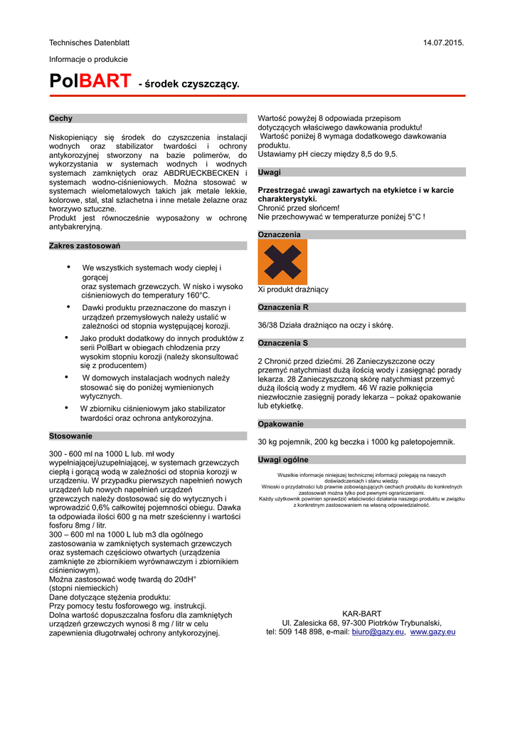 Technisches Datenblatt 14.07.2015. Informacje o produkcie PolBART - środek czyszczący. Cechy Niskopieniący się środek do czyszczenia instalacji wodnych oraz stabilizator twardości i ochrony antykorozyjnej stworzony na bazie polimerów, do wykorzystania w systemach wodnych i wodnych systemach zamkniętych oraz ABDRUECKBECKEN i systemach wodno-ciśnieniowych. Można stosować w systemach wielometalowych takich jak metale lekkie, kolorowe, stal, stal szlachetna i inne metale żelazne oraz tworzywo sztuczne. Produkt jest równocześnie wyposażony w ochronę antybakreryjną. Wartość powyżej 8 odpowiada przepisom dotyczących właściwego dawkowania produktu! Wartość poniżej 8 wymaga dodatkowego dawkowania produktu. Ustawiamy pH cieczy między 8,5 do 9,5. Uwagi Przestrzegać uwagi zawartych na etykietce i w karcie charakterystyki. Chronić przed słońcem! Nie przechowywać w temperaturze poniżej 5°C ! Oznaczenia Zakres zastosowań • • • We wszystkich systemach wody ciepłej i gorącej oraz systemach grzewczych. W nisko i wysoko ciśnieniowych do temperatury 160°C. Dawki produktu przeznaczone do maszyn i urządzeń przemysłowych należy ustalić w zależności od stopnia występującej korozji. Jako produkt dodatkowy do innych produktów z serii PolBart w obiegach chłodzenia przy wysokim stopniu korozji (należy skonsultować się z producentem) • W domowych instalacjach wodnych należy stosować się do poniżej wymienionych wytycznych. • W zbiorniku ciśnieniowym jako stabilizator twardości oraz ochrona antykorozyjna. Stosowanie 300 - 600 ml na 1000 L lub. mł wody wypełniającej/uzupełniającej, w systemach grzewczych ciepłą i gorącą wodą w zależności od stopnia korozji w urządzeniu. W przypadku pierwszych napełnień nowych urządzeń lub nowych napełnień urządzeń grzewczych należy dostosować się do wytycznych i wprowadzić 0,6% całkowitej pojemności obiegu. Dawka ta odpowiada ilości 600 g na metr sześcienny i wartości fosforu 8mg / litr. 300 – 600 ml na 1000 L lub m3 dla ogólnego zastosowania w zamkniętych systemach grzewczych oraz systemach częściowo otwartych (urządzenia zamknięte ze zbiornikiem wyrównawczym i zbiornikiem ciśnieniowym). Można zastosować wodę twardą do 20dH° (stopni niemieckich) Dane dotyczące stężenia produktu: Przy pomocy testu fosforowego wg. instrukcji. Dolna wartość dopuszczalna fosforu dla zamkniętych urządzeń grzewczych wynosi 8 mg / litr w celu zapewnienia długotrwałej ochrony antykorozyjnej. Xi produkt drażniący Oznaczenia R 36/38 Działa drażniąco na oczy i skórę. Oznaczenia S 2 Chronić przed dziećmi. 26 Zanieczyszczone oczy przemyć natychmiast dużą ilością wody i zasięgnąć porady lekarza. 28 Zanieczyszczoną skórę natychmiast przemyć dużą ilością wody z mydłem. 46 W razie połknięcia niezwłocznie zasięgnij porady lekarza – pokaż opakowanie lub etykietkę. Opakowanie 30 kg pojemnik, 200 kg beczka i 1000 kg paletopojemnik. Uwagi ogólne Wszelkie informacje niniejszej technicznej informacji polegają na naszych doświadczeniach i stanu wiedzy. Wnioski o przydatności lub prawnie zobowiązujących cechach produktu do konkretnych zastosowań można tylko pod pewnymi ograniczeniami. Każdy użytkownik powinien sprawdzić właściwości działania naszego produktu w związku z konkretnym zastosowaniem na własną odpowiedzialność. KAR-BART Ul. Zalesicka 68, 97-300 Piotrków Trybunalski, tel: 509 148 898, e-mail: [email protected], www.gazy.eu Technisches Datenblatt 14.07.2015. Informacje o produkcie PolBART - środek zabezpieczający, inhibitor korozji. Cechy Niskopieniący się stabilizator twardości i ochrony antykorozyjnej stworzony na bazie polimerów, do wykorzystania w systemach wodnych i wodnych systemach zamkniętych oraz ABDRUECKBECKEN i systemach wodno-ciśnieniowych. Można stosować w systemach wielometalowych takich jak metale lekkie, kolorowe, stal, stal szlachetna i inne metale żelazne oraz tworzywo sztuczne. Produkt jest równocześnie wyposażony w ochronę antybakreryjną. Zakres zastosowań Wartość powyżej 8 odpowiada przepisom dotyczących właściwego dawkowania produktu! Wartość poniżej 8 wymaga dodatkowego dawkowania produktu. Ustawiamy pH cieczy między 8,5 do 9,5. Uwagi Przestrzegać uwagi zawartych na etykietce i w karcie charakterystyki. Chronić przed słońcem! Nie przechowywać w temperaturze poniżej 5°C ! Oznaczenia • We wszystkich systemach wody ciepłej i gorącej oraz systemach grzewczych. W nisko i wysoko ciśnieniowych do temperatury 160°C. • Dawki produktu przeznaczone do maszyn i urządzeń przemysłowych należy ustalić w zależności od stopnia występującej korozji. Xi produkt drażniący • Jako produkt dodatkowy do innych produktów z serii PolBART w obiegach chłodzenia przy wysokim stopniu korozji (należy skonsultować się z producentem) 36/38 Działa drażniąco na oczy i skórę. • W domowych instalacjach wodnych należy stosować się do poniżej wymienionych wytycznych. • W zbiorniku ciśnieniowym jako stabilizator twardości oraz ochrona antykorozyjna. Stosowanie 1000 ml na 1000 L lub. mł wody wypełniającej/uzupełniającej, w systemach grzewczych ciepłą i gorącą wodą w zależności od stopnia korozji w urządzeniu. W przypadku pierwszych napełnień nowych urządzeń lub nowych napełnień urządzeń grzewczych należy dostosować się do wytycznych i wprowadzić 0,6% całkowitej pojemności obiegu. Dawka ta odpowiada ilości 600 g na metr sześcienny i wartości fosforu 8mg / litr. 600 – 1000 ml na 1000 L lub m3 dla ogólnego zastosowania w zamkniętych systemach grzewczych oraz systemach częściowo otwartych (urządzenia zamknięte ze zbiornikiem wyrównawczym i zbiornikiem ciśnieniowym). Można zastosować wodę twardą do 20dH° (stopni niemieckich) Dane dotyczące stężenia produktu: Przy pomocy testu fosforowego wg. instrukcji. Dolna wartość dopuszczalna fosforu dla 
