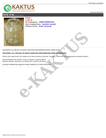 Informacje o produkcie Utworzono 08-03-2017 SŁÓJ 0,9L........... Cena : 1,35 zł AK TU S Nr katalogowy : 5906769992202 Stan magazynowy : bardzo wysoki Średnia ocena : brak recenzji SŁÓJ 900ML 0,9L SZKLANY NA OWOCE WARZYWA PRZETWÓRSTWO MIÓD CHOMIK SŁOIK SŁÓJ 900ML 0,9L SZKLANY NA OWOCE WARZYWA PRZETWÓRSTWO MIÓD CHOMIK SŁOIK Szklany słój o pojemności 0,9L nadaje się na różne przetwory owocowe, warzywne, miód oraz na przechowywanie produktów sypkich. Słój sprzedawany bez zakrętki, można je dokupić w osobnej ofercie. Wymiary zakrętki: zakręcana na 6 zębów (6Z) o średnicy (FI) 82mm eK WYGLĄD WYROBÓW NA ZDJĘCIACH MOŻE ODBIEGAĆ OD RZECZYWISTOŚCI Wygenerowano w programie www.oscGold.com