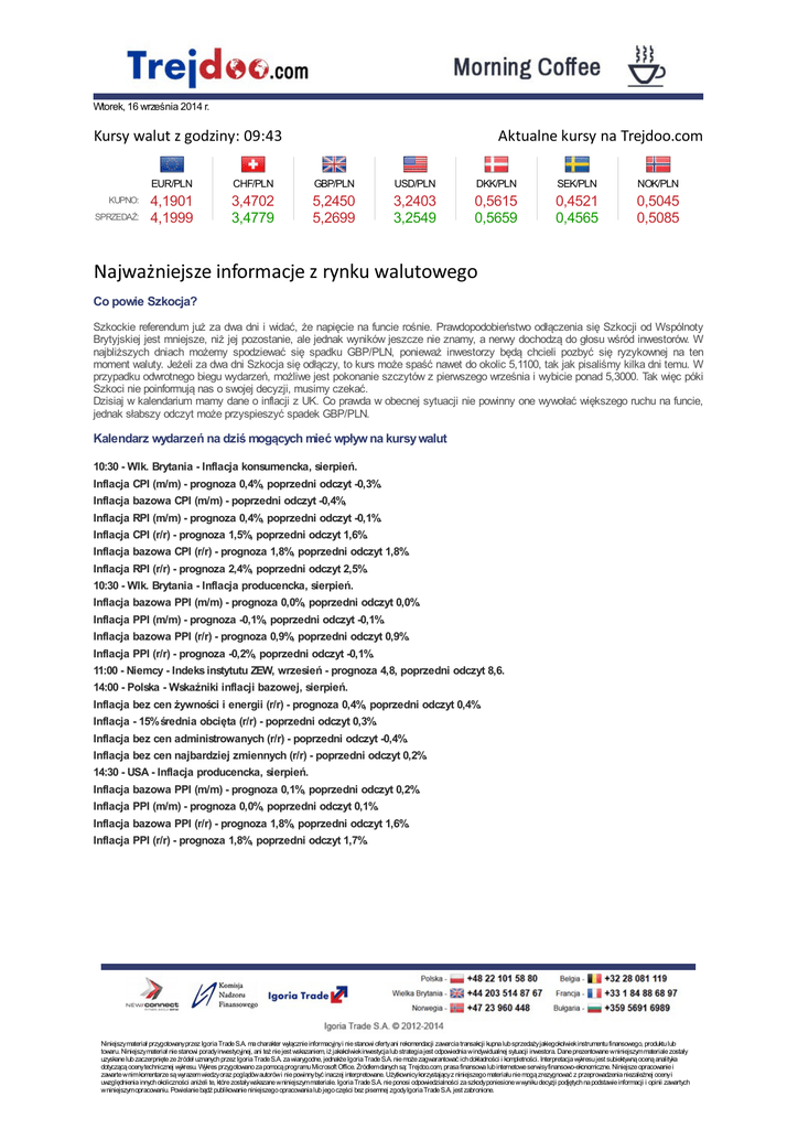 Wtorek, 16 września 2014 r. Kursy walut z godziny: 09:43 KUPNO: SPRZEDAŻ: Aktualne kursy na Trejdoo.com EUR/PLN CHF/PLN GBP/PLN USD/PLN DKK/PLN SEK/PLN NOK/PLN 4,1901 4,1999 3,4702 3,4779 5,2450 5,2699 3,2403 3,2549 0,5615 0,5659 0,4521 0,4565 0,5045 0,5085 Najważniejsze informacje z rynku walutowego Co powie Szkocja? Szkockie referendum już za dwa dni i widać, że napięcie na funcie rośnie. Prawdopodobieństwo odłączenia się Szkocji od Wspólnoty Brytyjskiej jest mniejsze, niż jej pozostanie, ale jednak wyników jeszcze nie znamy, a nerwy dochodzą do głosu wśród inwestorów. W najbliższych dniach możemy spodziewać się spadku GBP/PLN, ponieważ inwestorzy będą chcieli pozbyć się ryzykownej na ten moment waluty. Jeżeli za dwa dni Szkocja się odłączy, to kurs może spaść nawet do okolic 5,1100, tak jak pisaliśmy kilka dni temu. W przypadku odwrotnego biegu wydarzeń, możliwe jest pokonanie szczytów z pierwszego września i wybicie ponad 5,3000. Tak więc póki Szkoci nie poinformują nas o swojej decyzji, musimy czekać. Dzisiaj w kalendarium mamy dane o inflacji z UK. Co prawda w obecnej sytuacji nie powinny one wywołać większego ruchu na funcie, jednak słabszy odczyt może przyspieszyć spadek GBP/PLN. Kalendarz wydarzeń na dziś mogących mieć wpływ na kursy walut 10:30 - Wlk. Brytania - Inflacja konsumencka, sierpień. Inflacja CPI (m/m) - prognoza 0,4%, poprzedni odczyt -0,3%. Inflacja bazowa CPI (m/m) - poprzedni odczyt -0,4%, Inflacja RPI (m/m) - prognoza 0,4%, poprzedni odczyt -0,1%. Inflacja CPI (r/r) - prognoza 1,5%, poprzedni odczyt 1,6%. Inflacja bazowa CPI (r/r) - prognoza 1,8%, poprzedni odczyt 1,8%. Inflacja RPI (r/r) - prognoza 2,4%, poprzedni odczyt 2,5%. 10:30 - Wlk. Brytania - Inflacja producencka, sierpień. Inflacja bazowa PPI (m/m) - prognoza 0,0%, poprzedni odczyt 0,0%. Inflacja PPI (m/m) - prognoza -0,1%, poprzedni odczyt -0,1%. Inflacja bazowa PPI (r/r) - prognoza 0,9%, poprzedni odczyt 0,9%. Inflacja PPI (r/r) - prognoza -0,2%, poprzedni odczyt -0,1%. 11:00 - Niemcy - Indeks instytutu ZEW, wrzesień - prognoza 4,8, poprzedni odczyt 8,6. 14:00 - Polska - Wskaźniki inflacji bazowej, sierpień. Inflacja bez cen żywności i energii (r/r) - prognoza 0,4%, poprzedni odczyt 0,4%. Inflacja - 15% średnia obcięta (r/r) - poprzedni odczyt 0,3%. Inflacja bez cen administrowanych (r/r) - poprzedni odczyt -0,4%. Inflacja bez cen najbardziej zmiennych (r/r) - poprzedni odczyt 0,2%. 14:30 - USA - Inflacja producencka, sierpień. Inflacja bazowa PPI (m/m) - prognoza 0,1%, poprzedni odczyt 0,2%. Inflacja PPI (m/m) - prognoza 0,0%, poprzedni odczyt 0,1%. Inflacja bazowa PPI (r/r) - prognoza 1,8%, poprzedni odczyt 1,6%. Inflacja PPI (r/r) - prognoza 1,8%, poprzedni odczyt 1,7%. Niniejszy materiał przygotowany przez Igoria Trade S.A. ma charakter wyłącznie informacyjny i nie stanowi oferty ani rekomendacji zawarcia transakcji kupna lub sprzedaży jakiegokolwiek instrumentu finansowego, produktu lub towaru. Niniejszy materiał nie stanowi porady inwestycyjnej, ani też nie jest wskazaniem, iż jakakolwiek inwestycja lub strategia jest odpowiednia w indywidualnej sytuacji inwestora. Dane prezentowane w niniejszym materiale zostały uzyskane lub zaczerpnięte ze źródeł uznanych przez Igoria Trade S.A. za wiarygodne, jednakże Igoria Trade S.A. nie może zagwarantować ich dokładności i kompletności. Interpretacja wykresu jest subiektywną oceną analityka dotyczącą oceny technicznej wykresu. Wykres przygotowano za pomocą programu Microsoft Office. Źródłem danych są: Trejdoo.com, prasa finansowa lub internetowe serwisy finansowo-ekonomiczne. Niniejsze opracowanie i zawarte w nim komentarze są wyrazem wiedzy oraz poglądów autorów i nie powinny być inaczej interpretowane. Użytkownicy korzystający z niniejszego materiału nie mogą zrezygnować z przeprowadzenia niezależnej oceny i uwzględnienia innych okoliczności aniżeli te, które zostały wskazane w niniejszym materiale. Igoria Trade S.A. nie ponosi odpowiedzialności za szkody poniesione w wyniku decyzji podjętych na podstawie informacji i opinii zawartych w niniejszym opracowaniu. Powielanie bądź publikowanie niniejszego opracowania lub jego części bez pisemnej zgody Igoria Trade S.A. jest zabronione.