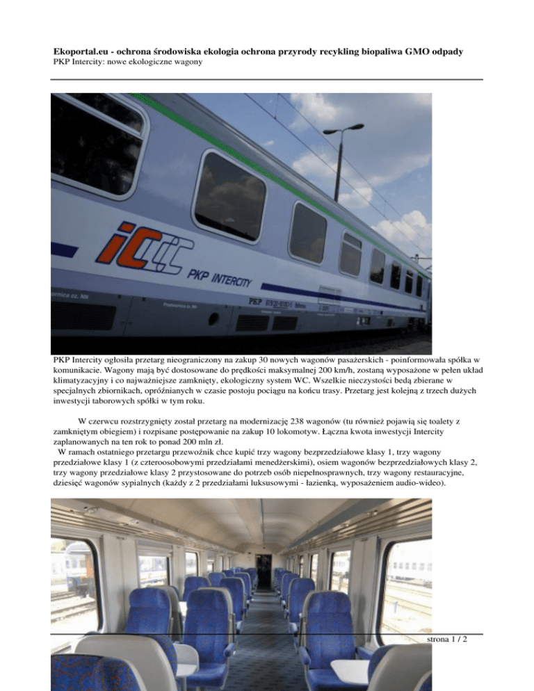 Ekoportal.eu - ochrona środowiska ekologia ochrona przyrody recykling biopaliwa GMO odpady PKP Intercity: nowe ekologiczne wagony PKP Intercity ogłosiła przetarg nieograniczony na zakup 30 nowych wagonów pasażerskich - poinformowała spółka w komunikacie. Wagony mają być dostosowane do prędkości maksymalnej 200 km/h, zostaną wyposażone w pełen układ klimatyzacyjny i co najważniejsze zamknięty, ekologiczny system WC. Wszelkie nieczystości bedą zbierane w specjalnych zbiornikach, opróźnianych w czasie postoju pociągu na końcu trasy. Przetarg jest kolejną z trzech dużych inwestycji taborowych spółki w tym roku. W czerwcu rozstrzygnięty został przetarg na modernizację 238 wagonów (tu również pojawią się toalety z zamkniętym obiegiem) i rozpisane postępowanie na zakup 10 lokomotyw. Łączna kwota inwestycji Intercity zaplanowanych na ten rok to ponad 200 mln zł. W ramach ostatniego przetargu przewoźnik chce kupić trzy wagony bezprzedziałowe klasy 1, trzy wagony przedziałowe klasy 1 (z czteroosobowymi przedziałami menedżerskimi), osiem wagonów bezprzedziałowych klasy 2, trzy wagony przedziałowe klasy 2 przystosowane do potrzeb osób niepełnosprawnych, trzy wagony restauracyjne, dziesięć wagonów sypialnych (każdy z 2 przedziałami luksusowymi - łazienką, wyposażeniem audio-wideo). strona 1 / 2 Ekoportal.eu - ochrona środowiska ekologia ochrona przyrody recykling biopaliwa GMO odpady PKP Intercity: nowe ekologiczne wagony Wagony sypialne, dzięki 2 kompletom wózków o zmiennym rozstawie kół, będą mogły poruszać się również po szerokim torze. Termin składania ofert upływa 31 października bieżącego roku. Podpisanie umowy w grudniu 2007 r. pozwoli na rozpoczęcie realizacji zamówienia w styczniu 2009 r. Źródło: PAP Fot. PKP Intercity strona 2 / 2