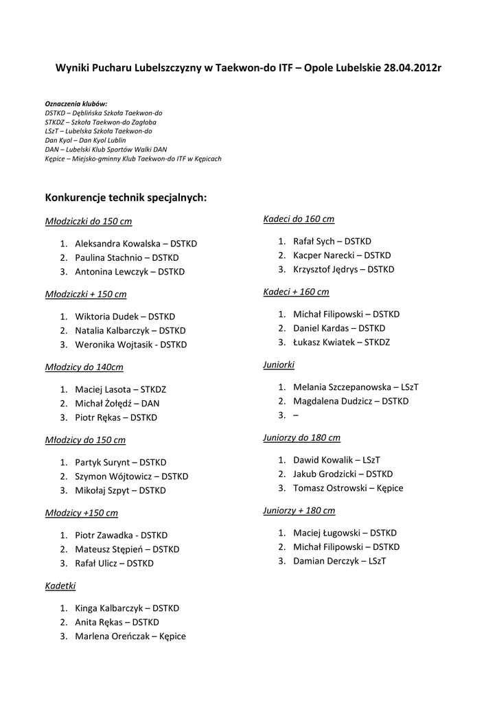 Wyniki Pucharu Lubelszczyzny w Taekwon-do ITF – Opole Lubelskie 28.04.2012r Oznaczenia klubów: DSTKD – Dęblińska Szkoła Taekwon-do STKDZ – Szkoła Taekwon-do Zagłoba LSzT – Lubelska Szkoła Taekwon-do Dan Kyol – Dan Kyol Lublin DAN – Lubelski Klub Sportów Walki DAN Kępice – Miejsko-gminny Klub Taekwon-do ITF w Kępicach Konkurencje technik specjalnych: Młodziczki do 150 cm 1. Aleksandra Kowalska – DSTKD 2. Paulina Stachnio – DSTKD 3. Antonina Lewczyk – DSTKD Młodziczki + 150 cm 1. Wiktoria Dudek – DSTKD 2. Natalia Kalbarczyk – DSTKD 3. Weronika Wojtasik - DSTKD Młodzicy do 140cm 1. Maciej Lasota – STKDZ 2. Michał Żołędź – DAN 3. Piotr Rękas – DSTKD Młodzicy do 150 cm 1. Partyk Surynt – DSTKD 2. Szymon Wójtowicz – DSTKD 3. Mikołaj Szpyt – DSTKD Młodzicy +150 cm 1. Piotr Zawadka - DSTKD 2. Mateusz Stępień – DSTKD 3. Rafał Ulicz – DSTKD Kadetki 1. Kinga Kalbarczyk – DSTKD 2. Anita Rękas – DSTKD 3. Marlena Oreńczak – Kępice Kadeci do 160 cm 1. Rafał Sych – DSTKD 2. Kacper Narecki – DSTKD 3. Krzysztof Jędrys – DSTKD Kadeci + 160 cm 1. Michał Filipowski – DSTKD 2. Daniel Kardas – DSTKD 3. Łukasz Kwiatek – STKDZ Juniorki 1. Melania Szczepanowska – LSzT 2. Magdalena Dudzicz – DSTKD 3. – Juniorzy do 180 cm 1. Dawid Kowalik – LSzT 2. Jakub Grodzicki – DSTKD 3. Tomasz Ostrowski – Kępice Juniorzy + 180 cm 1. Maciej Ługowski – DSTKD 2. Michał Filipowski – DSTKD 3. Damian Derczyk – LSzT Konkurencje układów formalnych: Młodziczki 1. Aleksandra Kowalska – DSTKD 2. Paulina Stachnio – DSTKD 3. Wiktoria Dudek – DSTKD Młodzicy do 8 cup 1. Patryk Surynt – DSTKD 2. Norbert Koper – LSzT 3. Paweł Kozak – STKDZ Młodzicy do 6 cup 1. Jakub Legieć – DAN 2. Jakub Bielecki – STKDZ 3. Błażej Gospodarek – Dan Kyol Młodzicy + 6 cup 1. Dominik Janiszek – DSTKD 2. Mikołaj Szpyt – DSTKD 3. Szymon Wójtowicz – DSTKD Kadetki 1. Ada Szczepanowska – LSzT 2. Marlena Oreńczak – Kępice 3. Kinga Kalbarczyk – DSTKD Kadeci do 7 cup 1. Jakub Samuś – DSTKD 2. Tycjan Sułkowski – Kępice 3. Paweł Stachnio – DSTKD Kadeci do 4 cup 1. Maciej Górniak – LSzT 2. Rafał Sych – DSTKD 3. Łukasz Kwiatek – STKDZ Kadeci + 4 cup 1. Krzysztof Jędrys DSTKD 2. Michał Filipowski – DSTKD 3. Daniel Kardas – DSTKD Juniorki 1. Melania Szczepanowska – LSzT 2. Magdalena Dudzicz – DSTKD 3. – Juniorzy do 5 cup 1. Dawid Kowalik – LSzT 2. Dawid Binder – Kępice 3. Jakub Grodzicki – DSTKD Juniorzy + 5 cup 1. Maciej Ługowski – DSTKD 2. Damian Derczyk – LSzT 3. Michał Filipowski – DSTKD Konkurencje walk: Młodzicy – touchkontakt do 140 cm 1. Michał Żołędź – DAN 2. Albert Podstawka – DAN 3. Krzysztof Kozieł – LSzT Młodzicy – touchkontakt + 140 cm 1. Piotr Zawadka – DSTKD 2. Mateusz Stępień – DSTKD 3. Jakub Legieć – DAN Kadeci do 51 kg 1. Krzysztof Jędrys – DSTKD 2. Kacper Narecki – DSTKD 3. Adam Kozyra – LSzT Kadeci do 69 kg 1. Michał Filipowski – DSTKD 2. Łukasz Kwiatek – STKDZ 3. Daniel Kardas – DSTKD Juniorzy do 57 kg 1. Dawid Kowalik – LSzT 2. Paweł Oreńczak – Kępice 3. – Juniorzy do 69 kg 1. Tomasz Ostrowski – Kępice 2. Michał Filipowski – DSTKD 3. Dawid Binder – Kepice Juniorzy do 78 kg 1. Maciej Ługowski – DSTKD 2. Konrad Nowakowski – Dan Kyol 3. Damian Derczyk – LSzT Najlepsza zawodniczka turnieju: Aleksandra Kowalska – DSTKD Najlepszy zawodnik turnieju: Maciej Ługowski – DSTKD Najlepszy Klub: Dęblińska Szkoła Taekwon-do UWAGA! W przypadku identycznej zdobyczy medalowej u 2 zawodników o tytule najlepszego zawodnika i zawodniczki decydowała ilość zawodników do pokonania w kategoriach, w których te medale były zdobywane.