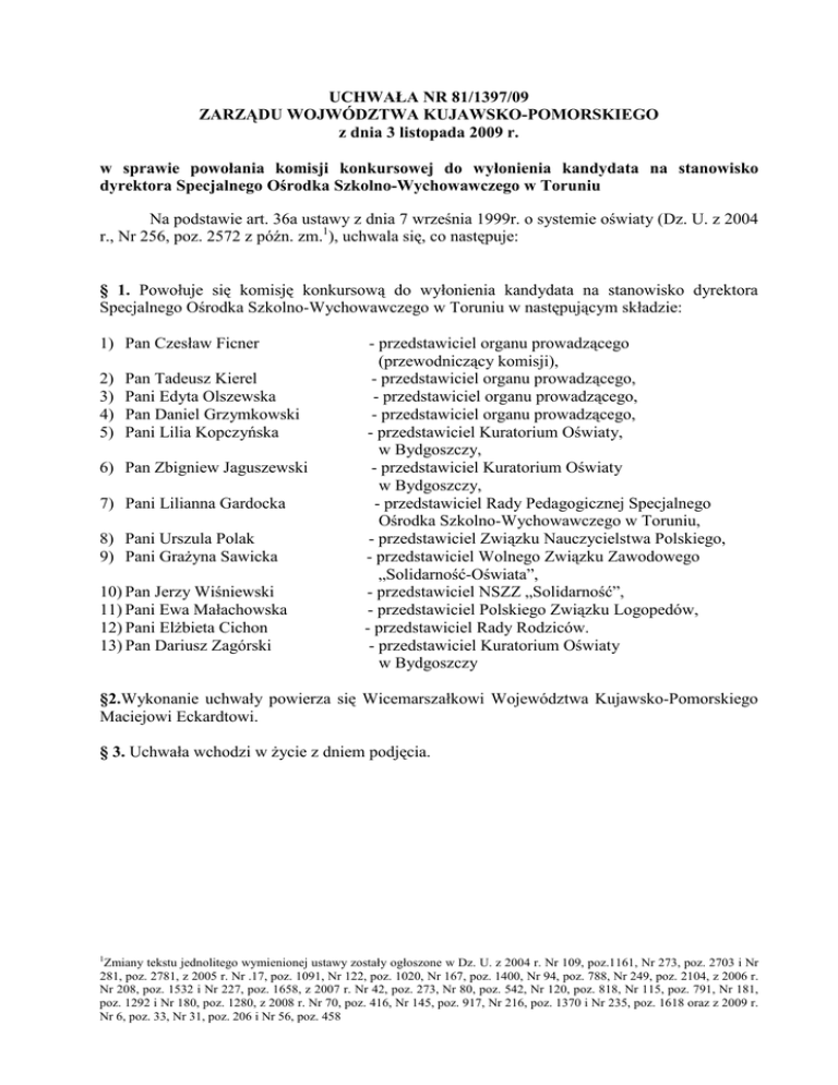 UCHWAŁA NR 81/1397/09 ZARZĄDU WOJWÓDZTWA KUJAWSKO-POMORSKIEGO z dnia 3 listopada 2009 r. w sprawie powołania komisji konkursowej do wyłonienia kandydata na stanowisko dyrektora Specjalnego Ośrodka Szkolno-Wychowawczego w Toruniu Na podstawie art. 36a ustawy z dnia 7 września 1999r. o systemie oświaty (Dz. U. z 2004 r., Nr 256, poz. 2572 z późn. zm.1), uchwala się, co następuje: § 1. Powołuje się komisję konkursową do wyłonienia kandydata na stanowisko dyrektora Specjalnego Ośrodka Szkolno-Wychowawczego w Toruniu w następującym składzie: 1) Pan Czesław Ficner 2) 3) 4) 5) Pan Tadeusz Kierel Pani Edyta Olszewska Pan Daniel Grzymkowski Pani Lilia Kopczyńska 6) Pan Zbigniew Jaguszewski 7) Pani Lilianna Gardocka 8) Pani Urszula Polak 9) Pani GraŜyna Sawicka 10) Pan Jerzy Wiśniewski 11) Pani Ewa Małachowska 12) Pani ElŜbieta Cichon 13) Pan Dariusz Zagórski - przedstawiciel organu prowadzącego (przewodniczący komisji), - przedstawiciel organu prowadzącego, - przedstawiciel organu prowadzącego, - przedstawiciel organu prowadzącego, - przedstawiciel Kuratorium Oświaty, w Bydgoszczy, - przedstawiciel Kuratorium Oświaty w Bydgoszczy, - przedstawiciel Rady Pedagogicznej Specjalnego Ośrodka Szkolno-Wychowawczego w Toruniu, - przedstawiciel Związku Nauczycielstwa Polskiego, - przedstawiciel Wolnego Związku Zawodowego „Solidarność-Oświata”, - przedstawiciel NSZZ „Solidarność”, - przedstawiciel Polskiego Związku Logopedów, - przedstawiciel Rady Rodziców. - przedstawiciel Kuratorium Oświaty w Bydgoszczy §2.Wykonanie uchwały powierza się Wicemarszałkowi Województwa Kujawsko-Pomorskiego Maciejowi Eckardtowi. § 3. Uchwała wchodzi w Ŝycie z dniem podjęcia. 1 Zmiany tekstu jednolitego wymienionej ustawy zostały ogłoszone w Dz. U. z 2004 r. Nr 109, poz.1161, Nr 273, poz. 2703 i Nr 281, poz. 2781, z 2005 r. Nr .17, poz. 1091, Nr 122, poz. 1020, Nr 167, poz. 1400, Nr 94, poz. 788, Nr 249, poz. 2104, z 2006 r. Nr 208, poz. 1532 i Nr 227, poz. 1658, z 2007 r. Nr 42, poz. 273, Nr 80, poz. 542, Nr 120, poz. 818, Nr 115, poz. 791, Nr 181, poz. 1292 i Nr 180, poz. 1280, z 2008 r. Nr 70, poz. 416, Nr 145, poz. 917, Nr 216, poz. 1370 i Nr 235, poz. 1618 oraz z 2009 r. Nr 6, poz. 33, Nr 31, poz. 206 i Nr 56, poz. 458