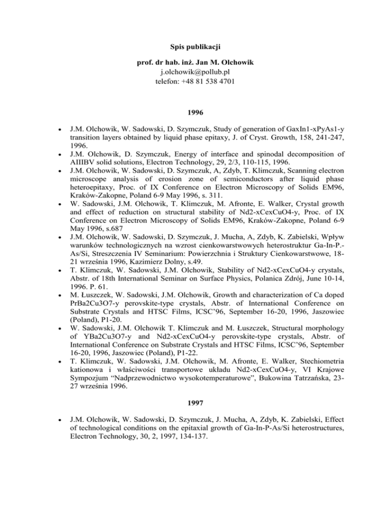 Spis publikacji prof. dr hab. inż. Jan M. Olchowik [email protected] telefon: +48 81 538 4701 1996 J.M. Olchowik, W. Sadowski, D. Szymczuk, Study of generation of GaxIn1-xPyAs1-y transition layers obtained by liquid phase epitaxy, J. of Cryst. Growth, 158, 241-247, 1996. J.M. Olchowik, D. Szymczuk, Energy of interface and spinodal decomposition of AIIIBV solid solutions, Electron Technology, 29, 2/3, 110-115, 1996. J.M. Olchowik, W. Sadowski, D. Szymczuk, A, Zdyb, T. Klimczuk, Scanning electron microscope analysis of erosion zone of semiconductors after liquid phase heteroepitaxy, Proc. of IX Conference on Electron Microscopy of Solids EM96, Kraków-Zakopne, Poland 6-9 May 1996, s. 311. W. Sadowski, J.M. Olchowik, T. Klimczuk, M. Afronte, E. Walker, Crystal growth and effect of reduction on structural stability of Nd2-xCexCuO4-y, Proc. of IX Conference on Electron Microscopy of Solids EM96, Kraków-Zakopne, Poland 6-9 May 1996, s.687 J.M. Olchowik, W. Sadowski, D. Szymczuk, J. Mucha, A, Zdyb, K. Zabielski, Wpływ warunków technologicznych na wzrost cienkowarstwowych heterostruktur Ga-In-P.As/Si, Streszczenia IV Seminarium: Powierzchnia i Struktury Cienkowarstwowe, 1821 września 1996, Kazimierz Dolny, s.49. T. Klimczuk, W. Sadowski, J.M. Olchowik, Stability of Nd2-xCexCuO4-y crystals, Abstr. of 18th International Seminar on Surface Physics, Polanica Zdrój, June 10-14, 1996. P. 61. M. Łuszczek, W. Sadowski, J.M. Olchowik, Growth and characterization of Ca doped PrBa2Cu3O7-y perovskite-type crystals, Abstr. of International Conference on Substrate Crystals and HTSC Films, ICSC’96, September 16-20, 1996, Jaszowiec (Poland), P1-20. W. Sadowski, J.M. Olchowik T. Klimczuk and M. Łuszczek, Structural morphology of YBa2Cu3O7-y and Nd2-xCexCuO4-y perovskite-type crystals, Abstr. of International Conference on Substrate Crystals and HTSC Films, ICSC’96, September 16-20, 1996, Jaszowiec (Poland), P1-22. T. Klimczuk, W. Sadowski, J.M. Olchowik, M. Afronte, E. Walker, Stechiometria kationowa i właściwości transportowe układu Nd2-xCexCuO4-y, VI Krajowe Sympozjum “Nadprzewodnictwo wysokotemperaturowe”, Bukowina Tatrzańska, 2327 września 1996. 1997 J.M. Olchowik, W. Sadowski, D. Szymczuk, J. Mucha, A, Zdyb, K. Zabielski, Effect of technological conditions on the epitaxial growth of Ga-In-P-As/Si heterostructures, Electron Technology, 30, 2, 1997, 134-137. M. Łuszczek, W. Sadowski, T. Klimczuk, J.M. Olchowik, B. Susła, R. Czajka, Traces of superconductivity in PrBa2Cu3O7-d system, Molecular Physics Reports 20 (1997) 213-215. M. Łuszczek, W. Sadowski, T. Klimczuk, J.M. Olchowik, B. Susła, R. Czajka, Traces of superconductivity in PrBa2Cu3O7-d system, Molecular Physics Reports 20 (1997) 213-215. J.M. Olchowik, A. Zdyb, W. Sadowski, D. Szymczuk, J. Mucha, K. Zabielski, M. Mucha, Analiza energii międzypowierzchni w strukturach GaInPAs/Si na etapie krystalizacji z fazy ciekłej – Abstr. VI seminarium “ Powierzchnia i struktury cienkowarstwowe”, Ustroń 15-18 września 1997. J.M. Olchowik, W. Sadowski, D. Szymczuk, J. Mucha, A. Zdyb, K.Zabielski, Study on nonequilibrium epitaxial growth of the Ga-In-P-As/Si heterostructures, Proceedings of the 14th European Photovoltaic Solar Energy Conference, 30 June 4 July 1997, Barcelona (Spain), p. 1748-1751. 1998 J.M. Olchowik, D. Szymczuk, W. Sadowski, J. Mucha, A. Zdyb, K. Zabielski, The Influence of the Substrate Orientation on the Modulation of Interface in AIIIBV/Si Heterostructure during Liquid Phase Epitaxy, Molecular Physics Reports 21 (1998) 109-112. J.M. Olchowik, A. Zdyb, D. Szymczuk, J. Mucha, K. Zabielski, W. Sadowski, M. Mucha, Analysis of the interface energy in GaInPAs/Si structures during liquid phase epitaxy, Electron Technology, 31 (1998) 354-357. J.M. Olchowik, A. Zdyb, W. Sadowski, D. Szymczuk, J. Mucha, K. Zabielski, M. Mucha, Role of atoms layout on the Si surface on character of coupling of GaInPAs/Si heterostructure during LPE, Proceedings of the 2nd World Photovoltaic Solar Energy Conference, 6 – 10 July 1998, Vienna (Austria), p. 144-147. J.M. Olchowik, A. Zdyb, D. Szymczuk, W. Sadowski, J. Mucha, K. Zabielski, M. Mucha, Analysis of coupling of GaInPAs and Si heterostructures, Abstracts of V Polish Conference on Crystal Growth, 10-13 May, 1998 (Nałęczów), P.II.01. 1999 T. Klimczuk, W. Sadowski, J.M. Olchowik, E. Walker, Crystal growth and the influence of oxygen stoichiometry on electrical resistivity of Nd2-xCexCuO4-y single crystals, Supercond. Sci. Technol., 12 (1999) 199-202. M. Łuszczek, W. Sadowski, T. Klimczuk, J.M. Olchowik, B. Susła, R. Czajka, Superconductivity in PrBa2Cu3O7-d single crystals after high-temperature thermal treatment, Physica C 322(1999) 57-64. J.M. Olchowik, A. Zdyb, D. Szymczuk, W. Sadowski, J. Mucha, K. Zabielski, M. Mucha, The coupling energy of GaAs/Si heterostructures, in "Intermolecular Interaction in Matter", ed. by K. Sangwal, E. Jartych, W. Polak, Politechnika Lubelska 1999, Lublin (Poland), s.101-107. J.M. Olchowik, A. Fave, B. Semmache, A. Laugier, A. Kaminski, W. Sadowski, Effect of orientation of the si surface on morphology of the laterally overgrown thin layers by means of LPE, in "Intermolecular Interaction in Matter", ed. by K. Sangwal, E. Jartych, W. Polak, Politechnika Lubelska 1999, Lublin (Poland), s.87-92. A. Fave, B. Semmache, J.M. Olchowik, A. Laugier, F. Mazel, G. Fantozzi, s. Bourdais, A. Slaoui, Silicon thin film formation by liquid phase epitaxy on mullite substrates with RT-CVD polysilicon seed layer, Proceedings of the 11th International Photovoltaic Science and Engineering Conference (PVSEC-11), Sept. 20-24 (1999) , Royton Sapporo, Hokkaido, Japan, U-17. A. Fave, B. Semmache, J.M. Olchowik, P. Kleiman, A. Laugier, Liquid phase epitaxial Silicon layer with Pyramidal Structure obtained on an etched silicon grid, Proceedings of the 11th International Photovoltaic Science and Engineering Conference (PVSEC-11), Sept. 20-24 (1999) , Royton Sapporo, Hokkaido