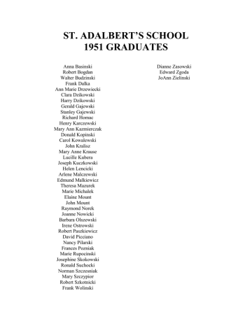 ST. ADALBERT’S SCHOOL 1951 GRADUATES Anna Basinski Robert Bogdan Walter Budzinski Frank Dalka Ann Marie Drzewiecki Clara Dzikowski Harry Dzikowski Gerald Gajewski Stanley Gajewski Richard Homac Henry Karczewski Mary Ann Kazmierczak Donald Kopinski Carol Kowalewski John Kralisz Mary Anne Krause Lucille Kubera Joseph Kuczkowski Helen Lencicki Arlene Malczewski Edmund Malkiewicz Theresa Mazurek Marie Michalek Elaine Mount John Mount Raymond Norek Joanne Nowicki Barbara Olszewski Irene Ostrowski Robert Paszkiewicz David Picciano Nancy Pilarski Frances Pozniak Marie Rupocinski Josephine Skokowski Ronald Suchocki Norman Szczesniak Mary Szczypior Robert Szkotnicki Frank Wolinski Dianne Zasowski Edward Zgoda JoAnn Zielinski