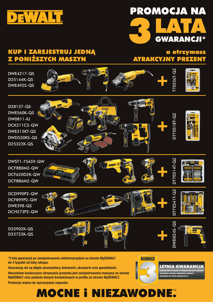 PROMOCJA NA GWARANCJI* a otrzymasz ATRAKCYJNY PREZENT + DWE4217-QS D25144K-QS DWE492S-QS T70536T-QZ KUP I ZAREJESTRUJ JEDNĄ Z PONIŻSZYCH MASZYN 3 LATA DWE560K-QS DW0811-XJ DCK211C2-QW DWE315KT-QS DWD530KS-QS + DT70518T-QZ D28137-QS DCF886M2-QW + DCD990P2-QW DCF899P2-QW DWE398-QS DCH273P2-QW + DT70541T-QZ + DWD024S-QS DWST1-75659-QW DT70514T-QZ D25323K-QS DCF880M2-QW DCF620D2K-QW D25902K-QS D25723K-QS *3 lata gwarancji po zarejestrowaniu elektronarzędzia na stronie MyDEWALT do 4 tygodni od daty zakupu. Gwarancją nie są objęte akumulatory, ładowarki, akcesoria oraz gwoździarki. Warunkiem koniecznym otrzymania prezentu jest zarejestrowanie maszyny na stronie MyDEWALT oraz podanie danych kontaktowych w profilu na stronie MyDEWALT. Promocja ważna do wyczerpania zapasów. MOCNE i NIEZAWODNE.™