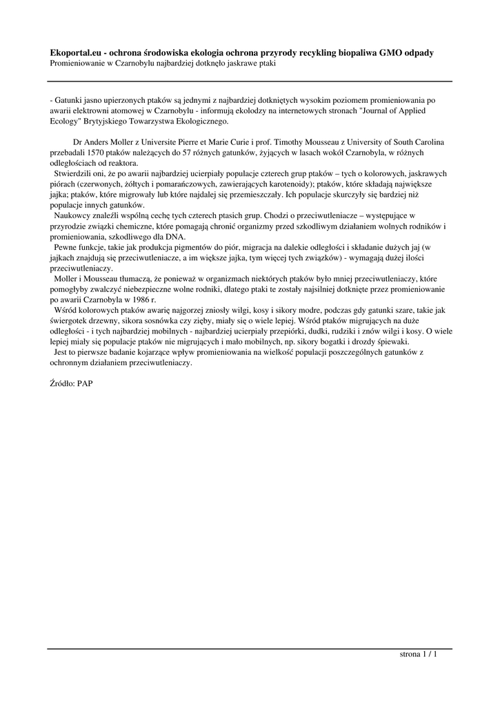 Ekoportal.eu - ochrona środowiska ekologia ochrona przyrody recykling biopaliwa GMO odpady Promieniowanie w Czarnobylu najbardziej dotknęło jaskrawe ptaki - Gatunki jasno upierzonych ptaków są jednymi z najbardziej dotkniętych wysokim poziomem promieniowania po awarii elektrowni atomowej w Czarnobylu - informują ekolodzy na internetowych stronach "Journal of Applied Ecology" Brytyjskiego Towarzystwa Ekologicznego. Dr Anders Moller z Universite Pierre et Marie Curie i prof. Timothy Mousseau z University of South Carolina przebadali 1570 ptaków należących do 57 różnych gatunków, żyjących w lasach wokół Czarnobyla, w różnych odległościach od reaktora. Stwierdzili oni, że po awarii najbardziej ucierpiały populacje czterech grup ptaków – tych o kolorowych, jaskrawych piórach (czerwonych, żółtych i pomarańczowych, zawierających karotenoidy); ptaków, które składają największe jajka; ptaków, które migrowały lub które najdalej się przemieszczały. Ich populacje skurczyły się bardziej niż populacje innych gatunków. Naukowcy znaleźli wspólną cechę tych czterech ptasich grup. Chodzi o przeciwutleniacze – występujące w przyrodzie związki chemiczne, które pomagają chronić organizmy przed szkodliwym działaniem wolnych rodników i promieniowania, szkodliwego dla DNA. Pewne funkcje, takie jak produkcja pigmentów do piór, migracja na dalekie odległości i składanie dużych jaj (w jajkach znajdują się przeciwutleniacze, a im większe jajka, tym więcej tych związków) - wymagają dużej ilości przeciwutleniaczy. Moller i Mousseau tłumaczą, że ponieważ w organizmach niektórych ptaków było mniej przeciwutleniaczy, które pomogłyby zwalczyć niebezpieczne wolne rodniki, dlatego ptaki te zostały najsilniej dotknięte przez promieniowanie po awarii Czarnobyla w 1986 r. Wśród kolorowych ptaków awarię najgorzej zniosły wilgi, kosy i sikory modre, podczas gdy gatunki szare, takie jak świergotek drzewny, sikora sosnówka czy zięby, miały się o wiele lepiej. Wśród ptaków migrujących na duże odległości - i tych najbardziej mobilnych - najbardziej ucierpiały przepiórki, dudki, rudziki i znów wilgi i kosy. O wiele lepiej miały się populacje ptaków nie migrujących i mało mobilnych, np. sikory bogatki i drozdy śpiewaki. Jest to pierwsze badanie kojarzące wpływ promieniowania na wielkość populacji poszczególnych gatunków z ochronnym działaniem przeciwutleniaczy. Źródło: PAP strona 1 / 1