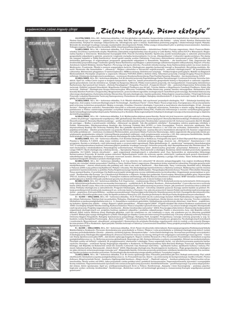 wydawnictwo zielone brygady oferuje ,,Zielone Brygady. Pismo ekologów” 11(179)/2002, 64 s. A5 + kolorowa ok³adka, 1 z³: Gry globalne czy lokalne; Gospodarka rynkowa bez kapitalizmu; Gie³dowy rezonans; Mo¿na inaczej ¿yæ i pracowaæ – gdzieœ ju¿ to robi¹; Rok 501; Warsztat gry na bêbnach dla kobiet – rytmy ziemi; Kontra; Ekonomia bez ekonomisty; Artyku³ nt naszego od¿ywiania siê. Ideologiczny spór o miêso; Szaleñstwa jesiennej pogody i eksterminacja topoli; Masala; Wnioski do strategii trwa³ego rozwoju (sustainable development) Polski; Kilka uwag o stosunkach p³ci w póŸnej nowoczesnoœci; Autobus; Trilogia vegana; Stop the police brutality 2002; Zmar³ pacyfistyczny jezuita. 1(181)/2003, 40 s. A4 + kolorowa ok³adka, 5 z³: Puszcza Bia³owieska – dziedzictwo Polski i Europy zagro¿one; Alert: Puszcza Bia³owieska; Gruntowy wymiennik ciep³a; Manifesta; Zatrudniê wegetariankê(-ina) do pracy w Cafe Barku; Nowy adres IUCN w Warszawie; Regionalna Epoka w Internecie; Wolontariat Europejski EVS; Powrót Zwrotnej Butelki; Spo³eczny punkt konsultacyjny w zakresie planowania gospodarki odpadami w gminie, powiecie i regionie (zwi¹zku komunalnym); Co to s¹ ,,Ekospotkania”; Cz³owiek i spo³eczeñstwo; Nie damy siê zasypaæ kopalni w Ma³ej Kamienicy!; Izrael grabi zasoby wodne Palestyny; Francuscy dziennikarze zatrzymani przez FSB za odkrycie œmietnika j¹drowego; O regionalnym programie gospodarki odpadami w Koszalinie; Kopalnie – z³o konieczne?; ¯ak; Zagro¿enia dla œrodowiska przyrodniczego i ludnoœci gminy Stara Kamienica wynikaj¹ce z planowanego za³o¿enia kopalni odkrywkowej; Raport z Pucka; Anio³owie Izabeli Bilskiej; Aniela Majcher: Pierwszy rok ¿ycia dziecka. Poradnik m³odej mamy; Anny Kalinowskiej wybór na nowe stulecie; Wêdrowiec; Frustracja. M³odzi o nowym wspania³ym œwiecie; Ekologiczne aspekty konwersji energii w Koszalinie; Recykling osobisty; Absurd; Memento dla samolubów i ,,olewaczy”; Miejsce cz³owieka w hierarchii wspó³czesnych ,,wartoœci ekologicznych”; W poszukiwaniu cz³owieka; Wielmo¿ne plugastwo; O samorz¹dnoœci; ABWera straszy; Dzielnicowi wizytuj¹ – Polska krajem policyjnym; Wabiki na Bagnach Biebrzañskich; Pieni¹dze utopione w zaporach; Obszary NATURA 2000 w dolinie Odry; Adwokaci przyrody z ksiêgi drugiej; Powycieczkowe refleksje; Edukacja ekologiczna to podstawa – rozmowa z Krystyn¹ Bonenberg; Plan Puebla Panama; Ekwador – bez komentarza. 5 PLN 2(182)/2003, 40 s. A4 + kolorowa ok³adka, 5 z³: W obronie przyrody Popradzkiego Parku Narodowego!; Centrum Ochrony Terenów Górskich; Apel ws. wilka Canis Lupus w krajach karpackich; Apel ws. zasad prowadzenia gospodarki leœnej w Karpatach w zakresie zapobiegania powodziom; List do ministra ws. kolejki na Kasprowy Wierch; Pilsko rezerwatem przyrody, nie lunaparkiem!; Uszanujmy dziedzictwo Karkonoszy; ¯yj i pozwól ¿yæ innym; ,,Zielony Paradygmat”; Empatia; Powróci³ ,,Przyjaciel Ziemi”; Ido – potomek Esperanta; Schroniska dla zwierz¹t; Dzikimi rzekami litewskimi; Wspólnota Fundacji Findhorn ma 40 lat!; Trochê faktów o Wspólnocie Fundacji Findhorn; Hotel dla zwierz¹t ,,Dalmat”; Ekologiczna Grupa Interwencyjna; Wieczna Treblinka; Feliks Koneczny, postaæ bardzo niewygodna; Aleksandra Zió³kowska-Boehm Podró¿e z moj¹ kotk¹; Wegetarianom, przeciwnikom ogrodów zoologicznych i kotofilom pod rozwagê; Kontekst historyczny obecnego ekologizmu; Zwierzêta mówi¹; Hierarchia; Szczyty ekologiczne, bardzo pobo¿ne; Pokochajcie czwart¹ w³adzê; 75 lat Ligi Ochrony Przyrody; Lokalna Ekonomia Twórczej Samopomocy; Pozwolono im zabijaæ; Ratujmy niedŸwiedzie!!!; Z ¿ycia zwierz¹t i ludzi; W obliczu zag³ady; Co zrobiæ z bobrami. 3(183)/2003, 40 s. A4 + kolorowa ok³adka, 5 z³: M³odzi ekolodzy; Jak wychowaæ przysz³ych ekologów; NLP – Edukacja bardziej ekologiczna; Jest wojna; Centrum Ekologicznych Technologii ,,Sunflower Farm”; Chris Maser Nowa wizja lasu; Europejczycy chc¹ wiêcej lasów pod ochron¹; Leœnictwo przysz³oœci; Wojny o energiê; Urzêdas; Chemia i ekologia; Czym jest w swej istocie eko-kosmologia; 10 lat ,,Innego œwiata”; Ekologiczne wartoœci; Nowatorskie kierunki w ochronie przyrody a m¹droœæ staro¿ytna; Jesteœmy w stanie wojny; Wszystkie lasy pañstwowe w Polsce zamierzaj¹ posiadaæ certyfikat dobrej gospodarki leœnej FSC; Publiczna informacja o ocenie certyfikacyjnej gospodarki leœnej Regionalnej Dyrekcji Lasów Pañstwowych w Kroœnie; Rola regionalnych i lokalnych strategii rozwoju zrównowa¿onego w d¹¿eniu do Unii Europejskiej. 4(184)/2003, 40 s. A4 + kolorowa ok³adka, 5 z³: Wyt³aczarka olejowa pana Karola; Œwiat nie jest towarem czyli jak walczyæ o Ziemiê; ,,Jedno do jednego” zaprasza do wspó³pracy; ABC globalizacji; Eko-filozofia w koncepcji prof. Henryka Skolimowskiego; Podstawy koncepcji filozoficznej prof. Henryka Skolimowskiego – próby okreœlenia osobowoœci; Œrodowisko i poszerzenie UE: fortuna i wyzwanie dla UE; Wsi¹œæ do poci¹gu...; Walka o przetrwanie rolników; ,,G³osowaæ na jakoœæ. Tak dla polskich rolników”; Europejscy rolnicy popieraj¹ rolników z Polski; Stanowisko: Miêdzynarodowa Koalicja dla Ochrony Polskiej Wsi (ICPPC) a Unia Europejska; Trzecie doroczne spotkanie Miêdzynarodowej Koalicji dla Ochrony Polskiej Wsi; Bez jaskó³ki dymówki (Hirundo Rustica L.) do Unii nie wchodzê; Zmienianie Unii Europejskiej od œrodka – b³êdne przekonanie czy prawda; Rolnictwo ekologiczne szansa dla wsi w kontekœcie akcesji do UE; Szanse i zagro¿enia nie tylko polskiej wsi – rozmowa z Les³awem Michnowskim, prezesem Klubu Twórców Ekorozwoju; Jakie zagro¿enie dla przyrody niesie powiêkszanie gospodarstw rolnych i intensyfikacja produkcji roœlinnej, czyli przyjmowanie wzorców z UE; Kto zatrzyma Smithfielda; Smithfield atakuje; Urlop u ekorolników; W Londynie mieszkaj¹ nie tylko Polacy; Refleksje w obliczu kapitaklizmu. 5(185)/2003, 40 s. A4 + kolor