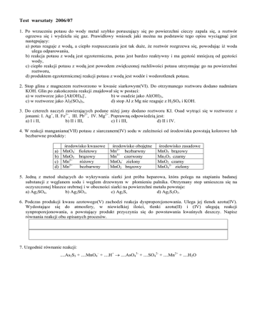 Test warsztaty 2006/07 1. Po wrzuceniu potasu do wody metal szybko poruszający się po powierzchni cieczy zapala się, a roztwór ogrzewa się i wydziela się gaz. Prawidłowy wniosek jaki można na podstawie tego opisu wyciągnąć jest następujący: a) potas reaguje z wodą, a ciepło rozpuszczania jest tak duże, że roztwór rozgrzewa się, powodując iż woda ulega odparowaniu, b) reakcja potasu z wodą jest egzotermiczna, potas jest bardzo reaktywny i ma gęstość mniejszą od gęstości wody, c) ciepło reakcji potasu z wodą jest powodem zwiększonej ruchliwości potasu utrzymując go na powierzchni roztworu, d) produktem egzotermicznej reakcji potasu z wodą jest wodór i wodorotlenek potasu. 2. Stop glinu z magnezem roztworzono w kwasie siarkowym(VI). Do otrzymanego roztworu dodano nadmiaru KOH. Glin po zakończeniu reakcji znajdował się w postaci: a) w roztworze jako [Al(OH)4]-, b) w osadzie jako Al(OH)3, c) w roztworze jako Al2(SO4)3, d) stop Al z Mg nie reaguje z H2SO4 i KOH. 3. Do czterech naczyń zawierających podane niżej jony dodano roztworu KI. Osad wytrąci się w roztworze z jonami: I. Ag+, II. Fe3+, III. Pb2+, IV. Mg2+. Poprawną odpowiedzią jest: a) I i II, b) II i III, c) I i III, d) II i IV. 4. W reakcji manganianu(VII) potasu z siarczanem(IV) sodu w zależności od środowiska powstają kolorowe lub bezbarwne produkty: a) b) c) d) środowisko kwasowe MnO4- fioletowy MnO2 brązowy Mn2+ różowy Mn2+ bezbarwny środowisko obojętne Mn2+ bezbarwny Mn3+ czerwony MnO4- zielony MnO2 brązowy środowisko zasadowe MnO2 brązowy Mn2O3 czarny MnO2 czarny MnO42- zielony 5. Jedną z metod służących do wykrywania siarki jest próba heparowa, która polega na stapianiu badanej substancji z węglanem sodu i węglem drzewnym w płomieniu palnika. Otrzymany stop umieszcza się na oczyszczonej blaszce srebrnej i w obecności siarki na powierzchni metalu powstaje: a) Ag2SO4, b) Ag2SO3, c) Ag2S, d) Ag2S2O3. 6. Podczas produkcji kwasu azotowego(V) zachodzi reakcja dysproporcjonowania. Ulega jej tlenek azotu(IV). Wydostające się do atmosfery, w niewielkiej ilości, tlenki azotu(II) i (IV) ulegają reakcji synproporcjonowania, a powstający produkt przyczynia się do powstawania kwaśnych deszczy. Napisz równania reakcji obu opisanych procesów. 7. Uzgodnić równanie reakcji: ....As2S3 + ....MnO4– + ....H+ → ....AsO43- + ....SO42- + ....Mn2+ + ....H2O 8. Na podstawie energii wiązań oblicz entalpię reakcji: C2H4(g) + Cl2(g) → CH2Cl-CH2Cl(g) energia wiązania podano w kJ/mol: C=C 612; C – C 347; C–H 415; C – Cl 335, oraz energia atomizacji Cl2 → 2 Cl 242 9. Stała Kc równowagi reakcji: CO(g) + H2O(g) ↔ CO2(g) + H2(g) w temperaturze 1100K jest równa jedności. 1 dm3 mieszaniny wyjściowej, w której znajdowały się 3 mole CO i 6 moli H2O ogrzano w zamkniętym naczyniu do temperatury 1100K. Oblicz liczby moli składników układu w stanie równowagi. 10. 30 gramów jednoprotonowego kwasu, którego masa molowa wynosi 60 g/mol, rozcieńczono wodą do objętości 1 dm3. W otrzymanym roztworze znajduje się 1.8·1021 jonów wodorowych. Oblicz stopień i stałą dysocjacji tego kwasu. 11. Jony przedstawione za pomocą wzorów: NH4+, Na+, H+, Cl-, CH3COO-, OH- mogą ze sobą utworzyć kilka różnych połączeń. Określ, które spośród tak otrzymanych związków, nie będą miały w roztworze wodnym odczynu obojętnego. Podaj ich wzory i nazwę procesu decydującego o danym odczynie. 12. Zestalony amoniak w postaci krystalicznej ma gęstość 0,838 g cm-3. Oblicz gdzie zawarta jest większa liczba moli tego związku: w 10 cm3 stałego amoniaku, czy w 10 dm3 gazowego, w temperaturze 100 C, pod ciśnieniem 1000 hPa.