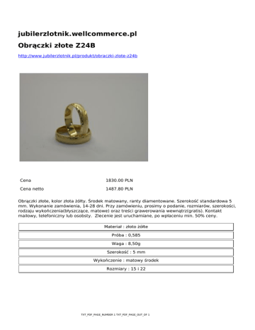 jubilerzlotnik.wellcommerce.pl Obrączki złote Z24B http://www.jubilerzlotnik.pl/produkt/obraczki-zlote-z24b Cena 1830.00 PLN Cena netto 1487.80 PLN Obrączki złote, kolor złota żółty. Środek matowany, ranty diamentowane. Szerokość standardowa 5 mm. Wykonanie zamówienia, 14-28 dni. Przy zamówieniu, prosimy o podanie, rozmiarów, szerokości, rodzaju wykończenia(błyszczące, matowe) oraz treści grawerowania wewnątrz(gratis). Kontakt mailowy, telefoniczny lub osobsty. Zlecenie jest uruchamiane, po wpłaceniu min. 50% ceny. Materiał : złoto żółte Próba : 0,585 Waga : 8,50g Szerokość : 5 mm Wykończenie : matowy środek Rozmiary : 15 i 22 TXT_PDF_PAGE_NUMBER 1 TXT_PDF_PAGE_OUT_OF 1