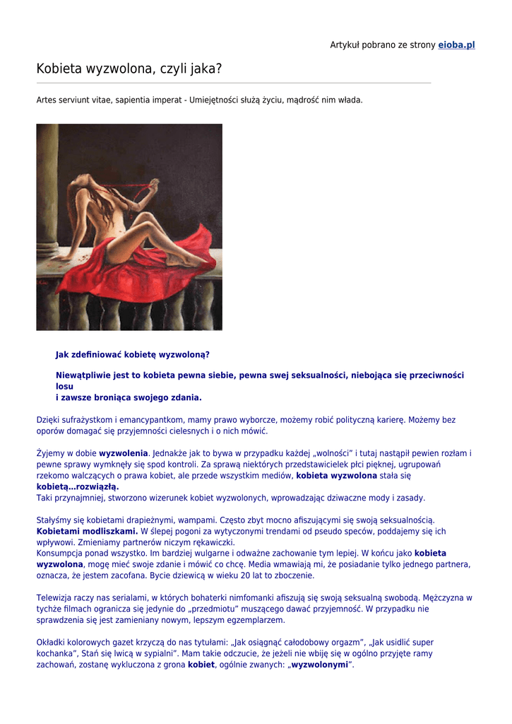 Artykuł pobrano ze strony eioba.pl Kobieta wyzwolona, czyli jaka? Artes serviunt vitae, sapientia imperat - Umiejętności służą życiu, mądrość nim włada. Jak zdefiniować kobietę wyzwoloną? Niewątpliwie jest to kobieta pewna siebie, pewna swej seksualności, niebojąca się przeciwności losu i zawsze broniąca swojego zdania. Dzięki sufrażystkom i emancypantkom, mamy prawo wyborcze, możemy robić polityczną karierę. Możemy bez oporów domagać się przyjemności cielesnych i o nich mówić. Żyjemy w dobie wyzwolenia. Jednakże jak to bywa w przypadku każdej „wolności” i tutaj nastąpił pewien rozłam i pewne sprawy wymknęły się spod kontroli. Za sprawą niektórych przedstawicielek płci pięknej, ugrupowań rzekomo walczących o prawa kobiet, ale przede wszystkim mediów, kobieta wyzwolona stała się kobietą…rozwiązłą. Taki przynajmniej, stworzono wizerunek kobiet wyzwolonych, wprowadzając dziwaczne mody i zasady. Stałyśmy się kobietami drapieżnymi, wampami. Często zbyt mocno afiszującymi się swoją seksualnością. Kobietami modliszkami. W ślepej pogoni za wytyczonymi trendami od pseudo speców, poddajemy się ich wpływowi. Zmieniamy partnerów niczym rękawiczki. Konsumpcja ponad wszystko. Im bardziej wulgarne i odważne zachowanie tym lepiej. W końcu jako kobieta wyzwolona, mogę mieć swoje zdanie i mówić co chcę. Media wmawiają mi, że posiadanie tylko jednego partnera, oznacza, że jestem zacofana. Bycie dziewicą w wieku 20 lat to zboczenie. Telewizja raczy nas serialami, w których bohaterki nimfomanki afiszują się swoją seksualną swobodą. Mężczyzna w tychże filmach ogranicza się jedynie do „przedmiotu” muszącego dawać przyjemność. W przypadku nie sprawdzenia się jest zamieniany nowym, lepszym egzemplarzem. Okładki kolorowych gazet krzyczą do nas tytułami: „Jak osiągnąć całodobowy orgazm”, „Jak usidlić super kochanka”, Stań się lwicą w sypialni”. Mam takie odczucie, że jeżeli nie wbiję się w ogólno przyjęte ramy zachowań, zostanę wykluczona z grona kobiet, ogólnie zwanych: „wyzwolonymi”. Czy jeżeli założę wibrator na łańcuszku, niczym wisiorek i będę epatować swoją seksualnością, to czy dopiero wtedy będę stuprocentową kobietą? Chyba coś tu nie tak. Nie o to w wolności kobiet chodzi. Naszym prababkom, babkom na pewno nie chodziło oto, by nasza wolność wiązała się ze swoistego rodzaju ekshibicjonizmem. Chciały, byśmy miały prawo wyboru i umiejętnie i z rozwagą z niego korzystały. A my co? Cóż z tego, że mamy prawo i wolność, jeżeli poddajemy się narzucanym trendom? Czyż obecnie panującą moda kobiety drapieżnej, nie jest to pewien rodzaj nakładanych na nas „kajdan” zachowań? Jesteśmy kobietami wyzwolonymi i korzystajmy z tego! Ale na swój indywidualny sposób. Chcę, to zmieniam partnerów, ale nikt mi nie będzie narzucał, że tak muszę robić, by udowodnić swoją wartość. Chcę być drapieżna? Dobrze, ale w przypadku, gdy to ja taka chcę być, a nie bo muszę. Kobieta wyzwolona zna swoją wartość i umie walczyć o swoje prawa. Bynajmniej nie musi dla podkreślenia swojej wartości, zakładać bluzki z dekoltem do pępka. Katarzyna Redmerska artykuł zamieszczony - http://kobieta30.pl/artykuly/kobieta_wyzwolona__czyli_jaka_ Dla mnie kobieta wyzwolona ....to kobieta, żyjąca pełnią życia. To kobieta pewna siebie, która wie czego chce i nie boi się po to sięgać, pewna swej seksualności, niebojąca się przeciwności losu i zawsze broniąca swojego zdania. Kobieta ta pozostaje w harmonii z samą sobą. Kobieta, która promieniuje kobiecością i naturalnym pięknem. Taka kobieta czuje się spełniona.....bo wie czego chce, a jej wewnętrzna siła daje jej zdolność inspirowania innych. Kobieta wyzwolona ze społecznych barier, chce decydować o sobie i podążać własną i wybraną drogą. Wyzwoliliśmy się z utartego u nas od wieków patriarchatu...możemy się uczyć, pracować, głosować, a gary, mąż i dzieci to już nie jest jedyny nasz świat...to nie feminizm! .... to równouprawnienie........ a wyzwolenie to nie tylko samodzielne stanowisko i niezależność finansowa ale też wyzwolenie ducha! Audaces fortuna iuvat timidosque repellit Śmiałym los sprzyja i bojaźliwych odtrąca. Horacy Obraz 1 - Kobieta wyzwolona Elżbieta Mozyro -http://www.elie-galeria.cdx.pl/f.php5 Autor: Gamka Artykuł pobrano ze strony eioba.pl