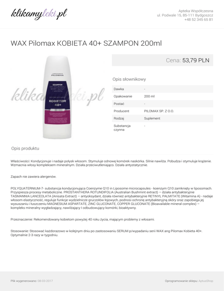 Apteka Współczesna ul. Podwale 15, 85-111 Bydgoszcz +48 52 345 65 81 WAX Pilomax KOBIETA 40+ SZAMPON 200ml Cena: 53,79 PLN Opis słownikowy Dawka - Opakowanie 200 ml Postać - Producent PILOMAX SP. Z O.O. Rodzaj Suplement Substancja czynna - Opis produktu Właściwości: Kondycjonuje i nadaje połysk włosom. Stymuluje odnowę komórek naskórka. Silnie nawilża. Pobudza i stymuluje krążenie. Wzmacnia włosy kompleksem mineralnym. Działa przeciwutleniająco. Działa antystatycznie. Zapach nie zawiera alergenów. POLYQUATERNIUM-7- substancja kondycjonująca Coenzyme Q10 in Liposome microcapsules - koenzym Q10 zamknięty w liposomach. Przyspiesza procesy metaboliczne. PROSTANTHERA ROTUNDIFOLIA (Australian Bushmint extract) – działa antybakteryjnie TASMANNIA LANCEOLATA (Anisata Extract) – antyoksydant, działa również antybakteryjnie RETINYL PALMITATE (Witamina A) - nadaje włosom elastyczność, reguluje funkcje wydzielnicze gruczołów łojowych, podnosi ochronę antybakteryjną skóry oraz zapobiega jej wysuszaniu i łuszczeniu MAGNESIUM ASPARTATE, ZINC GLUCONATE, COPPER GLUCONATE (Bioavailable mineral complex) – kompleks mineralny wygładzający, nawilżający I odbudowujący komórki, bioaktywny. Przeznaczenie: Rekomendowany kobietom powyżej 40 roku życia, mającym problemy z włosami. Stosowanie: Stosować każdorazowo w kolejnym dniu po zastosowaniu SERUM p/wypadaniu serii WAX ang Pilomax Kobieta 40+. Optymalnie 2-3 razy w tygodniu. Plik wygenerowano: 08-03-2017 Powered by TCPDF (www.tcpdf.org) Oprogramowanie sklepu: AptusShop