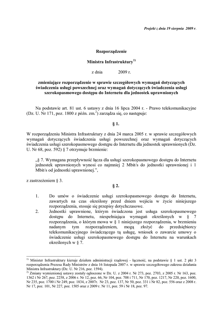Projekt z dnia 19 sierpnia 2009 r. Rozporządzenie Ministra Infrastruktury 1) z dnia 2009 r. zmieniające rozporządzenie w sprawie szczegółowych wymagań dotyczących świadczenia usługi powszechnej oraz wymagań dotyczących świadczenia usługi szerokopasmowego dostępu do Internetu dla jednostek uprawnionych Na podstawie art. 81 ust. 6 ustawy z dnia 16 lipca 2004 r. - Prawo telekomunikacyjne (Dz. U. Nr 171, poz. 1800 z późn. zm.2) zarządza się, co następuje: § 1. W rozporządzeniu Ministra Infrastruktury z dnia 24 marca 2005 r. w sprawie szczegółowych wymagań dotyczących świadczenia usługi powszechnej oraz wymagań dotyczących świadczenia usługi szerokopasmowego dostępu do Internetu dla jednostek uprawnionych (Dz. U. Nr 68, poz. 592) § 7 otrzymuje brzmienie: „§ 7. Wymagana przepływność łącza dla usługi szerokopasmowego dostępu do Internetu jednostek uprawnionych wynosi co najmniej 2 Mbit/s do jednostki uprawnionej i 1 Mbit/s od jednostki uprawnionej.”, z zastrzeżeniem § 3. § 2. 1. 2. 1) Do umów o świadczenie usługi szerokopasmowego dostępu do Internetu, zawartych na czas określony przed dniem wejścia w życie niniejszego rozporządzenia, stosuje się przepisy dotychczasowe. Jednostki uprawnione, którym świadczona jest usługa szerokopasmowego dostępu do Internetu, niespełniająca wymagań określonych w § 7 rozporządzenia, o którym mowa w § 1 niniejszego rozporządzenia, w brzmieniu nadanym tym rozporządzeniem, mogą złożyć do przedsiębiorcy telekomunikacyjnego świadczącego tą usługę, wniosek o zawarcie umowy o świadczenie usługi szerokopasmowego dostępu do Internetu na warunkach określonych w § 7. Minister Infrastruktury kieruje działem administracji rządowej - łączność, na podstawie § 1 ust. 2 pkt 3 rozporządzenia Prezesa Rady Ministrów z dnia 16 listopada 2007 r. w sprawie szczegółowego zakresu działania Ministra Infrastruktury (Dz. U. Nr 216, poz. 1594). 2) Zmiany wymienionej ustawy zostały ogłoszone w Dz. U. z 2004 r. Nr 273, poz. 2703, z 2005 r. Nr 163, poz. 1362 i Nr 267, poz. 2258, z 2006 r. Nr 12, poz. 66, Nr 104, poz. 708 i 711, Nr 170, poz. 1217, Nr 220, poz. 1600, Nr 235, poz. 1700 i Nr 249, poz. 1834, z 2007r. Nr 23, poz. 137, Nr 50, poz. 331 i Nr 82, poz. 556 oraz z 2008 r. Nr 17, poz. 101, Nr 227, poz. 1505 oraz z 2009 r. Nr 11, poz. 59 i Nr 18, poz. 97. 3. 1. 2. W przypadku pozytywnego rozpatrzenia przez przedsiębiorcę telekomunikacyjnego wniosku, o którym mowa w ust. 2, dotychczasowa umowa o świadczenie usługi szerokopasmowego dostępu do Internetu wygasa z dniem zawarcia nowej umowy. § 3. Do dnia 30 czerwca 2010 r. wymagana przepływność łącza dla usługi szerokopasmowego dostępu do Internetu dla jednostek uprawnionych, wynosi co najmniej 2 Mbit/s do jednostki uprawnionej i 512 kbit/s od jednostki uprawnionej. Od dnia 1 listopada 2010 r. wymagana przepływność łącza dla usługi szerokopasmowego dostępu do Internetu dla jednostek uprawnionych wynosi nie mniej niż 2 Mbit/s do jednostki uprawnionej i 1 Mbit/s od jednostki uprawnionej. §4 Rozporządzenie wchodzi w życie po upływie 14 dni od dnia ogłoszenia. MINISTER INFRASTRUKTURY UZASADNIENIE Projekt rozporządzenia zmieniający rozporządzenie Ministra Infrastruktury z dnia 24 marca 2005 r. w sprawie szczegółowych wymagań dotyczących świadczenia usługi powszechnej oraz wymagań dotyczących świadczenia usługi szerokopasmowego dostępu do Internetu dla jednostek uprawnionych (Dz. U. Nr 68, poz. 592) ma na celu zmianę parametrów przepływności łącza dla usługi szerokopasmowego dostępu do Internetu jednostek uprawnionych. W obowiązującym stanie prawnym parametry przepływności łącza dla jednostek uprawnionych zostały określone na poziomie odpowiednio 256 kbit/s do jednostki uprawnionej i 64 kbit/s od jednostki uprawnionej. Jednostkom uprawnionym (tj. szkołom publicznym, szkołom niepublicznym o uprawnieniach szkół publicznych, w których realizowany jest obowiązek szkolny lub obowiązek nauki, zakładom kształcenia nauczycieli, publicznym centrom kształcenia ustawicznego, centrom kształcenia praktycznego, młodzieżowym ośrodkom wychowawczym, młodzieżowym ośrodkom socjoterapii, specjalnym ośrodkom szkolno-wychowawczym, specjalnym ośrodkom wychowawczym i poradniom psychologiczno-pedagogicznym, publicznym placówkom doskonalenia nauczycieli i publicznym bibliotekom pedagogicznym, publicznym bibliotekom, szkołom wyższym), na podstawie art. 81 ust. 5 pkt 6 ustawy – Prawo telekomunikacyjne, zwanej dalej „Pt”, świadczona jest usługa przyłączenia do sieci w celu zapewnienia korzystania z usługi szerokopasmowego dostępu do Internetu. Rozporządzenie Ministra Infrastruktury z dnia 24 marca 2005 r. w sprawie szczegółowych wymagań dotyczących świadczenia usługi powszechnej oraz wymagań dotyczących świadczenia usługi szerokopasmowego dostępu do Internetu dla jednostek uprawnionych określa m. in. dwa wskaźniki dostępności i jakości dla usługi przyłączenia do sieci w celu zapewnienia korzystania z usługi szerokopasmowego dostępu do Internetu dla jednostek uprawnionych oraz wymaganą przepływność łącza dla tej usługi. W załączniku nr 1 do obowiązującego rozporządzenia określone zostały minimalne wskaźniki jakości i dostępności omawianej usługi, które stanowią m. in., że czas oczekiwania na przyłączenie do sieci nie może być dłuższy niż dwa i pół miesiąca od dnia złożenia wniosku o zawarcie umowy. Wydatki jednostek uprawnionych bezpośrednio związane ze świadczeniem usług przyłączenia do sieci w celu zapewnienia korzystania z usługi szerokopasmowego dostępu do Internetu przez te jednostki są finansowane, zgodnie z art. 100 Pt, z budżetu państwa. W rozporządzeniu Ministra Spraw Wewnętrznych i Administracji z dnia 15 lipca 2008 r. w sprawie rodzaju wydatków bezpośrednio związanych ze świadczeniem usługi przyłączenia do si