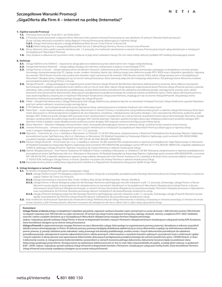 Szczegółowe Warunki Promocji „GigaOferta dla Firm 4 – internet na próbę (Internetia)” 1. Ogólne warunki Promocji 1.1. Promocja trwa od dnia 13.04.2015 r. do 30.06.2016 r. 1.2. Z Promocji może skorzystać wyłącznie Nowy Abonent, który zawiera Umowę Promocyjną na czas określony 25 pełnych Okresów Rozliczeniowych (licząc od daty aktywacji wszystkich Usług objętych Umową Promocyjną) obejmującą co najmniej Usługi: 1.2.1. Usługa Internetowa łącznie z usługą dodatkową Netia Secure 3 oraz Pomoc w biurze lub 1.2.2. Pakiet Usług łącznie z usługą dodatkową Netia Secure 3, Identyfikacja Numeru, Pomoc w biurze oraz ePrawnik. 1.3. Nowy Abonent, który spełni warunki określone pkt. 1.2. powyżej, ma możliwość zamówienia w ramach Umowy Promocyjnej innych usług określonych w niniejszych Szczegółowych Warunkach Promocji. 1.4. Ceny podane w dokumencie są cenami netto, chyba że w jego treści wskazano inaczej. Do cen netto należy doliczyć podatek VAT według obowiązującej stawki. 2. Definicje 2.1. Usługa Telefoniczna (Telefon) – stacjonarna usługa głosowa realizowana przez zakończenie sieci mające stałą lokalizację. 2.2. Usługa Internetowa (Internet) – usługa stałego dostępu do internetu, realizowana w oparciu o technologię ETTH. 2.3. Usługa Pomoc w biurze – usługa ubezpieczenia od zdarzeń losowych, realizowana przez Partnera Ubezpieczeniowego, polegająca na bezpłatnym serwisie sprzętu biurowego, komputerowego (np. PC, laptop, router, modem, drukarka, skaner itp.), elektrycznego oraz elektronicznego (RTV, AGD) wraz z dojazdem specjalisty i naprawą do wartości 700 zł brutto rocznie oraz z pokryciem kosztów części zamiennych do wartości 700 zł brutto rocznie. Pełny zakres Usługi zawarty jest w Szczegółowych Warunkach Ubezpieczenia, znajdujących się na stronie netia.pl/assistance, które stanowią załącznik do niniejszego dokumentu. Dla jednego konta Abonenta możliwe jest posiadanie jednej Usługi Pomoc w biurze. 2.4. Usługa ePrawnik – usługa polegająca na organizowaniu przez Partnera Usługi ePrawnik dla Klientów Operatora zdalnej pomocy prawnej, która odbywa się poprzez komunikację na odległość za pośrednictwem telefonu lub on-line (e-mail, faks). Zakres Usługi obejmuje organizowanie przez Partnera Usługi ePrawnik pomocy prawnej adwokata, radcy prawnego lub doradcy podatkowego, analizę dokumentów potrzebnych do udzielenia prawidłowej porady, udostępnianie wzorów pism, aktów prawnych oraz opracowanie dokumentów dotyczących postępowania przedprocesowego do ustalonej wartości przedmiotu sporu. Pełny zakres oferowanej pomocy oraz zasad współpracy zawarty jest w Ogólnych Warunkach Świadczenia Usługi przez Partnera, znajdujących się na stronie netia.pl/ePrawnik. Dla jednego konta Abonenta możliwe jest posiadanie jednego dostępu do Usługi ePrawnik. 2.5. Pakiet – Usługa Internetowa wraz z Usługą Telewizyjną i/lub Usługą Telefoniczną, zakupione łącznie na warunkach niniejszej Promocji. Usługi świadczone są przez Operatora pod tym samym adresem, za pomocą tego samego łącza. 2.6. ETTH (Ethernet) – technologia świadczenia przez Operatora Usług, wykorzystywana w budowie lokalnych sieci informatycznych. 2.7. Netia Spot – router bezprzewodowy udostępniony Abonentowi w ramach Umowy o świadczenie usług telekomunikacyjnych w zakresie Usługi Internetowej. Netia Spot może aktywować w chwili przyłączenia Urządzenia do sieci Operatora, niezależny i odseparowany od punktu dostępu i sieci wewnętrznej Abonenta, publiczny punkt dostępu WiFi. Publiczny punkt dostępu WiFi pozwala innym użytkownikom na połączenie się z siecią internet za pośrednictwem łącza internetowego Abonenta. Zasady dostępu użytkowników do publicznego punktu dostępu WiFi określa Operator. Operator upublicznia dane dotyczące lokalizacji publicznych punktów dostępu WiFi. Abonent może w każdym czasie dezaktywować publiczny punkt dostępu WiFi poprzez ustawienia konfiguracyjne Netia Spota. 2.8. Nowy Abonent – Abonent niebędący konsumentem, który nie posiada obowiązującej Umowy w zakresie Usługi, na którą ma być zawarta nowa Umowa. 2.9. Umowa Promocyjna – Umowa na warunkach promocyjnych określonych w niniejszych Szczegółowych Warunkach Promocji obejmująca co najmniej Usługi wraz z usługami dodatkowymi, wskazane w pkt 1.2.1.-1.2.2. powyżej. 2.10. Operator – Internetia Sp. z o.o. z siedzibą w Warszawie, ul. Poleczki 13, 02-822 Warszawa, zarejestrowana w Rejestrze Przedsiębiorców Krajowego Rejestru Sądowego prowadzonym przez Sąd Rejonowy dla m.st. Warszawy w Warszawie, XIII Wydział Gospodarczy Krajowego Rejestru Sądowego, pod numerem KRS 0000229688, wysokość kapitału zakładowego: 39 669 500 PLN, NIP 526-28-46-048, REGON 140063450. 2.11. Partner Usługi ePrawnik – firma Availo Sp. z o.o., z siedzibą w Jasionce, 36-002 Jasionka 954, zarejestrowana w rejestrze przedsiębiorców Sądu Rejonowego w Rzeszowie, XII Wydział Gospodarczy Krajowego Rejestru Sądowego pod numerem KRS 0000416198, posiadająca numer NIP 813-36-71-973, REGON 180831218, o kapitale zakładowym 10 000 zł, realizująca Usługę ePrawnik. Operator ma prawo do zmiany Partnera w zakresie świadczonej Usługi. 2.12. Partner Ubezpieczeniowy – Inter Partner Assistance SA Oddział w Polsce, z siedzibą w Warszawie, ul. Chłodna 51, 00-867 Warszawa, zarejestrowana w rejestrze przedsiębiorców prowadzonym przez Sąd Rejonowy dla m.st. Warszawy w Warszawie, XII Wydział Gospodarczy Krajowego Rejestru Sądowego pod numerem KRS 0000320749, o numerze NIP 108-00-06-955, o kapitale zakładowym zagranicznego zakładu ubezpieczeń Inter Partner Assistance SA z siedzibą w Brukseli, który utworzył oddział, wynoszącym 11 702 613 EUR, realizująca Usługę Pomoc w biurze. Operator ma prawo do zmiany Partnera w zakresie świadczonej Usługi. 2.13. Pozostałe terminy pisane wielką literą mają zna