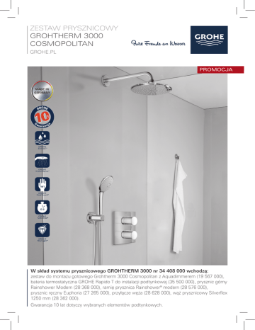 ZESTAW PRYSZNICOWY GROHTHERM 3000 COSMOPOLITAN GROHE.PL Lat PROMOCJA G wa ra n c ja GROHE DreamSpray® W skład systemu prysznicowego GROHTHERM 3000 nr 34 408 000 wchodzą: zestaw do montażu gotowego Grohtherm 3000 Cosmopolitan z Aquadimmerem (19 567 000), bateria termostatyczna GROHE Rapido T do instalacji podtynkowej (35 500 000), prysznic górny Rainshower Modern (28 368 000), ramię prysznica Rainshower® modern (28 576 000), prysznic ręczny Euphoria (27 265 000), przyłącze węża (28 628 000), wąż prysznicowy Silverflex 1250 mm (28 362 000). Gwarancja 10 lat dotyczy wybranych elementów podtynkowych. SYSTEM PRYSZNICOWY GROHE EUPHORIA GROHE.PL Lat PROMOCJA G wa ra n c ja GROHE DreamSpray® W skład systemu prysznicowego GROHE Euphoria nr 27 296 001 wchodzą: termostat natynkowy z Aquadimmerem - pozwala na przełączanie pomiędzy prysznicem górnym a prysznicem ręcznym, prysznic górny Euphoria Cosmopolitan 180 mm (27 491 000), poziome obrotowe ramię 450 mm, prysznic ręczny Euphoria Massage (27 221 000), z regulacją za pomocą przesuwnego uchwytu prysznicowego (12 140 000), wąż prysznicowy Silverflex 1750 mm (28 388 000), min. przepływ 7 l/min. Gwarancja 10 lat dotyczy wybranych elementów podtynkowych.