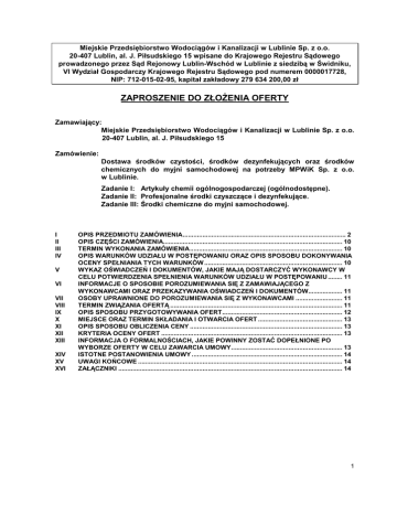 Miejskie Przedsiębiorstwo Wodociągów i Kanalizacji w Lublinie Sp. z o.o. 20-407 Lublin, al. J. Piłsudskiego 15 wpisane do Krajowego Rejestru Sądowego prowadzonego przez Sąd Rejonowy Lublin-Wschód w Lublinie z siedzibą w Świdniku, VI Wydział Gospodarczy Krajowego Rejestru Sądowego pod numerem 0000017728, NIP: 712-015-02-95, kapitał zakładowy 279 634 200,00 zł ZAPROSZENIE DO ZŁOŻENIA OFERTY Zamawiający: Miejskie Przedsiębiorstwo Wodociągów i Kanalizacji w Lublinie Sp. z o.o. 20-407 Lublin, al. J. Piłsudskiego 15 Zamówienie: Dostawa środków czystości, środków dezynfekujących oraz środków chemicznych do myjni samochodowej na potrzeby MPWiK Sp. z o.o. w Lublinie. Zadanie I: Artykuły chemii ogólnogospodarczej (ogólnodostępne). Zadanie II: Profesjonalne środki czyszczące i dezynfekujące. Zadanie III: Środki chemiczne do myjni samochodowej. I II III IV V VI VII VIII IX X XI XII XIII XIV XV XVI OPIS PRZEDMIOTU ZAMÓWIENIA........................................................................................... 2 OPIS CZĘŚCI ZAMÓWIENIA.................................................................................................... 10 TERMIN WYKONANIA ZAMÓWIENIA ..................................................................................... 10 OPIS WARUNKÓW UDZIAŁU W POSTĘPOWANIU ORAZ OPIS SPOSOBU DOKONYWANIA OCENY SPEŁNIANIA TYCH WARUNKÓW ............................................................................. 10 WYKAZ OŚWIADCZEŃ I DOKUMENTÓW, JAKIE MAJĄ DOSTARCZYĆ WYKONAWCY W CELU POTWIERDZENIA SPEŁNIENIA WARUNKÓW UDZIAŁU W POSTĘPOWANIU ........ 11 INFORMACJE O SPOSOBIE POROZUMIEWANIA SIĘ Z ZAMAWIAJĄCEGO Z WYKONAWCAMI ORAZ PRZEKAZYWANIA OŚWIADCZEŃ I DOKUMENTÓW................... 11 OSOBY UPRAWNIONE DO POROZUMIEWANIA SIĘ Z WYKONAWCAMI .......................... 11 TERMIN ZWIĄZANIA OFERTĄ ................................................................................................ 11 OPIS SPOSOBU PRZYGOTOWYWANIA OFERT ................................................................... 12 MIEJSCE ORAZ TERMIN SKŁADANIA I OTWARCIA OFERT ............................................... 13 OPIS SPOSOBU OBLICZENIA CENY ..................................................................................... 13 KRYTERIA OCENY OFERT ..................................................................................................... 13 INFORMACJA O FORMALNOŚCIACH, JAKIE POWINNY ZOSTAĆ DOPEŁNIONE PO WYBORZE OFERTY W CELU ZAWARCIA UMOWY .............................................................. 13 ISTOTNE POSTANOWIENIA UMOWY .................................................................................... 14 UWAGI KOŃCOWE .................................................................................................................. 14 ZAŁĄCZNIKI ............................................................................................................................. 14 1 Miejskie Przedsiębiorstwo Wodociągów i Kanalizacji w Lublinie Sp. z o.o. 20-407 Lublin, al. J. Piłsudskiego 15 wpisane do Krajowego Rejestru Sądowego prowadzonego przez Sąd Rejonowy Lublin-Wschód w Lublinie z siedzibą w Świdniku, VI Wydział Gospodarczy Krajowego Rejestru Sądowego pod numerem 0000017728, NIP: 712-015-02-95, kapitał zakładowy 279 634 200,00 zł Miejskie Przedsiębiorstwo Wodociągów i Kanalizacji w Lublinie Sp. z o.o., 20-407 Lublin, al. J. Piłsudskiego 15, zaprasza do złożenia oferty na dostawę środków czystości, środków dezynfekujących oraz środków chemicznych do myjni samochodowej na potrzeby MPWiK Sp. z o.o. w Lublinie. Zadanie I: Artykuły chemii ogólnogospodarczej (ogólnodostępne). Zadanie II: Profesjonalne środki czyszczące i dezynfekujące. Zadanie III: Środki chemiczne do myjni samochodowej. Zaproszenie do złożenia oferty (zwane dalej Zaproszeniem) ze wszystkimi załącznikami oraz ewentualnymi późniejszymi zmianami stanowi integralną całość. Wykonawca ma obowiązek dokładnego zapoznania się z treścią Zaproszenia. Treść oferty musi odpowiadać treści Zaproszenia. I OPIS PRZEDMIOTU ZAMÓWIENIA Przedmiotem zamówienia jest dostawa środków czystości, środków dezynfekujących oraz środków chemicznych do myjni samochodowej na potrzeby MPWiK Sp. z o.o. w Lublinie. Przedmiot zamówienia został podzielony na 3 zadania w n/w sposób: Zadanie I: Artykuły chemii ogólnogospodarczej (ogólnodostępne). Tabela nr 1 Ilość Lp. 1 1 2 3 4 5 Nazwa produktu 2 Płyn do ręcznego mycia naczyń o zapachu miętowym LUDWIK lub równoważny Płyn do ręcznego mycia naczyń o zapachu miętowym LUDWIK lub równoważny Płyn do mycia szyb: * z efektem impregnacji * ze spryskiwaczem Mr.Muscle lub Clin lub równoważny Mydło w płynie: * neutralne dla skóry PH * antybakteryjne * chroniące przed nadmiernym wysuszeniem * o przyjemnym zapachu * pakowane w kanistry 5 l. Preparat do czyszczenia odświeżania i pielęgnacji mebli. Usuwający ślady po palcach, tuszu itp. W atomizerze. Skutecznie usuwający kurz, brud, nie nawarstwiający się. O przyjemnym zapachu. CYPRUS lub równoważny Wielkość zamawianych opakowania opakowań 3 4 1l 465 5l 49 750 ml 657 5l 495 500 ml 151 2 Miejskie Przedsiębiorstwo Wodociągów i Kanalizacji w Lublinie Sp. z o.o. 20-407 Lublin, al. J. Piłsudskiego 15 wpisane do Krajowego Rejestru Sądowego prowadzonego przez Sąd Rejonowy Lublin-Wschód w Lublinie z siedzibą w Świdniku, VI Wydział Gospodarczy Krajowego Rejestru Sądowego pod numerem 0000017728, NIP: 712-015-02-95, kapitał zakładowy 279 634 200,00 zł 6 Ścierka celulozowa do podłogi kolor żółty wymiar 60 x 70 cm szt. 499 szt. 277 szt. 2148 Ścierka flanelowa: * wymiar min.50 x 70 cm * w ciemnym kolorze szt. 113 Ścierka do podłogi: * szaro – ciemna 10 * dobrze wchłaniająca wodę * wymiar: 70 cm x 60 cm szt. 433 Ścierka do podłogi: * biała 11 * dobrze wchłaniająca wodę * wymiar: 70 cm x 6