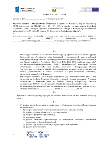 UMOWA nr DSK/ /2014 zawarta w dniu ....................................... w Warszawie między: Skarbem Państwa – Ministerstwem Środowiska z siedzibą w Warszawie, przy ul. Wawelskiej 52/54, kod pocztowy 00-922, NIP 526 – 16 – 47 – 453, w imieniu i na rzecz którego działa Pani Aleksandra Malarz, Zastępca Dyrektora w Departamencie Strategii i Komunikacji, na podstawie pełnomocnictwa nr 57 z dnia 27 czerwca 2014 r., zwanym dalej „Zamawiającym”, a ………………………., z siedzibą w ……………, przy ul. ……………….., kod pocztowy ……………….., NIP: ………………, REGON: ……………., wpisaną do ……………….. pod nr …………, reprezentowaną przez ……………….., zwaną dalej w treści umowy „Wykonawcą”. § 1. 1. Zamawiający zamawia, a Wykonawca zobowiązuje się wykonać na rzecz Zamawiającego Zamówienie pn. „Świadczenie usług hotelarskich i restauracyjnych wraz z usługami towarzyszącymi przygotowaniu, organizacji i obsłudze międzynarodowej dwóch konferencji pn.: "Razem ku Zielonej Przyszłości – NMF i MF EOG 2009-2014 w sektorze środowiska" oraz VII międzynarodowej konferencji „Dbając o Zieloną Przyszłość”, promujących Program Infrastruktura i Środowisko oraz fundusze norweskie i Europejskiego Obszaru Gospodarczego pochodzące z Islandii, Liechtensteinu oraz Norwegii, zwane w dalszej treści umowy „Zamówieniem", w zakresie określonym w Opisie Przedmiotu Zamówienia, stanowiącym załącznik nr 1 do umowy. 2. Zamawiający oświadcza, że niniejsze Zamówienie jest współfinansowane przez Unię Europejską ze środków Funduszu Spójności w ramach pomocy technicznej Programu Infrastruktura i Środowisko oraz ze środków funduszy Europejskiego Obszaru Gospodarczego 2009-2014, pochodzących z Islandii, Liechtensteinu oraz Norwegii. 3. Termin realizacji zamówienia określa się od dnia zawarcia umowy do dnia 5 grudnia 2014 r.; a terminy konferencji to …………………. 2014 r. i ………………….2014 r. § 2. Wykonawca zobowiązuje się przystąpić do realizacji Zamówienia od dnia zawarcia niniejszej umowy. § 3. 1. W terminie pięciu dni od dnia zawarcia umowy, Wykonawca przedstawi Zamawiającemu do zatwierdzenia: 1) miejsce organizacji konferencji i seminarium wraz z oprawą wizualną; 2) miejsce organizacji kolacji wraz oprawą wizualną; 3) miejsce i program wizyty studyjnej; 4) propozycje menu; 5) projekt formularza zgłoszeniowego dla uczestników konferencji, seminarium opracowany w formie elektronicznej; 6) projekt zaproszeń na konferencje w języku polskim i angielskim, 7) projekt identyfikatorów; str. 1 8) wzór ankiety do oceny konferencji oraz list obecności. 2. Zamawiający zaakceptuje miejsce organizacji konferencji, seminarium oraz wizyty studyjnej na które składają się: hotele, w których będą zakwaterowani goście i pracownicy Zamawiającego, sale konferencyjne, miejsce organizacji kolacji oraz menu w trakcie konferencji, seminarium i materiały, o których mowa w ust. 1 i wszystkie pozostałe elementy związane z organizacją Zamówienia, w terminie trzech dni od dnia przedstawienia propozycji przez Wykonawcę. W przypadku wniesienia przez Zamawiającego uwag do propozycji, o których mowa w ust. 1, Wykonawca jest zobowiązany do wprowadzenia zmian w terminie trzech dni roboczych. Wykonawca będzie zobowiązany poprawiać materiały, proponować nowe menu, nowe miejsce konferencji i kolacji, aż do otrzymania ostatecznej akceptacji Zamawiającego. 3. Nie później niż w terminie dwóch dni od dnia zakończenia konferencji i seminarium Wykonawca przekaże Zamawiającemu pisemny raport z realizacji Zamówienia, do którego będą dołączone: 1) listy obecności podpisane przez uczestników konferencji; 2) ankiety oceny konferencji wypełnione przez uczestników; 3) rejestrację audio - video nakręconą w trakcie konferencji na płycie DVD, bądź innym nośniku elektronicznym umożliwiającym jego odtwarzanie; 4) 200 szt. broszury promującej fundusze norweskie i EOG. § 4. 1. Zamawiający zobowiązuje się do zapłaty wynagrodzenia z tytułu realizacji Zamówienia, zgodnie z kosztorysami powykonawczymi, przedstawionymi przez Wykonawcę, w wysokości nie większej niż ………………. złotych brutto (słownie złotych: ……………………………….. 00/100), z zastrzeżeniem ust. 2. 2. W przypadku zmiany liczby uczestników dopuszcza się obniżenie ostatecznego kosztu wykonania Zamówienia dotyczącego wyżywienia oraz noclegów w hotelu, zgodnie z pozycją jednostkową zawartą w kosztorysie (załącznik nr 2 do umowy). O takiej zmianie Zamawiający powiadomi Wykonawcę mailem lub faksem, w terminie dwóch dni przed terminem konferencji i seminarium. 3. Zamawiający zastrzega sobie prawo do całkowitej rezygnacji z następujących usług: tłumaczenia symultanicznego, konsekutywnego i biletów lotniczych, wynajmu sali na konferencję prasową, sprzętu na oprawę multimedialną konferencji, bez ponoszenia jakichkolwiek kosztów. Zmiana ta jest możliwa do 7 dni przed rozpoczęciem konferencji. 4. Wynagrodzenie zostanie wypłacone po wykonaniu Zamówienia i po podpisaniu protokołu zdawczo-odbiorczego, potwierdzającego realizację Zamówienia, w terminie do 21 dni od dnia dostarczenia do Zamawiającego prawidłowo wystawionej faktury. Podstawą wystawienia faktury będzie podpisanie protokołu zdawczo-odbiorczego, który będzie zawierał w szczególności: 1) dzień i miejsce jego sporządzenia; 2) informację o realizacji Zamówienia; 3) liczbę uczestników konferencji. 5. Za dzień zapłaty kwoty wskazanej w ust. 1 uważa się dzień złożenia przez Zamawiającego dyspozycji przelewu na wskazany przez Wykonawcę rachunek bankowy. § 5. 1. Wykonawca jest zobowiązany do informowania, że Zamówienie jest realizowane z udziałem środków finansowych pochodzących z Unii Europejskiej oraz środków finansowych str. 2 pochod