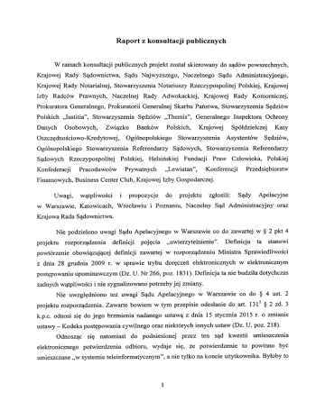 Raport z konsultacji publicznych W ramach konsultacji publicznych projekt został skierowany do sądów powszechnych, Krajowej Rady Sądownictwa, Sądu Najwyższego, Naczelnego Sądu Administracyjnego, Krajowej Rady Notarialnej, Stowarzyszenia Notariuszy Rzeczypospolitej Polskiej, Krajowej Izby Radców Prawnych, Naczelnej Rady Adwokackiej, Krajowej Rady Komorniczej, Prokuratora Generalnego, Prokuratorii Generalnej Skarbu Państwa, Stowarzyszenia Sędziów Polskich „Iustitia", Stowarzyszenia Sędziów „Themis", Generalnego Inspektora Ochrony Danych Osobowych, Związku Oszczędnościowo-Kredytowej, Banków Polskich, Ogólnopolskiego Krajowej Stowarzyszenia Spółdzielczej Asystentów Kasy Sędziów, Ogólnopolskiego Stowarzyszenia Referendarzy Sądowych, Stowarzyszenia Referendarzy Sądowych Rzeczypospolitej Polskiej, Helsińskiej Fundacji Praw Człowieka, Konfederacji Pracodawców Prywatnych „Lewiatan", Konferencji Polskiej Przedsiębiorstw Finansowych, Business Center Club, Krajowej Izby Gospodarczej. Uwagi, wątpliwości i propozycje do projektu zgłosili: Sądy Apelacyjne w Warszawie, Katowicach, Wrocławiu i Poznaniu, Naczelny Sąd Administracyjny oraz Krajowa Rada Sądownictwa. Nie podzielono uwagi Sądu Apelacyjnego w Warszawie co do zawartej w § 2 pkt 4 projektu rozporządzenia definicji pojęcia „uwierzytelnienie". Definicja ta stanowi powtórzenie obowiązującej definicji zawartej w rozporządzeniu Ministra Sprawiedliwości z dnia 28 grudnia 2009 r. w sprawie trybu doręczeń elektronicznych w elektronicznym postępowaniu upominawczym (Dz. U. Nr 266, poz. 1831). Definicja ta nie budziła dotychczas żadnych wątpliwości i nie sygnalizowano potrzeby jej zmiany. Nie uwzględniono też uwagi Sądu Apelacyjnego w Warszawie co do § 4 ust. 2 projektu rozporządzenia. Zawarte bowiem w tym przepisie odesłanie do art. 1311 § 2 zd. 3 k.p.c. odnosi się do jego brzmienia nadanego ustawą z dnia 15 stycznia 2015 r. o zmianie ustawy - Kodeks postępowania cywilnego oraz niektórych innych ustaw (Dz. U. poz. 218). Odnosząc się natomiast do podniesionej przez ten sąd kwestii umieszczenia elektronicznego potwierdzenia odbioru, wydaje się, że potwierdzenie to powinno być umieszczane „w systemie teleinformatycznym", a nie tylko na koncie użytkownika. Byłoby to 1 uzasadnione w przypadku potwierdzenia odbioru pisma w elektronicznym postępowaniu upominawczym, które powinno być umieszczone w elektronicznych aktach sprawy. W uwzględnieniu uwagi Sądu Apelacyjnego w Katowicach w § 4 ust. 2 projektu rozporządzenia sformułowanie: „chwilę doręczenia pisma" zastąpiono zwrotem: „chwilę odbioru pisma", a w uzasadnieniu wskazano, że w stanie prawnym obowiązującym po wejściu w życie ustawy z dnia 15 stycznia 2015 r. nie będzie można stosować przepisu § 6 w elektronicznym postępowaniu wieczystoksięgowym. Nie podzielono natomiast uwagi Sądu Apelacyjnego we Wrocławiu co do zbędności definicji pisma (§ 2 pkt 6 projektu rozporządzenia). Potrzeba wprowadzenia definicji legalnej pisma wynika stąd, że doręczeniu podlegają pisma (procesowe i sądowe) oraz orzeczenia (art. 140 k.p.c.). Względy ekonomii legislacyjnej przemawiają za tym, aby unikać powtarzania tej frazy w poszczególnych przepisach. Natomiast zastąpienie tego pojęcia terminem „dokument podlegający doręczeniu" nie wydaje się trafne. Po pierwsze, w przepisach procesowych wyraz „dokument" jest zazwyczaj używany dla oznaczenia środka dowodowego, a nie pisma lub orzeczenia. Po drugie, większość przepisów k.p.c. dotyczących doręczeń wskazuje, że doręcza się „pismo", a nie „dokument". Najważniejsze znaczenie ma w tym zakresie przepis art. 1311 § 2 k.p.c., w którym użyto zwrotu „pismo uznaje się za doręczone". Nie wydaje się zatem zasadne wprowadzanie do projektowanych przepisów terminologii odmiennej od tej, która jest stosowana w przepisach rangi ustawowej. Za nietrafną uznano też propozycję Sądu Apelacyjnego we Wrocławiu zastąpienia wyrazu „chwilę" zwrotem „datę i czas doręczenia" albowiem proponowane określenie jest mało precyzyjne. „Czas" obejmuje bowiem także datę. Odnosząc się do wątpliwości Prezesa Sądu Apelacyjnego w Poznaniu wskazać należy, że według projektowanych przepisów użytkownikiem konta może być wyłącznie osoba fizyczna. Przyjęto bowiem, że doręczenie elektroniczne dokonywane jest użytkownikowi, który posiada faktyczną zdolność potwierdzenia odbioru pisma. Tylko osoba fizyczna może wyrazić w systemie teleinformatycznym swoją wolę poprzez podjęcie czynności faktycznych skutkujących uwierzytelnieniem się w systemie teleinformatycznym. Z powyższych względów tryb i sposób dokonywania doręczeń elektronicznych powinien koncentrować się na odbiorze pisma przez użytkownika rozumianego jako osoba, która faktycznie korzysta 2 z systemu teleinformatycznego. Taki model funkcjonuje już w obowiązujących przepisach dotyczących elektronicznego postępowania upominawczego i przewiduje się jego utrzymanie. Należy też zwrócić uwagę, że nawet w przepisach dotyczących doręczeń („tradycyjnych") pism adresowanych do osób prawnych, przewidziano, że są one zawsze dokonywane do rąk osoby fizycznej (członka organu lub pracownika - por. art. 133 § 2 k.p.c.). W elektronicznym postępowaniu upominawczym dopuszczalne jest wskazanie w systemie teleinformatycznym użytkownika uprawnionego do odbioru pism (por. § 6 projektu). Członek organu osoby prawnej (np. prezes zarządu) może zatem wskazać, że osobą uprawnioną do odbioru pism będzie inna osoba (np. pracownik tej osoby prawnej). Nie podzielono uwagi Sądu Apelacyjnego w Poznaniu dotyczącej definicji pisma. Nie można się bowiem zgodzić ze stanowiskiem, że „pismo" istnieje wyłącznie w postaci fizycznej. W przepisach k.p.c. pojęcie „pismo" obejmuje szeroki zakres desygnatów. Może ono obejmować pisma procesowe, które mogą istni