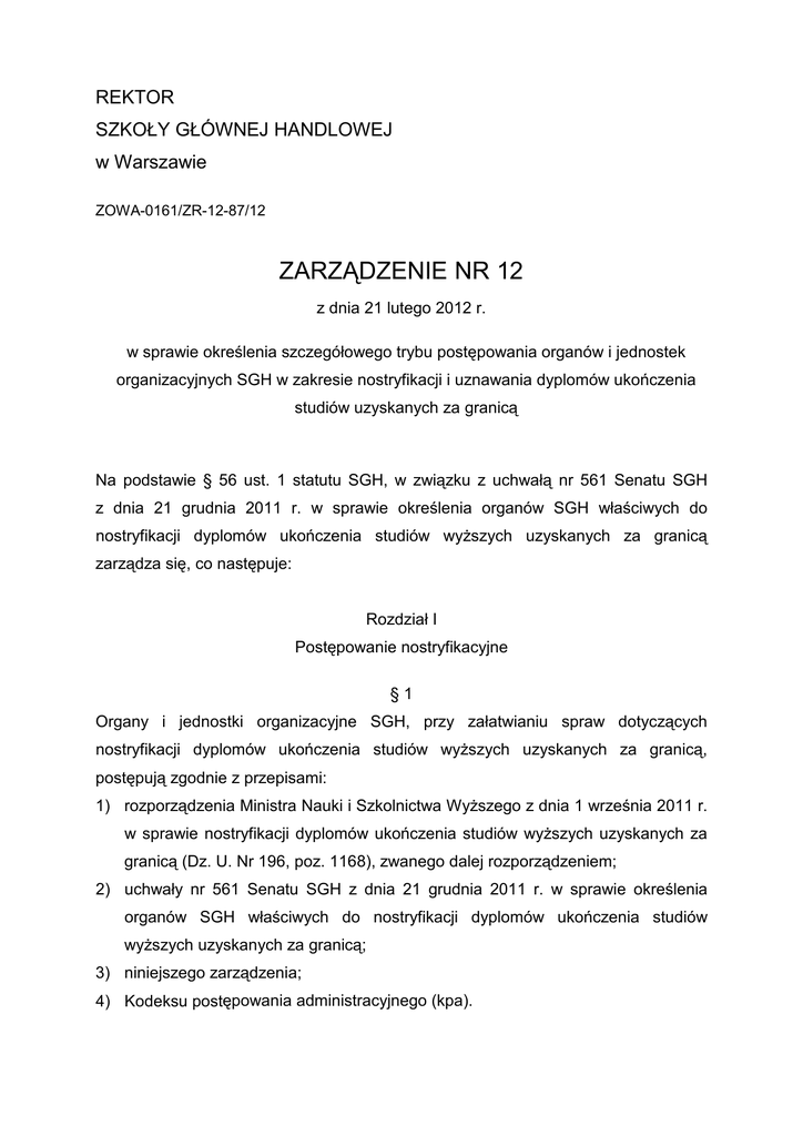 REKTOR SZKOŁY GŁÓWNEJ HANDLOWEJ w Warszawie ZOWA-0161/ZR-12-87/12 ZARZĄDZENIE NR 12 z dnia 21 lutego 2012 r. w sprawie określenia szczegółowego trybu postępowania organów i jednostek organizacyjnych SGH w zakresie nostryfikacji i uznawania dyplomów ukończenia studiów uzyskanych za granicą Na podstawie § 56 ust. 1 statutu SGH, w związku z uchwałą nr 561 Senatu SGH z dnia 21 grudnia 2011 r. w sprawie określenia organów SGH właściwych do nostryfikacji dyplomów ukończenia studiów wyŜszych uzyskanych za granicą zarządza się, co następuje: Rozdział I Postępowanie nostryfikacyjne §1 Organy i jednostki organizacyjne SGH, przy załatwianiu spraw dotyczących nostryfikacji dyplomów ukończenia studiów wyŜszych uzyskanych za granicą, postępują zgodnie z przepisami: 1) rozporządzenia Ministra Nauki i Szkolnictwa WyŜszego z dnia 1 września 2011 r. w sprawie nostryfikacji dyplomów ukończenia studiów wyŜszych uzyskanych za granicą (Dz. U. Nr 196, poz. 1168), zwanego dalej rozporządzeniem; 2) uchwały nr 561 Senatu SGH z dnia 21 grudnia 2011 r. w sprawie określenia organów SGH właściwych do nostryfikacji dyplomów ukończenia studiów wyŜszych uzyskanych za granicą; 3) niniejszego zarządzenia; 4) Kodeksu postępowania administracyjnego (kpa). §2 1. Wnioski osób ubiegających się o nostryfikację dyplomów ukończenia studiów wyŜszych uzyskanych za granicą, przed ich rozpoznaniem przez właściwe organy SGH, podlegają rejestracji w Dziale Nauczania. 2. Wnioski złoŜone albo doręczone przez pocztę do biur kolegiów, dziekanatów Studium Licencjackiego i Studium Magisterskiego, Kancelarii Głównej oraz innych jednostek Uczelni podlegają niezwłocznemu przekazaniu do Działu Nauczania, w celu ich rejestracji. 3. Wzór wniosku o nostryfikację dyplomu ukończenia studiów wyŜszych uzyskanych za granicą stanowi załącznik nr 1 do zarządzenia. §3 1. Dział Nauczania dokonuje wstępnej analizy wniosków, o których mowa w § 2 ust. 1, ustalając czy nie zawierają one braków formalnych oraz czy wniosek zawiera wszystkie załączniki wymagane przepisami rozporządzenia i postanowieniami załącznika nr 2 do zarządzenia. 2. JeŜeli wniosek nie czyni zadość wymaganiom, o których mowa w ust. 1, Dział Nauczania przekazuje wniosek do właściwej rady kolegium w ciągu 2 dni od momentu jego złoŜenia. Rada kolegium wzywa wnioskodawcę do usunięcia braków w terminie 7 dni od dnia doręczenia postanowienia z pouczeniem, Ŝe nieusunięcie tych braków spowoduje pozostawienie wniosku bez rozpoznania. §4 1. Dział Nauczania zapewnia organom SGH niezbędne informacje dotyczące przesłanek nostryfikacji dyplomu, o których mowa w § 6 ust. 2 rozporządzenia. 2. W przypadku wątpliwości dotyczących właściwości dyplomu lub statusu uczelni zagranicznej, których nie moŜna wyjaśnić w ramach Uczelni, kierownik Działu Nauczania niezwłocznie zwraca się do ministra właściwego do spraw szkolnictwa wyŜszego lub upowaŜnionego przez niego podmiotu w celu wydania opinii lub zaświadczenia. §5 Dział Nauczania prowadzi ogólnouczelniane rejestry: 1) postanowień i uchwał podjętych przez organy SGH w postępowaniach nostryfikacyjnych; 2) wydanych zaświadczeń potwierdzających równowaŜność dyplomu uzyskanego za granicą z polskim dyplomem ukończenia studiów wyŜszych. §6 1. Biura kolegiów są zobowiązane przekazywać Działowi Nauczania w celu rejestracji kopie wszelkich postanowień i uchwał rad kolegiów dotyczących nostryfikacji dyplomów niezwłocznie po ich podjęciu. Kopie powinny być poświadczone za zgodność z oryginałem. 2. Biura kolegiów prowadzą rejestr spraw związanych z postępowaniem nostryfikacyjnym zgodnie z Instrukcją kancelaryjną. §7 1. Wniosek w sprawie nostryfikacji dyplomu ukończenia studiów wyŜszych uzyskanego za granicą wraz z kompletem załączników Dział Nauczania przekazuje radzie kolegium wskazanej we wniosku przez osobę ubiegającą się o nostryfikację. 2. Wnioski, w których wnoszący nie określił rady kolegium mającej rozpoznać sprawę nostryfikacji dyplomu, Dział Nauczania przedstawia Rektorowi w celu wyznaczenia rady kolegium, której wniosek zostanie przekazany do rozpoznania. 3. Rektor wyznacza radę kolegium, której wniosek zostanie przekazany do rozpoznania, uwzględniając kierunek lub specjalizację studiów wyŜszych, których ukończenie stwierdza dyplom będący przedmiotem wniosku o nostryfikację. 4. Dział Nauczania przekazuje wniosek kierownikowi biura właściwego kolegium za pokwitowaniem odbioru. §8 1. JeŜeli rada kolegium stwierdzi brak właściwości do przeprowadzenia postępowania nostryfikacyjnego, wydaje postanowienie o odmowie wszczęcia postępowania nostryfikacyjnego. 2. Postanowienie powinno czynić zadość wymaganiom określonym w art. 124 kpa i być doręczone zgodnie z art. 39 i nast. kpa. 3. Na postanowienie o odmowie wszczęcia postępowania nostryfikacyjnego słuŜy zaŜalenie do Rektora. ZaŜalenie wnosi się za pośrednictwem rady kolegium, która wydała postanowienie, w terminie 7 dni od dnia doręczenia postanowienia osobie ubiegającej się o nostryfikację dyplomu. 4. Do zaŜaleń stosuje się przepisy art. 143-144 kpa. §9 1. Rada kolegium, w przypadkach określonych w § 5 ust. 3 rozporządzenia moŜe podjąć uchwałę o konieczności zdania określonych egzaminów przez osobę ubiegającą się o nostryfikację dyplomu. 2. Od uchwały, o której mowa w ust. 1, nie przysługuje odwołanie. 3. Doręczenie uchwały następuje w trybie art. 39 i nast. kpa. § 10 1. Początek biegu 90-dniowego terminu zakończenia postępowania nostryfikacyjnego liczy się od dnia przedstawienia przez osobę ubiegającą się o nostryfikację dyplomu wszystkich wymaganych dokumentów w Dziale Nauczania. 2. W przypadku, o którym mowa w § 9 ust. 1, postępowanie nostryfikacyjne zostaje zakończone w terminie 30 dni od dnia wpływu dokumentów potwier