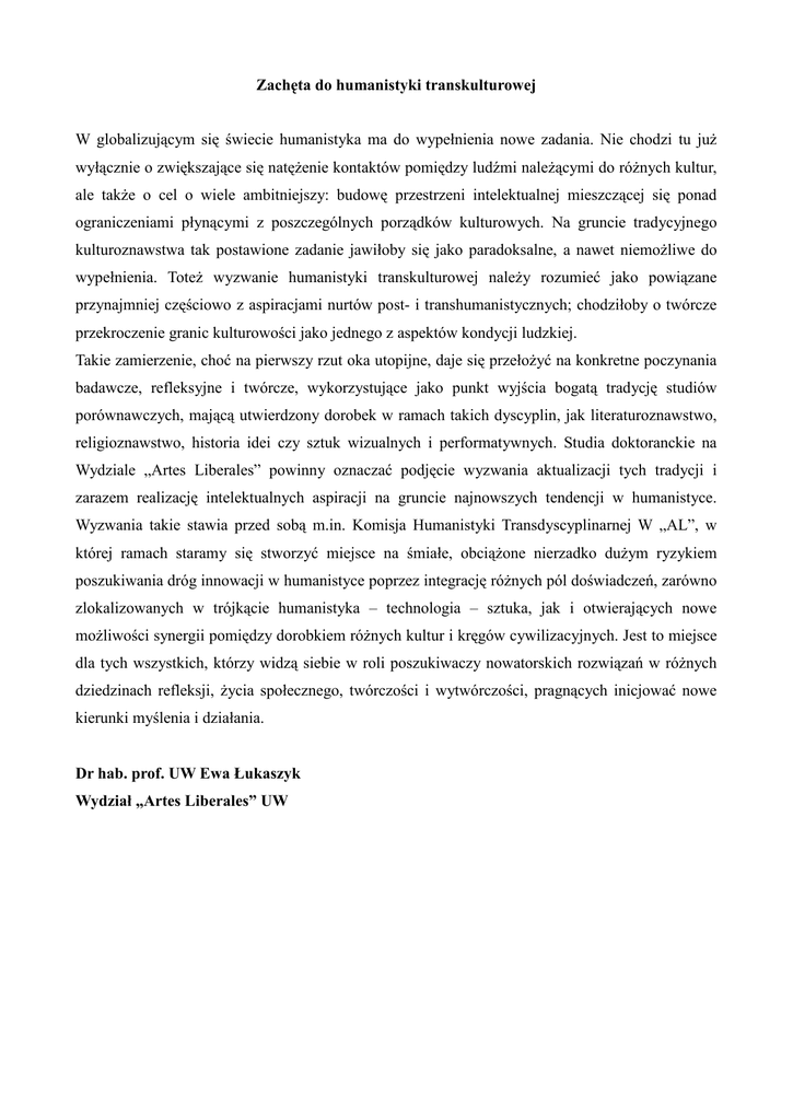 Zachęta do humanistyki transkulturowej W globalizującym się świecie humanistyka ma do wypełnienia nowe zadania. Nie chodzi tu już wyłącznie o zwiększające się natężenie kontaktów pomiędzy ludźmi należącymi do różnych kultur, ale także o cel o wiele ambitniejszy: budowę przestrzeni intelektualnej mieszczącej się ponad ograniczeniami płynącymi z poszczególnych porządków kulturowych. Na gruncie tradycyjnego kulturoznawstwa tak postawione zadanie jawiłoby się jako paradoksalne, a nawet niemożliwe do wypełnienia. Toteż wyzwanie humanistyki transkulturowej należy rozumieć jako powiązane przynajmniej częściowo z aspiracjami nurtów post- i transhumanistycznych; chodziłoby o twórcze przekroczenie granic kulturowości jako jednego z aspektów kondycji ludzkiej. Takie zamierzenie, choć na pierwszy rzut oka utopijne, daje się przełożyć na konkretne poczynania badawcze, refleksyjne i twórcze, wykorzystujące jako punkt wyjścia bogatą tradycję studiów porównawczych, mającą utwierdzony dorobek w ramach takich dyscyplin, jak literaturoznawstwo, religioznawstwo, historia idei czy sztuk wizualnych i performatywnych. Studia doktoranckie na Wydziale „Artes Liberales” powinny oznaczać podjęcie wyzwania aktualizacji tych tradycji i zarazem realizację intelektualnych aspiracji na gruncie najnowszych tendencji w humanistyce. Wyzwania takie stawia przed sobą m.in. Komisja Humanistyki Transdyscyplinarnej W „AL”, w której ramach staramy się stworzyć miejsce na śmiałe, obciążone nierzadko dużym ryzykiem poszukiwania dróg innowacji w humanistyce poprzez integrację różnych pól doświadczeń, zarówno zlokalizowanych w trójkącie humanistyka – technologia – sztuka, jak i otwierających nowe możliwości synergii pomiędzy dorobkiem różnych kultur i kręgów cywilizacyjnych. Jest to miejsce dla tych wszystkich, którzy widzą siebie w roli poszukiwaczy nowatorskich rozwiązań w różnych dziedzinach refleksji, życia społecznego, twórczości i wytwórczości, pragnących inicjować nowe kierunki myślenia i działania. Dr hab. prof. UW Ewa Łukaszyk Wydział „Artes Liberales” UW