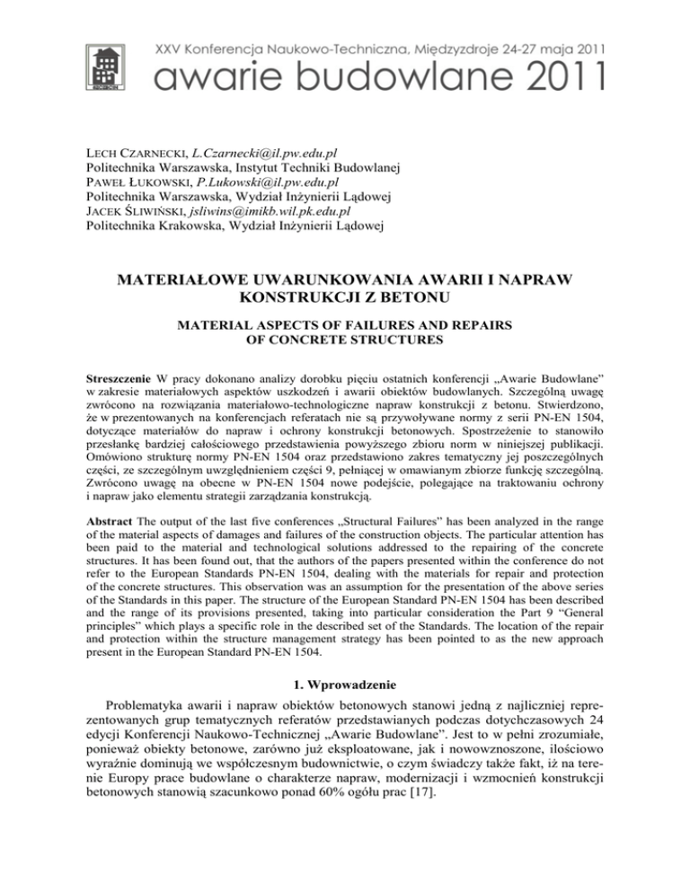 LECH CZARNECKI, [email protected] Politechnika Warszawska, Instytut Techniki Budowlanej PAWEŁ ŁUKOWSKI, [email protected] Politechnika Warszawska, Wydział InŜynierii Lądowej JACEK ŚLIWIŃSKI, [email protected] Politechnika Krakowska, Wydział InŜynierii Lądowej MATERIAŁOWE UWARUNKOWANIA AWARII I NAPRAW KONSTRUKCJI Z BETONU MATERIAL ASPECTS OF FAILURES AND REPAIRS OF CONCRETE STRUCTURES Streszczenie W pracy dokonano analizy dorobku pięciu ostatnich konferencji „Awarie Budowlane” w zakresie materiałowych aspektów uszkodzeń i awarii obiektów budowlanych. Szczególną uwagę zwrócono na rozwiązania materiałowo-technologiczne napraw konstrukcji z betonu. Stwierdzono, Ŝe w prezentowanych na konferencjach referatach nie są przywoływane normy z serii PN-EN 1504, dotyczące materiałów do napraw i ochrony konstrukcji betonowych. SpostrzeŜenie to stanowiło przesłankę bardziej całościowego przedstawienia powyŜszego zbioru norm w niniejszej publikacji. Omówiono strukturę normy PN-EN 1504 oraz przedstawiono zakres tematyczny jej poszczególnych części, ze szczególnym uwzględnieniem części 9, pełniącej w omawianym zbiorze funkcję szczególną. Zwrócono uwagę na obecne w PN-EN 1504 nowe podejście, polegające na traktowaniu ochrony i napraw jako elementu strategii zarządzania konstrukcją. Abstract The output of the last five conferences „Structural Failures” has been analyzed in the range of the material aspects of damages and failures of the construction objects. The particular attention has been paid to the material and technological solutions addressed to the repairing of the concrete structures. It has been found out, that the authors of the papers presented within the conference do not refer to the European Standards PN-EN 1504, dealing with the materials for repair and protection of the concrete structures. This observation was an assumption for the presentation of the above series of the Standards in this paper. The structure of the European Standard PN-EN 1504 has been described and the range of its provisions presented, taking into particular consideration the Part 9 “General principles” which plays a specific role in the described set of the Standards. The location of the repair and protection within the structure management strategy has been pointed to as the new approach present in the European Standard PN-EN 1504. 1. Wprowadzenie Problematyka awarii i napraw obiektów betonowych stanowi jedną z najliczniej reprezentowanych grup tematycznych referatów przedstawianych podczas dotychczasowych 24 edycji Konferencji Naukowo-Technicznej „Awarie Budowlane”. Jest to w pełni zrozumiałe, poniewaŜ obiekty betonowe, zarówno juŜ eksploatowane, jak i nowowznoszone, ilościowo wyraźnie dominują we współczesnym budownictwie, o czym świadczy takŜe fakt, iŜ na terenie Europy prace budowlane o charakterze napraw, modernizacji i wzmocnień konstrukcji betonowych stanowią szacunkowo ponad 60% ogółu prac [17]. 56 Czarnecki L. i inni: Materiałowe uwarunkowania awarii i napraw konstrukcji z betonu Szeroko pojęta, skuteczna naprawa obiektów betonowych jest w większości przypadków zabiegiem skomplikowanym, którego końcowy efekt zaleŜy od wielu czynników, w tym przede wszystkim od właściwego doboru materiałów i systemów naprawczych oraz poprawności przeprowadzenia, nierzadko licznych, operacji. Od niedawna (w całości – od zeszłego roku) polski inŜynier otrzymał bardzo przydatne narzędzie ułatwiające zarówno diagnostykę stanu konstrukcji, jak i prawidłowe zaplanowanie oraz przeprowadzenie robót naprawczych, w tym dokonanie właściwego doboru stosowanych materiałów lub ich systemu. Narzędziem tym jest pakiet dziesięciu norm PN-EN 1504 pod wspólnym tytułem Wyroby i systemy do ochrony napraw i konstrukcji z betonu. Definicje, wymagania, sterowanie jakością i ocena zgodności. Normy te w sposób istotny zmieniają podejście do prac naprawczo-modernizacyjnych oraz porządkują i systematyzują związaną z nimi problematykę. Stanowią one dla inŜyniera budownictwa rodzaj szczegółowego, wykorzystującego współczesny stan wiedzy, nowoczesnego przewodnika. Z tego powodu normy te zasługują na moŜliwie szerokie ich rozpropagowanie, dla którego najbardziej właściwym forum jest niewątpliwie Konferencja Naukowo-Techniczna „Awarie Budowlane”. Mając to na uwadze, mimo licznych prac opublikowanych juŜ na temat norm serii PN-EN 1504 (np. [15÷22, 46, 47]), autorzy uznali za stosowne przedstawienie tytułowego zagadnienia uczestnikom Konferencji. Za celowością prezentacji istoty i zawartości norm serii PN-EN 1504 właśnie podczas konferencji „Awarie Budowlane”, przemawiają takŜe liczne, prezentowane na niej w ostatnim dziesięcioleciu, prace poświęcone problematyce napraw uszkodzonych obiektów betonowych. 2. Charakterystyka materiałowych aspektów awarii i napraw prezentowanych podczas konferencji „Awarie Budowlane” w ostatnim dziesięcioleciu 2.1 Charakterystyka ogólna Przeprowadzony przez autorów przegląd materiałów konferencyjnych z okresu ostatnich 10 lat, obejmujący pięć edycji Konferencji (od XX do XXIV), pozwolił na wytypowanie ponad 40 opracowań (patrz literatura), w których autorzy w sposób wyraźny jako jedną z przyczyn wskazywali niepoprawną jakość zastosowanych materiałów i/lub podali koncepcję naprawy z ogólnym lub bardziej szczegółowym wskazaniem zalecanych rozwiązań materiałowo-technologicznych. Referaty stanowiące podstawę przeprowadzonych analiz pochodzą z następujących grup tematycznych Konferencji: konstrukcje betonowe (18), mosty (4), budownictwo ogólne (6), konstrukcje stalowe (0) i materiały budowlane (13). Wśród tych opracowań zdecydowaną większość (ok. 88%) stanowią referaty dotyczące betonu i obiektów betonowych [1÷13, 23÷25, 27÷31, 33÷35, 37, 39÷41, 43÷45, 48, 50÷53]. Pozostałe referaty były związane z dest