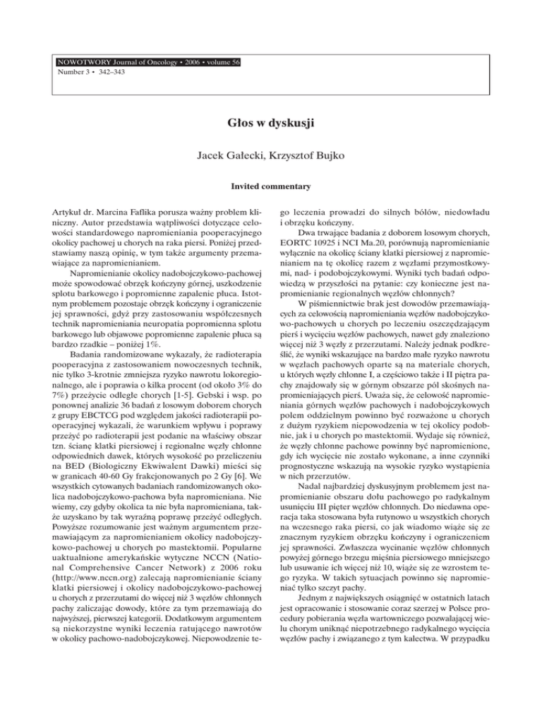 NOWOTWORY Journal of Oncology • 2006 • volume 56 Number 3 • 342–343 G∏os w dyskusji Jacek Ga∏ecki, Krzysztof Bujko Invited commentary Artyku∏ dr. Marcina Faflika porusza wa˝ny problem kliniczny. Autor przedstawia wàtpliwoÊci dotyczàce celowoÊci standardowego napromieniania pooperacyjnego okolicy pachowej u chorych na raka piersi. Poni˝ej przedstawiamy naszà opini´, w tym tak˝e argumenty przemawiajàce za napromienianiem. Napromienianie okolicy nadobojczykowo-pachowej mo˝e spowodowaç obrz´k koƒczyny górnej, uszkodzenie splotu barkowego i popromienne zapalenie p∏uca. Istotnym problemem pozostaje obrz´k koƒczyny i ograniczenie jej sprawnoÊci, gdy˝ przy zastosowaniu wspó∏czesnych technik napromieniania neuropatia popromienna splotu barkowego lub objawowe popromienne zapalenie p∏uca sà bardzo rzadkie – poni˝ej 1%. Badania randomizowane wykaza∏y, ˝e radioterapia pooperacyjna z zastosowaniem nowoczesnych technik, nie tylko 3-krotnie zmniejsza ryzyko nawrotu lokoregionalnego, ale i poprawia o kilka procent (od oko∏o 3% do 7%) prze˝ycie odleg∏e chorych [1-5]. Gebski i wsp. po ponownej analizie 36 badaƒ z losowym doborem chorych z grupy EBCTCG pod wzgl´dem jakoÊci radioterapii pooperacyjnej wykazali, ˝e warunkiem wp∏ywu i poprawy prze˝yç po radioterapii jest podanie na w∏aÊciwy obszar tzn. Êcian´ klatki piersiowej i regionalne w´z∏y ch∏onne odpowiednich dawek, których wysokoÊç po przeliczeniu na BED (Biologiczny Ekwiwalent Dawki) mieÊci si´ w granicach 40-60 Gy frakcjonowanych po 2 Gy [6]. We wszystkich cytowanych badaniach randomizowanych okolica nadobojczykowo-pachowa by∏a napromieniana. Nie wiemy, czy gdyby okolica ta nie by∏a napromieniana, tak˝e uzyskano by tak wyraênà popraw´ prze˝yç odleg∏ych. Powy˝sze rozumowanie jest wa˝nym argumentem przemawiajàcym za napromienianiem okolicy nadobojczykowo-pachowej u chorych po mastektomii. Popularne uaktualnione amerykaƒskie wytyczne NCCN (National Comprehensive Cancer Network) z 2006 roku (http://www.nccn.org) zalecajà napromienianie Êciany klatki piersiowej i okolicy nadobojczykowo-pachowej u chorych z przerzutami do wi´cej ni˝ 3 w´z∏ów ch∏onnych pachy zaliczajàc dowody, które za tym przemawiajà do najwy˝szej, pierwszej kategorii. Dodatkowym argumentem sà niekorzystne wyniki leczenia ratujàcego nawrotów w okolicy pachowo-nadobojczykowej. Niepowodzenie te- go leczenia prowadzi do silnych bólów, niedow∏adu i obrz´ku koƒczyny. Dwa trwajàce badania z doborem losowym chorych, EORTC 10925 i NCI Ma.20, porównujà napromienianie wy∏àcznie na okolic´ Êciany klatki piersiowej z napromienianiem na t´ okolic´ razem z w´z∏ami przymostkowymi, nad- i podobojczykowymi. Wyniki tych badaƒ odpowiedzà w przysz∏oÊci na pytanie: czy konieczne jest napromienianie regionalnych w´z∏ów ch∏onnych? W piÊmiennictwie brak jest dowodów przemawiajàcych za celowoÊcià napromieniania w´z∏ów nadobojczykowo-pachowych u chorych po leczeniu oszcz´dzajàcym pierÊ i wyci´ciu w´z∏ów pachowych, nawet gdy znaleziono wi´cej ni˝ 3 w´z∏y z przerzutami. Nale˝y jednak podkreÊliç, ˝e wyniki wskazujàce na bardzo ma∏e ryzyko nawrotu w w´z∏ach pachowych oparte sà na materiale chorych, u których w´z∏y ch∏onne I, a cz´Êciowo tak˝e i II pi´tra pachy znajdowa∏y si´ w górnym obszarze pól skoÊnych napromieniajàcych pierÊ. Uwa˝a si´, ˝e celowoÊç napromieniania górnych w´z∏ów pachowych i nadobojczykowych polem oddzielnym powinno byç rozwa˝one u chorych z du˝ym ryzykiem niepowodzenia w tej okolicy podobnie, jak i u chorych po mastektomii. Wydaje si´ równie˝, ˝e w´z∏y ch∏onne pachowe powinny byç napromienione, gdy ich wyci´cie nie zosta∏o wykonane, a inne czynniki prognostyczne wskazujà na wysokie ryzyko wystàpienia w nich przerzutów. Nadal najbardziej dyskusyjnym problemem jest napromienianie obszaru do∏u pachowego po radykalnym usuni´ciu III pi´ter w´z∏ów ch∏onnych. Do niedawna operacja taka stosowana by∏a rutynowo u wszystkich chorych na wczesnego raka piersi, co jak wiadomo wià˝e si´ ze znacznym ryzykiem obrz´ku koƒczyny i ograniczeniem jej sprawnoÊci. Zw∏aszcza wycinanie w´z∏ów ch∏onnych powy˝ej górnego brzegu mi´Ênia piersiowego mniejszego lub usuwanie ich wi´cej ni˝ 10, wià˝e si´ ze wzrostem tego ryzyka. W takich sytuacjach powinno si´ napromieniaç tylko szczyt pachy. Jednym z najwi´kszych osiàgni´ç w ostatnich latach jest opracowanie i stosowanie coraz szerzej w Polsce procedury pobierania w´z∏a wartowniczego pozwalajàcej wielu chorym uniknàç niepotrzebnego radykalnego wyci´cia w´z∏ów pachy i zwiàzanego z tym kalectwa. W przypadku 343 zaj´cia w´z∏a wartowniczego standardem jest wyci´cie w´z∏ów pachy. Jednak˝e nie jest wiadome, czy elektywne napromienianie pachy nie oka˝e si´ równie skuteczne przy mniejszym odsetku powik∏aƒ. Na to pytanie odpowiedzà w przysz∏oÊci wyniki badania z losowym doborem chorych pod nazwà AMAROS, które porównuje obie metody post´powania. W dalszym ciàgu w piÊmiennictwie i badaniach w∏asnych potwierdza si´ znany od dawna fakt, ˝e najsilniejszym czynnikiem prognostycznym u chorych po operacji jest zaawansowanie choroby nowotworowej w pasze, mierzone liczbà zaj´tych w´z∏ów ch∏onnych [7-8]. Wiadomo te˝, ˝e o agresywnoÊci nowotworu Êwiadczà inne jego cech kliniczne i biologiczne mi´dzy innymi takie jak: dynamika wzrostu, pT, G, obecnoÊç receptorów estrogenowych i progesteronowych czy nadekspresja receptora HER2. Uwa˝amy wi´c, ˝e jeÊli stwierdza si´ obecnoÊç przerzutów w ponad trzech w´z∏ach ch∏onnych, szczególnie przy obecnoÊci innych cech niekorzystnych rokowniczo, to napromienianie pachy po jej radykalnej operacji mo˝e byç usprawiedliwione, nawet kosztem ryzyka powik∏aƒ. W materiale Centrum Onkologii w Warszawie wÊród 507 chorych napromienianych po maste