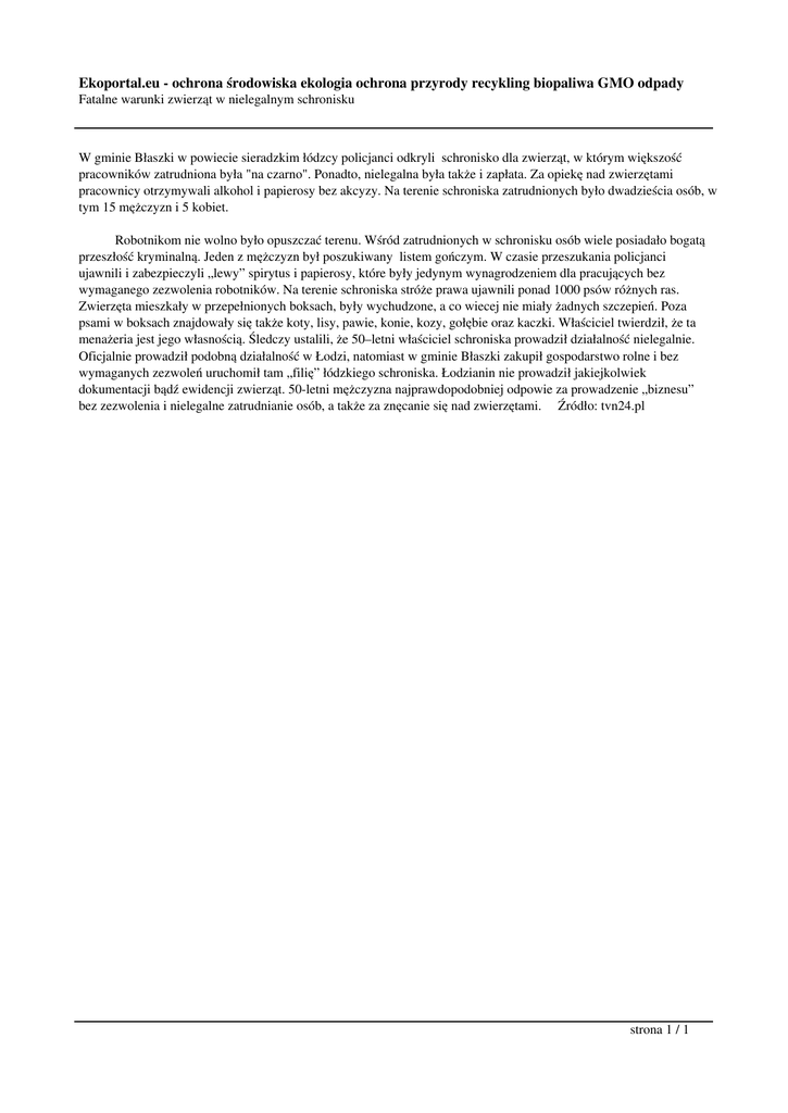 Ekoportal.eu - ochrona środowiska ekologia ochrona przyrody recykling biopaliwa GMO odpady Fatalne warunki zwierząt w nielegalnym schronisku W gminie Błaszki w powiecie sieradzkim łódzcy policjanci odkryli schronisko dla zwierząt, w którym większość pracowników zatrudniona była "na czarno". Ponadto, nielegalna była także i zapłata. Za opiekę nad zwierzętami pracownicy otrzymywali alkohol i papierosy bez akcyzy. Na terenie schroniska zatrudnionych było dwadzieścia osób, w tym 15 mężczyzn i 5 kobiet. Robotnikom nie wolno było opuszczać terenu. Wśród zatrudnionych w schronisku osób wiele posiadało bogatą przeszłość kryminalną. Jeden z mężczyzn był poszukiwany listem gończym. W czasie przeszukania policjanci ujawnili i zabezpieczyli „lewy” spirytus i papierosy, które były jedynym wynagrodzeniem dla pracujących bez wymaganego zezwolenia robotników. Na terenie schroniska stróże prawa ujawnili ponad 1000 psów różnych ras. Zwierzęta mieszkały w przepełnionych boksach, były wychudzone, a co wiecej nie miały żadnych szczepień. Poza psami w boksach znajdowały się także koty, lisy, pawie, konie, kozy, gołębie oraz kaczki. Właściciel twierdził, że ta menażeria jest jego własnością. Śledczy ustalili, że 50–letni właściciel schroniska prowadził działalność nielegalnie. Oficjalnie prowadził podobną działalność w Łodzi, natomiast w gminie Błaszki zakupił gospodarstwo rolne i bez wymaganych zezwoleń uruchomił tam „filię” łódzkiego schroniska. Łodzianin nie prowadził jakiejkolwiek dokumentacji bądź ewidencji zwierząt. 50-letni mężczyzna najprawdopodobniej odpowie za prowadzenie „biznesu” bez zezwolenia i nielegalne zatrudnianie osób, a także za znęcanie się nad zwierzętami. Źródło: tvn24.pl strona 1 / 1