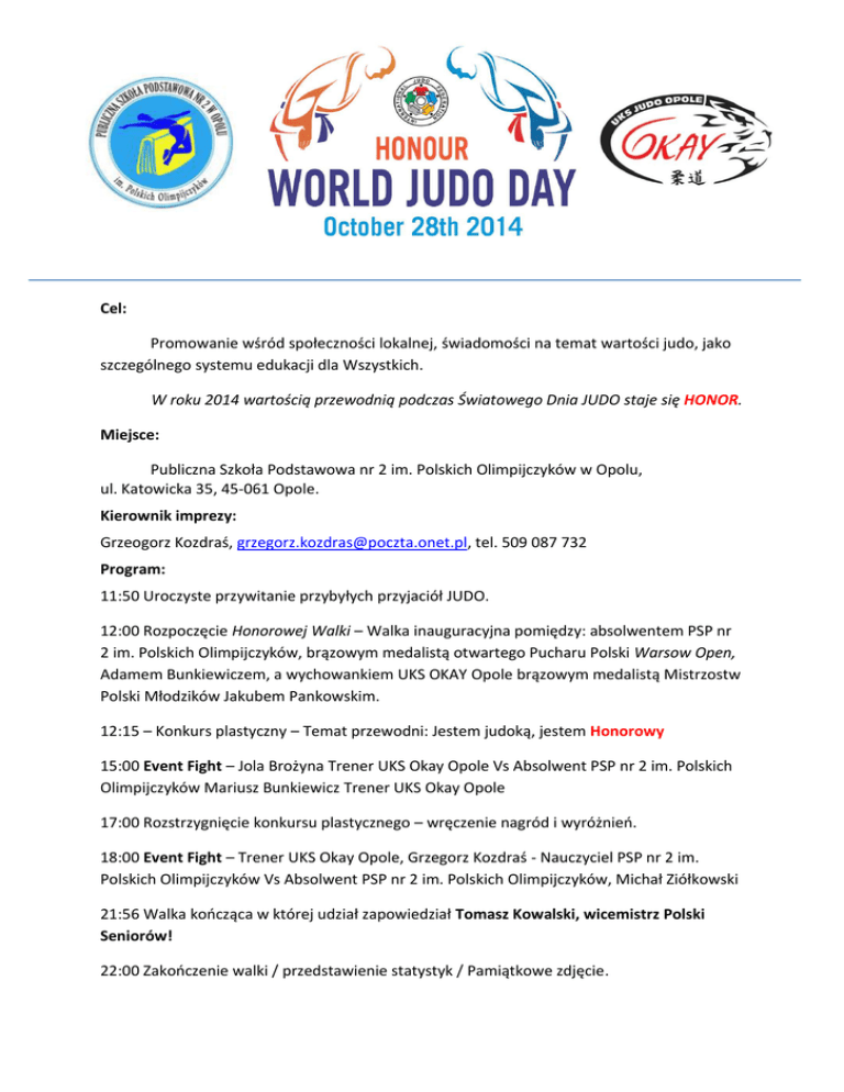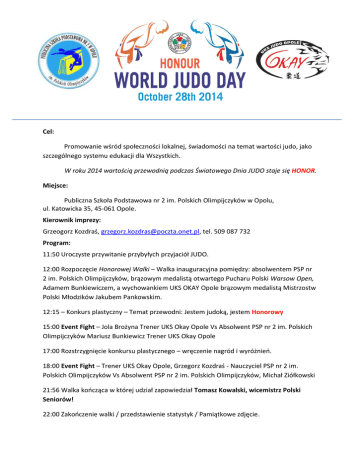 Cel: Promowanie wśród społeczności lokalnej, świadomości na temat wartości judo, jako szczególnego systemu edukacji dla Wszystkich. W roku 2014 wartością przewodnią podczas Światowego Dnia JUDO staje się HONOR. Miejsce: Publiczna Szkoła Podstawowa nr 2 im. Polskich Olimpijczyków w Opolu, ul. Katowicka 35, 45-061 Opole. Kierownik imprezy: Grzeogorz Kozdraś, [email protected], tel. 509 087 732 Program: 11:50 Uroczyste przywitanie przybyłych przyjaciół JUDO. 12:00 Rozpoczęcie Honorowej Walki – Walka inauguracyjna pomiędzy: absolwentem PSP nr 2 im. Polskich Olimpijczyków, brązowym medalistą otwartego Pucharu Polski Warsow Open, Adamem Bunkiewiczem, a wychowankiem UKS OKAY Opole brązowym medalistą Mistrzostw Polski Młodzików Jakubem Pankowskim. 12:15 – Konkurs plastyczny – Temat przewodni: Jestem judoką, jestem Honorowy 15:00 Event Fight – Jola Brożyna Trener UKS Okay Opole Vs Absolwent PSP nr 2 im. Polskich Olimpijczyków Mariusz Bunkiewicz Trener UKS Okay Opole 17:00 Rozstrzygnięcie konkursu plastycznego – wręczenie nagród i wyróżnień. 18:00 Event Fight – Trener UKS Okay Opole, Grzegorz Kozdraś - Nauczyciel PSP nr 2 im. Polskich Olimpijczyków Vs Absolwent PSP nr 2 im. Polskich Olimpijczyków, Michał Ziółkowski 21:56 Walka kończąca w której udział zapowiedział Tomasz Kowalski, wicemistrz Polski Seniorów! 22:00 Zakończenie walki / przedstawienie statystyk / Pamiątkowe zdjęcie. Regulamin uczestnictwa: W Honorowej Walce z okazji Światowego Dnia JUDO, może uczestniczyć każda osoba, która zgłosi się do kierownika Honorowej Walki w stroju judogi, między godziną 12:00 a 21:30. Wymogiem udziału jest odbycie przed walką rozgrzewki w strefie rozgrzewkowej, oraz wyrażenie zgody na wykonanie fotografii, z której zostanie stworzony społeczny POSTER JUDO. Osoby niepełnoletnie, chcąc wziąć udział w Honorowej Walce, muszą podczas walki być pod opieką rodziców/opiekunów, lub posiadać pisemną zgodę na udział w walce. Zasady walki: Honorowa Walka rozgrywa się pomiędzy zawodnikami reprezentującymi drużynę białych i czerwonych. Walka trwa 4 minuty, przy czym zawodnicy zmieniają się na zmianę, raz biali, raz czerwoni co 2 minuty. Walka toczy się w tachi waza, jak i również w ne waza z wyłączeniem technik duszeń oraz dźwigni. Ippon nie kończy walki, ani nie wymusza zmiany zawodnika. Zmiana zawodnika następuje w ciągu 10 sekund od zakończenia cyklu 4 minut z wyjątkiem pierwszej i ostatniej walki, które będą trwały dla jednego z walczących 2 minuty. Nagrody i upominki: Każdy uczestnik walki otrzyma pamiątkowy CERTYFIKAT potwierdzający udział w Honorowej Walce z okazji Światowego Dnia Judo 2014; słodki poczęstunek. Wszyscy uczestnicy konkursu plastycznego otrzymają CERTYFIKATY uczestnictwa w Światowym Dniu JUDO 2014. Laureaci konkursu plastycznego oprócz certyfikatu otrzymają nagrody rzeczowe. Opieka medyczna: Podczas trwania całej Honorowej Walki obecny będzie ratownik medyczny.
