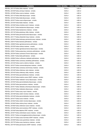 Produkty Cena (brutto) Cena (netto) REVELL 32115 Farba żółta matowa - emalia 5,90 zł 4,80 zł REVELL 32109 Farba antracyt matowa - emalia 5,90 zł 4,80 zł REVELL 32108 Farba czarna matowa - emalia 5,90 zł 4,80 zł REVELL 32112 Farba żółta błyszcząca - emalia 5,90 zł 4,80 zł REVELL 32104 Farba biała błyszcząca - emalia 5,90 zł 4,80 zł REVELL 32107 Farba czarna błyszcząca - emalia 5,90 zł 4,80 zł REVELL 32105 Farba biała matowa - emalia 5,90 zł 4,80 zł REVELL 32106 Farba smolista czerń matowa - emalia 5,90 zł 4,80 zł REVELL 32101 Farba bezbarwna błyszcząca - emalia 5,90 zł 4,80 zł REVELL 32102 Farba bezbarwna matowa - emalia 5,90 zł 4,80 zł REVELL 32116 Farba piaskowy żółty matowy - emalia 5,90 zł 4,80 zł REVELL 32130 Farba pomarańczowa błyszcząca - emalia 5,90 zł 4,80 zł REVELL 32117 Farba afrykański brąz matowa - emalia 5,90 zł 4,80 zł REVELL 32125 Farba świecący pomarańczowy matowa - emalia 5,90 zł 4,80 zł REVELL 32314 Farba beżowa półmatowa - emalia 5,90 zł 4,80 zł REVELL 32330 Farba ognistoczerwona półmatowa - emalia 5,90 zł 4,80 zł REVELL 32135 Farba cielista matowa - emalia 5,90 zł 4,80 zł REVELL 32131 Farba ognistoczerwona błyszcząca - emalia 5,90 zł 4,80 zł REVELL 32331 Farba purpurowy czerwony półmatowa - emalia 5,90 zł 4,80 zł REVELL 32134 Farba czerwona Ferrari błyszcząca - emalia 5,90 zł 4,80 zł REVELL 32301 Farba biała półmatowa - emalia 5,90 zł 4,80 zł REVELL 32350 Farba Lufthansa niebieski półmatowa - emalia 5,90 zł 4,80 zł REVELL 32332 Farba czerwony świetlisty półmatowa - emalia 5,90 zł 4,80 zł REVELL 32140 Farba czarno-zielona matowa - emalia 5,90 zł 4,80 zł REVELL 32137 Farba czerwonobrązowa matowa - emalia 5,90 zł 4,80 zł REVELL 32136 Farba czerwony karminowy matowa - emalia 5,90 zł 4,80 zł REVELL 32146 Farba oliwkowy nato matowa - emalia 5,90 zł 4,80 zł REVELL 32142 Farba oliwkowy żółty matowa - emalia 5,90 zł 4,80 zł REVELL 32145 Farba jasnooliwkowa matowa - emalia 5,90 zł 4,80 zł REVELL 32143 Farba średnio szara USAF matowa - emalia 5,90 zł 4,80 zł REVELL 32154 Farba niebieski nocny błyszcząca - emalia 5,90 zł 4,80 zł REVELL 32150 Farba jasnoniebieska błyszcząca - emalia 5,90 zł 4,80 zł REVELL 32155 Farba jasnozielona matowa - emalia 5,90 zł 4,80 zł REVELL 32151 Farba nibieska ultramaryna błyszcząca - emalia 5,90 zł 4,80 zł REVELL 32152 Farba niebieska błyszcząca - emalia 5,90 zł 4,80 zł REVELL 32147 Farba szary mysi matowa - emalia 5,90 zł 4,80 zł REVELL 32148 Farba zieleń morska matowa - emalia 5,90 zł 4,80 zł REVELL 32149 Farba jasnoniebieska matowa - emalia 5,90 zł 4,80 zł REVELL 32157 Farba szara matowa - emalia 5,90 zł 4,80 zł REVELL 32162 Farba zieleń morska błyszcząca - emalia 5,90 zł 4,80 zł REVELL 32165 Farba zielony brąz matowa - emalia 5,90 zł 4,80 zł REVELL 32166 Farba oliwkowo-szara matowa - emalia 5,90 zł 4,80 zł REVELL 32168 Farba ciemnozielony RAF matowa - emalia 5,90 zł 4,80 zł REVELL 32159 Farba błękitna RAF matowa - emalia 5,90 zł 4,80 zł REVELL 32167 Farba zielonkawo-szara matowa - emalia 5,90 zł 4,80 zł REVELL 32161 Farba szmaragdowozielona błyszcząca - emalia 5,90 zł 4,80 zł REVELL 32174 Farba szara Gunship USAF matowa - emalia 5,90 zł 4,80 zł REVELL 32169 Farba szary granitowy matowa - emalia 5,90 zł 4,80 zł REVELL 32175 Farba szary kamienny matowa - emalia 5,90 zł 4,80 zł REVELL 32176 Farba jasnoszara USAF matowa - emalia 5,90 zł 4,80 zł Cena promocyjna REVELL 32178 Farba szary czołgowy matowa - emalia 5,90 zł 4,80 zł REVELL 32177 Farba szary zakurzony matowa - emalia 5,90 zł 4,80 zł REVELL 32184 Farba skórzany brązowy matowa - emalia 5,90 zł 4,80 zł REVELL 32179 Farba szaroniebieska matowa - emalia 5,90 zł 4,80 zł REVELL 32185 Farba brązowa matowa - emalia 5,90 zł 4,80 zł REVELL 32182 Farba ziemisty ciemny RAF matowa - emalia 5,90 zł 4,80 zł REVELL 32180 Farba błotnistobrązowa błyszcząca - emalia 5,90 zł 4,80 zł REVELL 32188 Farba ochra-brązowy matowa - emalia 5,90 zł 4,80 zł REVELL 32186 Farba oliwkowo-brązowy matowa - emalia 5,90 zł 4,80 zł REVELL 32187 Farba ziemisty brązowy matowa - emalia 5,90 zł 4,80 zł REVELL 32195 Farba brązowa metaliczna - emalia 5,90 zł 4,80 zł REVELL 32199 Farba aluminiowa metaliczna - emalia 5,90 zł 4,80 zł REVELL 32194 Farba złota metaliczna - emalia 5,90 zł 4,80 zł REVELL 32191 Farba stalowa metaliczna - emalia 5,90 zł 4,80 zł REVELL 32190 Farba srebrna metaliczna - emalia 5,90 zł 4,80 zł REVELL 32189 Farba beżowa matowa - emalia 5,90 zł 4,80 zł REVELL 32193 Farba miedziana metaliczna - emalia 5,90 zł 4,80 zł REVELL 32192 Farba mosiądz metaliczna - emalia 5,90 zł 4,80 zł REVELL 32302 Farba czarna półmatowa - emalia 5,90 zł 4,80 zł REVELL 32312 Farba świecący żółty półmatowa - emalia 5,90 zł 4,80 zł REVELL 32310 Farba Lufthansa żółty półmatowa - emalia 5,90 zł 4,80 zł REVELL 32360 Farba zieleń paproci półmatowa - emalia 5,90 zł 4,80 zł REVELL 32361 Farba zielony oliwkowy pólmatowa - emalia 5,90 zł 4,80 zł REVELL 32362 Farba szarozielona półmatowa - emalia 5,90 zł 4,80 zł REVELL 32374 Farba szara półmatowa - emalia 5,90 zł 4,80 zł REVELL 32371 Farba jasnoszara półmatowa - emalia 5,90 zł 4,80 zł REVELL 32363 Farba ciemnozielona półmatowa - emalia 5,90 zł 4,80 zł REVELL 32364 Farba zielony liść półmatowa - emalia 5,90 zł 4,80 zł REVELL 32365 Farba zielona patynowa półmatowa - emalia 5,90 zł 4,80 zł REVELL 32730 Farba pomarańczowa przezroczysta - emalia 5,90 zł 4,80 zł REVELL 32731 Farba czerwona przezroczysta - emalia 5,90 zł 4,80 zł REVELL 32752 Farba niebieska przezroczysta - emalia 5,90 zł 4,80 zł REVELL 32381 Farba brązowa półmatowa - emalia 5,90 zł 4,80 zł REVELL 32139 Farba ciemna zielona matowa - emalia 5,90 zł 4,80 zł REVELL 32156 Farba niebieska matowa - emalia 5,90 zł 4,80 zł REVELL 32183 Farba rdzawa matowa - emalia 5,90 