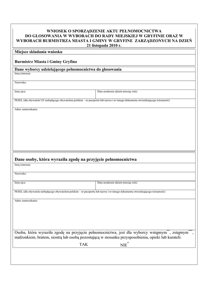 WNIOSEK O SPORZĄDZENIE AKTU PEŁNOMOCNICTWA DO GŁOSOWANIA W WYBORACH DO RADY MIEJSKIEJ W GRYFINIE ORAZ W WYBORACH BURMISTRZA MIASTA I GMINY W GRYFINE ZARZĄDZONYCH NA DZIEŃ 21 listopada 2010 r. Miejsce składania wniosku Burmistrz Miasta i Gminy Gryfino Dane wyborcy udzielającego pełnomocnictwa do głosowania Imię (imiona): Nazwisko: Imię ojca: Data urodzenie (dzień-miesiąc-rok): PESEL (dla obywatela UE niebędącego obywatelem polskim – nr paszportu lub nazwa i nr innego dokumentu stwierdzającego tożsamość): Adres zamieszkania: Dane osoby, która wyraziła zgodę na przyjęcie pełnomocnictwa Imię (imiona): Nazwisko: Imię ojca: Data urodzenie (dzień-miesiąc-rok): PESEL (dla obywatela niebędącego obywatelem polskim – nr paszportu lub nazwa i nr innego dokumentu stwierdzającego tożsamość): Adres zamieszkania: Osoba, która wyraziła zgodę na przyjęcie pełnomocnictwa, jest dla wyborcy wstępnym**, zstępnym***, małżonkiem, bratem, siostrą lub osobą pozostającą w stosunku przysposobienia, opieki lub kurateli: TAK * NIE Do wniosku załączono: 1. pisemną zgodę osoby, która wyraziła zgodę na przyjęcie pełnomocnictwa; 2. kopię aktualnego orzeczenia właściwego organu orzekającego o ustaleniu stopnia niepełnosprawności wyborcy, a w przypadku obywatela UE niebędącego obywatelem polskim tłumaczenie przysięgłe aktualnego dokumentu potwierdzającego uznanie za osobę o znacznym lub umiarkowanym stopniu niepełnosprawności (nie dotyczy wyborców, którzy najpóźniej w dniu głosowania kończą 75 lat); 3. kopię dokumentu potwierdzającego pozostawanie wyborcy z osobą, która wyraziła zgodę na przyjęcie pełnomocnictwa, w stosunku przysposobienia/opieki/kurateli (załącza się wyłącznie w przypadku, gdy taki stosunek istnieje). Miejsce sporządzenia aktu pełnomocnictwa do głosowania (wypełnić jedynie w przypadku gdy ma być ono inne niż miejsce zamieszkania wyborcy udzielającego pełnomocnictwa do głosowania): Oświadczenia Oświadczam, że wszystkie dane zawarte we wniosku są zgodne z prawdą. Wyborca wyraża zgodę na to, by w postępowaniu w sprawie sporządzenia aktu pełnomocnictwa do głosowania był reprezentowany przez osobę , która wyraziła zgodę na przyjęcie pełnomocnictwa: TAK * NIE Wyborca nie może lub nie umie złożyć podpisu: TAK * NIE Data wypełnienia (dzień-miesiąc-rok): - - Podpis wyborcy (w przypadku gdy wyborca nie może lub nie umie złożyć podpisu, w miejscu tym podpis składa osoba, która wyraziła zgodę na przyjęcie pełnomocnictwa): Pouczenie W wyborach wójta, burmistrza, prezydenta miasta akt pełnomocnictwa do głosowania sporządzony: - przed dniem pierwszego głosowania (tzw. I tura) uprawnia również do oddania głosu w głosowaniu ponownym (tzw. II tura), jeżeli zostanie ono przeprowadzone; - po dniu pierwszego głosowania uprawnia wyłącznie do oddania głosu w głosowaniu ponownym (tzw. II tura), o ile zostanie ono przeprowadzone. W przypadku udzielenia pełnomocnictwa do głosowania przez obywatela UE niebędącego obywatelem polskim, pełnomocnictwo nie obejmuje wyborów do rady powiatu i wyborów do sejmiku województwa. Adnotacje urzędowe Numer wniosku: Uwagi: Podpis przyjmującego wniosek: * Niepotrzebne skreślić. ** Wstępnym jest ojciec, matka, dziadek, babka, itd. *** Zstępnym jest syn, córka, wnuk, wnuczka, itd.