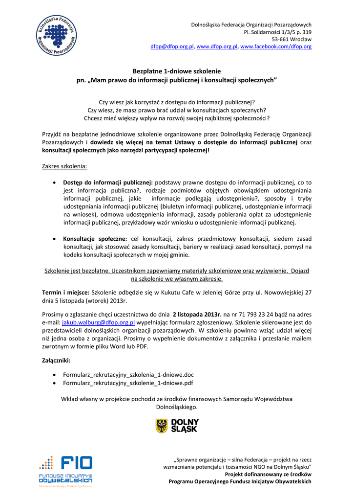 Dolnośląska Federacja Organizacji Pozarządowych Pl. Solidarności 1/3/5 p. 319 53-661 Wrocław [email protected], www.dfop.org.pl, www.facebook.com/dfop.org Bezpłatne 1-dniowe szkolenie pn. „Mam prawo do informacji publicznej i konsultacji społecznych” Czy wiesz jak korzystać z dostępu do informacji publicznej? Czy wiesz, że masz prawo brać udział w konsultacjach społecznych? Chcesz mieć większy wpływ na rozwój swojej najbliższej społeczności? Przyjdź na bezpłatne jednodniowe szkolenie organizowane przez Dolnośląską Federację Organizacji Pozarządowych i dowiedz się więcej na temat Ustawy o dostępie do informacji publicznej oraz konsultacji społecznych jako narzędzi partycypacji społecznej! Zakres szkolenia: Dostęp do informacji publicznej: podstawy prawne dostępu do informacji publicznej, co to jest informacja publiczna?, rodzaje podmiotów objętych obowiązkiem udostępniania informacji publicznej, jakie informacje podlegają udostępnieniu?, sposoby i tryby udostępniania informacji publicznej (biuletyn informacji publicznej, udostępnianie informacji na wniosek), odmowa udostępnienia informacji, zasady pobierania opłat za udostępnienie informacji publicznej, przykładowy wzór wniosku o udostępnienie informacji publicznej. Konsultacje społeczne: cel konsultacji, zakres przedmiotowy konsultacji, siedem zasad konsultacji, jak stosować zasady konsultacji, bariery w realizacji zasad konsultacji, pomysł na kodeks konsultacji społecznych w mojej gminie. Szkolenie jest bezpłatne. Uczestnikom zapewniamy materiały szkoleniowe oraz wyżywienie. Dojazd na szkolenie we własnym zakresie. Termin i miejsce: Szkolenie odbędzie się w Kukutu Cafe w Jeleniej Górze przy ul. Nowowiejskiej 27 dnia 5 listopada (wtorek) 2013r. Prosimy o zgłaszanie chęci uczestnictwa do dnia 2 listopada 2013r. na nr 71 793 23 24 bądź na adres e-mail: [email protected] wypełniając formularz zgłoszeniowy. Szkolenie skierowane jest do przedstawicieli dolnośląskich organizacji pozarządowych. W szkoleniu powinna wziąć udział więcej niż jedna osoba z organizacji. Prosimy o wypełnienie dokumentów z załącznika i przesłanie mailem zwrotnym w formie pliku Word lub PDF. Załączniki: Formularz_rekrutacyjny_szkolenia_1-dniowe.doc Formularz_rekrutacyjny_szkolenie_1-dniowe.pdf Wkład własny w projekcie pochodzi ze środków finansowych Samorządu Województwa Dolnośląskiego. „Sprawne organizacje – silna Federacja – projekt na rzecz wzmacniania potencjału i tożsamości NGO na Dolnym Śląsku” Projekt dofinansowany ze środków Programu Operacyjnego Fundusz Inicjatyw Obywatelskich