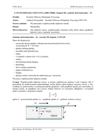 57OF_III_D KOOF Szczecin: www.of.szc.pl LVII OLIMPIADA FIZYCZNA (2007/2008). Stopień III, zadanie doświadczalne − D Źródło: Komitet Główny Olimpiady Fizycznej. Autor: Andrzej Wysmołek – Komitet Główny Olimpiady Fizycznej, IFD UW. Nazwa zadania: Wyznaczanie współczynnika lepkości miodu. Działy: Mechanika Słowa kluczowe: siła, lepkość, tarcie, współczynnik, moment, ruch, obrót, okres, prędkość, kątowa, ciecz, ciężarek, soczewka Zadanie doświadczalne − D, zawody III stopnia, LVII OF. Masz do dyspozycji: − soczewkę dwuwypukłą o identycznych promieniach krzywizny wynoszących R = 165 mm, − płaską szklaną płytkę, − kawałek rurki plastikowej, − nitkę, − 3 ciężarki o masie (4,6 ± 0,1) g każdy, − stoper, − dwustronną taśmę klejącą, − plastelinę, − dwie szklane probówki, − papier milimetrowy, − linijkę, − płynny miód z łyżeczką do nabierania go z naczynia. Wyznacz współczynnik lepkości miodu. Uwaga: Współczynnik lepkości cieczy η można zdefiniować poprzez wzór wiążący siłę F potrzebną do podtrzymania jednostajnego ruchu płytki nakrywającej warstwę cieczy o niewielkiej (w porównaniu z rozmiarami płytki) grubości. Jeśli prędkość płytki jest niewielka, to można uznać, że prędkość v(x) cieczy maleje liniowo ze wzrostem odległości x od płytki (patrz rysunek) i zachodzi związek: F v =η 0 S d gdzie S – powierzchnia płytki, v0 – prędkość płytki, d – grubość warstwy cieczy. v0 x F v(x) d ciecz Red. Tadeusz. M. Molenda, IF US, 2010 – 1 /7 – www.dydaktyka.fizyka.szc.pl 57OF_III_D KOOF Szczecin: www.of.szc.pl Rozwiązanie Część teoretyczna Rozwiązanie zadania wymaga zbudowania układu eksperymentalnego, w którym można byłoby badać jednostajny ruch jakiegoś przedmiotu przylegającego do warstewki miodu. Taki warunek spełnia układ przedstawiony schematycznie na rys. 1. Układ zestawić można w następujący sposób. Używając dwustronnej taśmy klejącej do soczewki mocujemy centrycznie rurkę plastikową. Na rurkę nawijamy nitkę, z przymocowanymi na dwóch końcach ciężarkami. Płytkę szklaną kładziemy na stole tak, aby jej część o długości kilku centymetrów wystawała poza krawędź stołu. Następnie na środek wystającej poza krawędź stołu części płytki nakładamy niewielką ilość miodu i umieszczamy w nim centralnie soczewkę. Dociskamy soczewkę do powierzchni płytki. Na brzegach płytki mocujemy przy użyciu plasteliny plastikowe kołki i przeciągamy przez nie końce nitki z ciężarkami. Zwisające ciężarki naciągają końce nitki i powodują, że soczewka zaczyna się obracać. W chwili, gdy ustali się równowaga pomiędzy momentem siły ciężkości i momentem siły lepkości oraz oporami ruchu wynikającymi z tarcia nitki o powierzchnie probówek, ciężarki zaczynają poruszać się ruchem jednostajnym. Najtrudniejszy element rozwiązania zadania polega na znalezieniu związku pomiędzy prędkością obrotową soczewki a wartością współczynnika lepkości miodu. plastikowy walec probówka soczewka płytka szklana nitka ciężarek ciężarek Rys. 1 Załóżmy, że potrafimy tak uformować miód pod soczewką, że zajmie on wnętrze koła o promieniu rm. Prędkość kątowa soczewki ω ustala się w warunkach, gdy moment sił lepkości miodu jest równy momentowi siły ciężkości pomniejszonej o siłę tarcia nitek o powierzchnię probówek: Mc = 2mgRk – 2FT, (1) gdzie Rk – promień rurki przyklejonej do soczewki, m – masa obciążnika, g – przyspieszenie ziemskie, FT – siła tarcia nitki o probówkę. Żeby znaleźć wyrażenie na moment sił lepkości działający na soczewkę, podzielmy w myśli obszar miodu na pierścienie o promieniu r i niewielkiej szerokości Δr. Red. Tadeusz. M. Molenda, IF US, 2010 – 2 /7 – www.dydaktyka.fizyka.szc.pl 57OF_III_D KOOF Szczecin: www.of.szc.pl R Rk r d Δr rm Rys. 2 Grubość warstwy miodu d w odległości r od osi obrotu jest określona związkiem (patrz rys. 2): (R − d )2 + r 2 = R2 , (2) (2 R + d )d = r 2 . (3) co można zapisać w postaci Ponieważ w rozważanej sytuacji spełniony jest warunek R >> d, to po lewej stronie równania (3) możemy pominąć d w nawiasie i otrzymujemy: d= r2 2R (4) Przyczynek ΔF do siły oporu tarcia lepkiego pomiędzy miodem i soczewką dla rozważanego pierścienia wyniesie więc: Δ F = η ΔS v0 ωr 2 R ΔS ω , = η ΔS 2 2 R = η d r r (5) zaś moment siły lepkości względem osi obrotu: ΔM = ΔF r = 2 RΔSω r = 2η R ΔSω r (6) Warto zauważyć, że przyczynek do momentu siły lepkości pochodzący od pierścienia nie zależy od jego średnicy! Zatem sumaryczny moment sił lepkości zależy tylko od całkowitej powierzchni warstwy miodu S = πr 2 i wyniesie: M = 2η RSω = 2η R π rm2ω . (7) Z porównania wyrażeń (1) oraz (7) wynika, że w sytuacji gdy mamy do czynienia z jednostajnym obrotem soczewki zachodzi związek: 2η Rπ rm2ω = 2(mg − FT ) Rk . Red. Tadeusz. M. Molenda, IF US, 2010 – 3 /7 – (8) www.dydaktyka.fizyka.szc.pl 57OF_III_D KOOF Szczecin: www.of.szc.pl Prędkość kątową soczewki ω = 2π/T można wyznaczyć mierząc okres jej obrotu T. Rozważmy najpierw sytuację, gdy siły tarcia nitki o powierzchnie probówek są znikomo małe. Wtedy związek (8) można przedstawić w postaci: 4π 2η R 2 T= rm . 2mgRk (9) Zatem okres obrotu soczewki powinien być liniową funkcją kwadratu promienia obszaru miodu stykającego się z soczewką: T = α rm2 , (10) 2π 2 R η. mgRk Po wykonaniu pomiarów czasu obrotu soczewki dla kilku różnych ilości miodu pod so2 czewką wystarczy więc sporządzić wykres zależności T ( rm ) i następnie po dopasowaniu prostej wyznaczyć współczynnik lepkości η. Dyskusją wpływu sił tarcia na uzyskane wyniki zajmiemy w części doświadczalnej. gdzie α = Część doświadczalna Pomiary wykonano w układzie przedstawionym na rys. 1. Okres obrotu soczewki, dla 