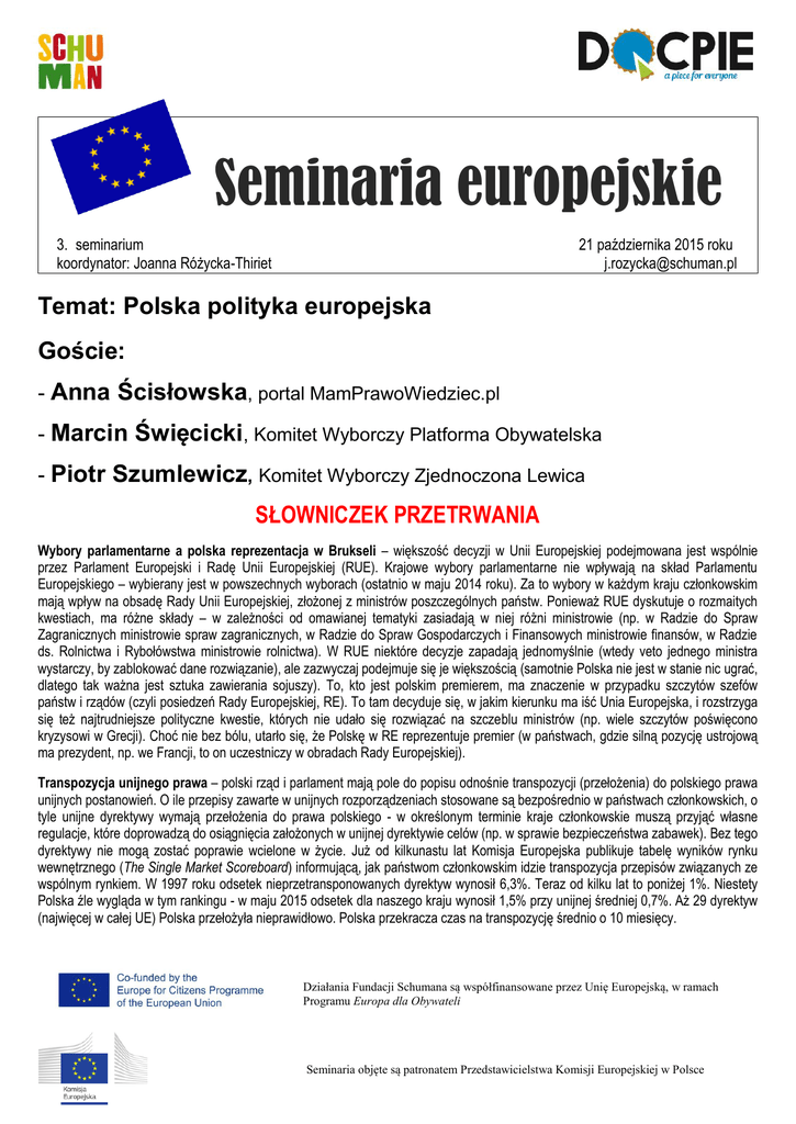 Seminaria europejskie 3. seminarium koordynator: Joanna Różycka-Thiriet 21 października 2015 roku [email protected] Temat: Polska polityka europejska Goście: - Anna Ścisłowska, portal MamPrawoWiedziec.pl - Marcin Święcicki, Komitet Wyborczy Platforma Obywatelska - Piotr Szumlewicz, Komitet Wyborczy Zjednoczona Lewica SŁOWNICZEK PRZETRWANIA Wybory parlamentarne a polska reprezentacja w Brukseli – większość decyzji w Unii Europejskiej podejmowana jest wspólnie przez Parlament Europejski i Radę Unii Europejskiej (RUE). Krajowe wybory parlamentarne nie wpływają na skład Parlamentu Europejskiego – wybierany jest w powszechnych wyborach (ostatnio w maju 2014 roku). Za to wybory w każdym kraju członkowskim mają wpływ na obsadę Rady Unii Europejskiej, złożonej z ministrów poszczególnych państw. Ponieważ RUE dyskutuje o rozmaitych kwestiach, ma różne składy – w zależności od omawianej tematyki zasiadają w niej różni ministrowie (np. w Radzie do Spraw Zagranicznych ministrowie spraw zagranicznych, w Radzie do Spraw Gospodarczych i Finansowych ministrowie finansów, w Radzie ds. Rolnictwa i Rybołówstwa ministrowie rolnictwa). W RUE niektóre decyzje zapadają jednomyślnie (wtedy veto jednego ministra wystarczy, by zablokować dane rozwiązanie), ale zazwyczaj podejmuje się je większością (samotnie Polska nie jest w stanie nic ugrać, dlatego tak ważna jest sztuka zawierania sojuszy). To, kto jest polskim premierem, ma znaczenie w przypadku szczytów szefów państw i rządów (czyli posiedzeń Rady Europejskiej, RE). To tam decyduje się, w jakim kierunku ma iść Unia Europejska, i rozstrzyga się też najtrudniejsze polityczne kwestie, których nie udało się rozwiązać na szczeblu ministrów (np. wiele szczytów poświęcono kryzysowi w Grecji). Choć nie bez bólu, utarło się, że Polskę w RE reprezentuje premier (w państwach, gdzie silną pozycję ustrojową ma prezydent, np. we Francji, to on uczestniczy w obradach Rady Europejskiej). Transpozycja unijnego prawa – polski rząd i parlament mają pole do popisu odnośnie transpozycji (przełożenia) do polskiego prawa unijnych postanowień. O ile przepisy zawarte w unijnych rozporządzeniach stosowane są bezpośrednio w państwach członkowskich, o tyle unijne dyrektywy wymają przełożenia do prawa polskiego - w określonym terminie kraje członkowskie muszą przyjąć własne regulacje, które doprowadzą do osiągnięcia założonych w unijnej dyrektywie celów (np. w sprawie bezpieczeństwa zabawek). Bez tego dyrektywy nie mogą zostać poprawie wcielone w życie. Już od kilkunastu lat Komisja Europejska publikuje tabelę wyników rynku wewnętrznego (The Single Market Scoreboard) informującą, jak państwom członkowskim idzie transpozycja przepisów związanych ze wspólnym rynkiem. W 1997 roku odsetek nieprzetransponowanych dyrektyw wynosił 6,3%. Teraz od kilku lat to poniżej 1%. Niestety Polska źle wygląda w tym rankingu - w maju 2015 odsetek dla naszego kraju wynosił 1,5% przy unijnej średniej 0,7%. Aż 29 dyrektyw (najwięcej w całej UE) Polska przełożyła nieprawidłowo. Polska przekracza czas na transpozycję średnio o 10 miesięcy. Działania Fundacji Schumana są współfinansowane przez Unię Europejską, w ramach Programu Europa dla Obywateli Seminaria objęte są patronatem Przedstawicielstwa Komisji Europejskiej w Polsce Pozycja parlamentów narodowych w UE – po pierwsze parlamenty narodowe mają prawo do informacji. Np. trafiają do nich nie tylko projekty nowych unijnych aktów prawnych, ale także tzw. białe i zielone księgi, komunikaty i roczny program prac legislacyjnych Komisji Europejskiej, otrzymują też informacje o wnioskach o przystąpienie do Unii Europejskiej. Ponadto parlamentom narodowym przysługuje prawo sprzeciwu wobec projektów aktów prawnych przygotowanych przez Komisję Europejską. Parlamenty badają, czy projekty te nie naruszają tzw. zasady pomocniczości, czyli czy UE nie zabiera się za uregulowanie czegoś, co mogłoby być z pożytkiem uregulowane przez same państwa członkowskie. W Polsce projekty unijnych aktów prawnych oceniają pod tym kątem komisje zajmujące się kwestiami europejskimi w Sejmie i w Senacie. Polski Sejm był np. przeciwny propozycji Komisji w sprawie parytetu kobiet i mężczyzn na kierowniczych stanowiskach w spółkach. Jeśli taki sprzeciw wyrazi 1/3 parlamentów narodowych UE, Komisja może wycofać, zmienić lub podtrzymać dany projekt i uzasadnia jednocześnie swoje stanowisko. Jeśli protestowała zwykła większość parlamentów, o kontynuacji prac nad danym projektem rozstrzygają Rada UE i Parlament Europejski. Jeżeli parlamenty narodowe uważają akt prawny za sprzeczny z zasadą pomocniczości, mogą go także zaskarżyć do Trybunału Sprawiedliwości Unii Europejskiej. Parlamentarzyści w krajach członkowskich powinni umieć korzystać z powyższych instrumentów zamiast marudzić, że Bruksela narzuca krajom członkowskim bezsensowne regulacje. INTERNET, CZYLI CO W TRWIE PISZCZY Jeśli jeszcze nie wiesz na kogo głosować, skorzystaj z pomocy oferowanej przez różne portale internetowe. Latarnik Wyborczy (http://www.latarnikwyborczy.pl) opracowywany jest przez Centrum Edukacji Obywatelskiej (CEO) od 2005 roku. Odpowiadając na 20 pytań z różnych dziedzin (np. na temat wejścia Polski do strefy euro, zmiany ustawy aborcyjnej, kwoty wolnej od podatku) otrzymujemy analizę zbieżności swoich poglądów do programem poszczególnych komitetów wyborczych. Na nieco innej metodologii oparty jest Barometr Wyborczy (http://www.barometrwyborczy.pl), który został opracowany przez ekspertów i pracowników naukowych uczelni wyższych. Najpierw trzeba określić m.in. swoją płeć, wiek i wykształcenie, następnie odpowiedzieć na pytania dotyczące programów, a na koniec jeszcze ulokować swoje poglądy na osi lewicowy-prawicowy oraz liberalnykonserwatywny Zbliża się dzień wyb
