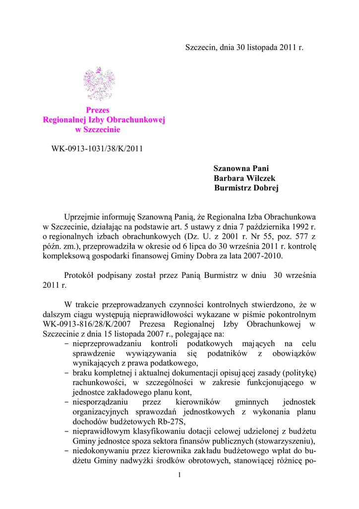 Szczecin, dnia 30 listopada 2011 r. Prezes Regionalnej Izby Obrachunkowej w Szczecinie WK-0913-1031/38/K/2011 Szanowna Pani Barbara Wilczek Burmistrz Dobrej Uprzejmie informuję Szanowną Panią, że Regionalna Izba Obrachunkowa w Szczecinie, działając na podstawie art. 5 ustawy z dnia 7 października 1992 r. o regionalnych izbach obrachunkowych (Dz. U. z 2001 r. Nr 55, poz. 577 z późn. zm.), przeprowadziła w okresie od 6 lipca do 30 września 2011 r. kontrolę kompleksową gospodarki finansowej Gminy Dobra za lata 2007-2010. Protokół podpisany został przez Panią Burmistrz w dniu 30 września 2011 r. W trakcie przeprowadzanych czynności kontrolnych stwierdzono, że w dalszym ciągu występują nieprawidłowości wykazane w piśmie pokontrolnym WK-0913-816/28/K/2007 Prezesa Regionalnej Izby Obrachunkowej w Szczecinie z dnia 15 listopada 2007 r., polegające na: - nieprzeprowadzaniu kontroli podatkowych mających na celu sprawdzenie wywiązywania się podatników z obowiązków wynikających z prawa podatkowego, - braku kompletnej i aktualnej dokumentacji opisuj ącej zasady (politykę) rachunkowości, w szczególności w zakresie funkcjonującego w jednostce zakładowego planu kont, - niesporządzaniu przez kierowników gminnych jednostek organizacyjnych sprawozdań jednostkowych z wykonania planu dochodów budżetowych Rb-27S, - nieprawidłowym klasyfikowaniu dotacji celowej udzielonej z budżetu Gminy jednostce spoza sektora finansów publicznych (stowarzyszeniu), - niedokonywaniu przez kierownika zakładu budżetowego wpłat do budżetu Gminy nadwyżki środków obrotowych, stanowiącej różnicę po1 - - między faktycznym a planowanym stanem środków obrotowych na koniec roku, nieprawidłowym ustalaniu wysokości dodatkowego wynagrodzenia rocznego, nieprawidłowym naliczaniu odpisu na Zakładowy Fundusz Świadczeń socjalnych i nienaliczaniu odpisu w odniesieniu do pracowników zatrudnionych w ramach robót publicznych i prac interwencyjnych, niezabezpieczaniu w budżecie Gminy wystarczających środków finansowych na realizację inwestycji, nieprawidłowym prowadzeniu ewidencji księgowej w odniesieniu do realizowanych inwestycji, niewłaściwym prowadzeniu kont rozrachunkowych, ujmowaniu w ewidencji księgowej kosztów dotyczących innego okresu sprawozdawczego, nieterminowym ujmowaniu zmian w stanie i wartości środków trwałych, nieprzeprowadzaniu inwentaryzacji pozostałych środków trwałych. W przypadku powtórzenia się tego rodzaju sytuacji będę zmuszony wdrożyć postępowanie opisane w art. 27 ustawy o regionalnych izbach obrachunkowych. Z ustaleń zawartych w protokole wynika, że w okresie objętym kontrolą miały miejsce następujące nieprawidłowości i uchybienia: I. W zakresie rachunkowości. 1. W księgach rachunkowych prowadzonych w 2010 r. w Urzędzie Miejskim funkcjonowały konta, które nie zostały ujęte w ustalonym dla kontrolowanej jednostki zakładowym planie kont: a) w zakresie jednostki budżetowej Urząd Miejski: - 015-Mienie zlikwidowanych jednostek, - 020-Wartości niematerialne i prawne, - 130-Rachunki bieżące jednostek budżetowych, - 140-Krótkoterminowe papiery wartościowe i inne środki pieniężne, - 222-Rozliczenie dochodów budżetowych, - 224-Rozliczenie udzielonych dotacji budżetowych, - 290-Odpisy aktualizujące należności, - 401-Amortyzacja, - 760-Pozostałe przychody amortyzacyjne, - 761-Pokrycie amortyzacji, - 810-Dotacje budżetowe oraz środki z budżetu na inwestycje, - 853-Fundusze pozabudżetowe, - 855-Fundusz mienia zlikwidowanych jednostek, 2 - 860-Straty i zyski nadzwyczajne oraz wynik finansowy, - 950-Wydatki strukturalne, - 980-Plan finansowy wydatków budżetowych, - 997-Zaangażowanie środków funduszy pomocowych, b) w zakresie budżetu Gminy: - 137-Rachunki środków funduszy pomocowych, - 138-Rachunki środków na prefinansowanie, - 139-Inne rachunki bankowe, - 140-Krótkoterminowe papiery wartościowe i inne środki pieniężne, - 228-Rozliczenie wydatków ze środków funduszy pomocowych, - 250-Należności finansowe, - 268-Zobowiązania z tytułu prefinansowania, - 903-Niewykonane wydatki, - 907-Dochody funduszy pomocowych, - 908-Wydatki funduszy pomocowych, - 909-Rozliczenie międzyokresowe, - 950-Wydatki strukturalne, - 962-Wynik na pozostałych operacjach, - 967-Fundusze pomocowe, - 991-Planowane dochody budżetu, - 992-Planowane wydatki budżetu, czym naruszono odpowiednio: w zakresie braku aktualnej dokumentacji op isującej zasady (politykę) rachunkowości, a w szczególności określającej sposób prowadzenia ksiąg rachunkowych w części dotyczącej zakładowego planu kont przepisy art. 10 ust. 1 pkt 3 lit. a i ust. 2 ustawy z dnia 29 września 1994 roku o rachunkowości (Dz. U. z 2009 r. Nr 152, poz. 1223 z późn. zm.), w zakresie niezgodności prowadzonej rachunkowości z ustaleniami zakładowego planu kont § 3 i § 12 ust. 1 pkt 1 i 2 rozporz ądzenia Ministra Finansów z dnia 28 lipca 2006 r. w sprawie szczególnych zasad rachunkowo ści oraz planów kont dla budżetu państwa, budżetów jednostek samorządu terytorialnego oraz niektórych jednostek sektora finansów publicznych (Dz. U. Nr 142, poz. 1020 z późn. zm.) i treść Zakładowego planu kont ustanowionego w załączniku Nr 1 do Zarządzenia Burmistrza Nr 32A/2008 z dnia 1 września 2008 r. w sprawie polityki rachunkowości w Urzędzie Miejskim w Dobrej, a w zakresie obejmującym niedostosowanie prowadzenia rachunkowości w części dotyczącej wykonania budżetu środków europejskich do treści obowiązujących przepisów § 15 ust. 1 pkt 1, § 27 ust. 2 i § 14 ust. 1 pkt 2 i 3 w związku z § 14 ust. 2 rozporządzenia Ministra Finansów z dnia 5 lipca 2010 r. w sprawie szczególnych zasad rachunkowości oraz planów kont dla budżetu państwa, budżetów jednostek samorządu terytorialnego, jednostek budżetowych, samorządowych zakładów budżetowych, państwowych funduszy celowych oraz państwowych jednostek bud