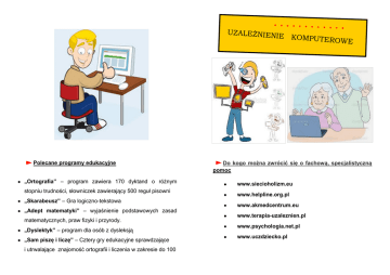 UZALEŻNIEN IE KOMPUTE RO Polecane programy edukacyjne „Ortografia” – program zawiera 170 dyktand o różnym stopniu trudności, słowniczek zawierający 500 reguł pisowni „Skarabeusz” – Gra logiczno-tekstowa „Adept matematyki” – wyjaśnienie podstawowych zasad matematycznych, praw fizyki i przyrody. „Dyslektyk” – program dla osób z dysleksją „Sam piszę i liczę” – Cztery gry edukacyjne sprawdzające i utrwalające znajomość ortografii i liczenia w zakresie do 100 WE Do kogo można zwrócić się o fachową, specjalistyczną pomoc www.siecioholizm.eu www.helpline.org.pl www.akmedcentrum.eu www.terapia-uzaleznien.pl www.psychologia.net.pl www.uczdziecko.pl PROGRAMY KOMPUTEROWE SŁUŻACE DO KONTROLI RODZICIELSKIEJ Opiekun Dziecka w Internecie 2.0.0.703 – jest to jeden z najlepszych tego typu polskich programów. Blokuje dostęp do stron www zawierających treści pornograficzne, przemoc, działalność sekt. Program zapisuje strony otwierane przez dziecko a także kontroluje czas korzystania z Internetu. Ponadto umożliwia blokadę komunikatorów internetowych typu Gadu-Gadu. Beniamin 3.0 - śledzi strony internetowe pod kątem dostępu do niepożądanych treści. Jeśli program uzna, że strona nie powinna być pokazana, wówczas następuje blokada takiej strony i pojawia się odpowiedni komunikat. Naomi 3.2.90 – stworzony z myślą o najmłodszych, służy do filtrowania niepożądanych stron w Internecie. Pozwala kontrolować otwierane serwisy i uniemożliwia przeglądanie treści: pornograficznych; związanych z hazardem, narkotykami, terroryzmem a także przemocą. Strażnik Ucznia 2.5 - to program, który służy do wszechstronnej kontroli dziecka przy komputerze. Posiada funkcje kontroli i wyłączania komunikatorów, bramek SMS, czatów czy stron pornograficznych. Oprócz tego może kontrolować programy wskazane przez użytkownika a także czas spędzany przed komputerem. RODZICUMOŻESZ POMÓC DZIECKU POPRZEZ ZMIANĘ JEGO NAWYKÓW ustalenie z dzieckiem jego planu dnia, określenie czasu korzystania z komputera, stosowanie zasady „najpierw zrób co do ciebie należy a potem komputer” oraz konsekwentne jej przestrzeganie, kontrolowanie co robi nasze dziecko przy komputerze i dbanie o przerwy co pół godziny, zainteresowanie dzieci inną formą spędzania wolnego czasu, nadzorowanie, jak dzieci wykorzystują komputer podłączony do sieci; stosowanie oprogramowania utrudniającego dostęp do treści niepożądanych; sprawdzanie, jakie miejsca odwiedzała nasza pociecha (umożliwiają to specjalne schowki rejestrujące w przeglądarkach internetowych odwiedzane adresy); ustawienie komputera w miejscu, gdzie najczęściej przebywa wielu domowników, ułatwi to obserwację; zwracanie uwagi dzieciom, by nie zostawiały w Internecie swoich personaliów, danych adresowych ani fotografii; zabronienie dzieciom dokonywania samodzielnych zakupów przez sieć i wypełniania jakichkolwiek kwestionariuszy (lub uczestniczyć w przedsięwzięciach wymagających identyfikacji); przypominanie im, aby tak jak na prawdziwej ulicy nie zawierały znajomości z nieznajomymi; nie zostawianie dziecku numerów kart kredytowych; zapraszanie koleżanek i kolegów rozmowy ze swoimi dziećmi. organizowanie wspólnych zabaw i spacerów nauczenie dziecka korzystania z informacji