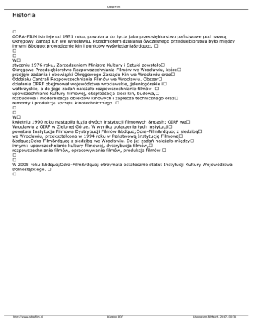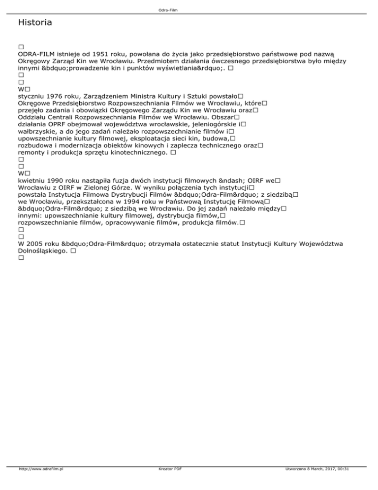 Odra-Film Historia ODRA-FILM istnieje od 1951 roku, powołana do życia jako przedsiębiorstwo państwowe pod nazwą Okręgowy Zarząd Kin we Wrocławiu. Przedmiotem działania ówczesnego przedsiębiorstwa było między innymi „prowadzenie kin i punktów wyświetlania”. W styczniu 1976 roku, Zarządzeniem Ministra Kultury i Sztuki powstało Okręgowe Przedsiębiorstwo Rozpowszechniania Filmów we Wrocławiu, które przejęło zadania i obowiązki Okręgowego Zarządu Kin we Wrocławiu oraz Oddziału Centrali Rozpowszechniania Filmów we Wrocławiu. Obszar działania OPRF obejmował województwa wrocławskie, jeleniogórskie i wałbrzyskie, a do jego zadań należało rozpowszechnianie filmów i upowszechnianie kultury filmowej, eksploatacja sieci kin, budowa, rozbudowa i modernizacja obiektów kinowych i zaplecza technicznego oraz remonty i produkcja sprzętu kinotechnicznego. W kwietniu 1990 roku nastąpiła fuzja dwóch instytucji filmowych – OIRF we Wrocławiu z OIRF w Zielonej Górze. W wyniku połączenia tych instytucji powstała Instytucja Filmowa Dystrybucji Filmów „Odra-Film” z siedzibą we Wrocławiu, przekształcona w 1994 roku w Państwową Instytucję Filmową „Odra-Film” z siedzibą we Wrocławiu. Do jej zadań należało między innymi: upowszechnianie kultury filmowej, dystrybucja filmów, rozpowszechnianie filmów, opracowywanie filmów, produkcja filmów. W 2005 roku „Odra-Film” otrzymała ostatecznie statut Instytucji Kultury Województwa Dolnośląskiego. http://www.odrafilm.pl Kreator PDF Utworzono 8 March, 2017, 00:31