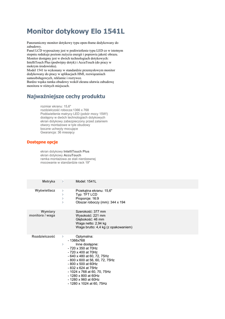 Monitor dotykowy Elo 1541L Panoramiczny monitor dotykowy typu open-frame dedykowany do zabudowy. Panel LCD wyposażony jest w podświetlenie typu LED co w istotnym stopniu redukuje poziom zużycia energii i poprawia jakość obrazu. Monitor dostępny jest w dwóch technologiach dotykowych: IntelliTouch Plus (podwójny dotyk) i AccuTouch (do pracy w mokrym środowisku). Model 1541 to wykonany w standardzie przemysłowym monitor dedykowany do pracy w aplikacjach HMI, rozwiązaniach samoobsługowych, reklamie i rozrywce. Bardzo wąska ramka obudowy wokół ekranu ułatwia zabudowę monitora w różnych miejscach. Najważniejsze cechy produktu rozmiar ekranu: 15,6" rozdzielczość robocza:1366 x 768 Podświetlenie matrycy LED (pobór mocy 15W!) dostępny w dwóch technologiach dotykowych ekran dotykowy zabezpieczony przed zalaniem otwory montażowe w tyle obudowy boczne uchwyty mocujące Gwarancja: 36 miesięcy Dostępne opcje ekran dotykowy IntelliTouch Plus ekran dotykowy AccuTouch ramka montażowa ze stali nierdzewnej mocowanie w standardzie rack 19" Metryka Wyświetlacz Wymiary monitora / waga Rozdzielczość Model: 1541L Przekątna ekranu: 15,6" Typ: TFT LCD Proporcje: 16:9 Obszar roboczy (mm): 344 x 194 Szerokość: 377 mm Wysokość: 221 mm Głębokość: 46 mm Waga netto: 2,94 kg Waga brutto: 4,4 kg (z opakowaniem) Optymalna: - 1366x768 Inne dostępne: - 720 x 350 at 70Hz - 720 x 400 at 70Hz - 640 x 480 at 60, 72, 75Hz - 800 x 600 at 56, 60, 72, 75Hz - 800 x 500 at 60Hz - 832 x 624 at 75Hz - 1024 x 768 at 60, 70, 75Hz - 1280 x 800 at 60Hz - 1280 x 960 at 60Hz - 1280 x 1024 at 60, 75Hz - 1366 x 768 at 60Hz Jasność panela LCD Czas odpowiedzi matrycy Poprawna widoczność obrazu Kontrast Wejście wideo Pobór mocy Zasilacz Szacowana trwałość podzespołów OSD Opcje montażu Gwarancja Certyfikaty i deklaracje producenta sam panel LCD: 250 cd/m2 wer. AccuTouch: 200 cd/m2 wer. IntelliTouch Plus: 225 cd/m2 16 ms poziomo: ±85° (lewo/prawo) pionowo: ±65° (góra/dół) 500:1 sygnał analogowy: VGA (Mini D-Sub 15 Pin) sygnał cyfrowy: DVI (DVI-D) maksimum: 15W typ: zewnętrzny: 12V (oferowany oddzielnie) gniazdo zasilania (w monitorze): - typ: DC Barrel Jack - średnica tulei: 6,4mm - średnica bolca (pinu): 2mm - głębokość tulei: 8,8 MTBF: 50 000 godzin (wykazanej) typ sterowania OSD: cyfrowe przyciski: menu, up, down, select, power funkcje: kontrast, jasność, pozycja obrazu, przywr. ust. fab., temperatura kolorów, głośność taktowanie, faza, ostrość, pozycja OSD, auto ustawienia, język (Angielski, Niemiecki, Hiszpański, Japoński, Francuski) funkcje publiczne OSD: blokowanie wyłącznika, blokowanie OSD Otwory montażowe w standardzie VESA 75mm Uchwyty montażowe (można je zamocować na każdym boku monitora). W komplecie wraz z monitorem dostarczana jest para uchwytów. 36 miesięcy C-Tick, cUL, IC, CCC, CE, VCCI, KCC, CoC, BSMI, UL, FCC, International CB RoHS, China RoHS, WEEE, IMERC