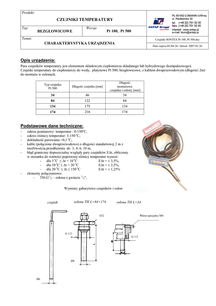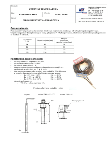 Produkt: CZUJNIKI TEMPERATURY Typ: Wersja: BEZGŁOWICOWE Pt 100, Pt 500 Temat: Czujniki SONTEX Pt 100, Pt 500.doc CHARAKTERYSTYKA URZĄDZENIA Data zapisu 02-04-26/ Aktual. 2007-01-26 Opis urządzenia: Para czujników temperatury jest elementem składowym ciepłomierza składanego lub hybrydowego (kompaktowego). Czujniki temperatury do ciepłomierzy do wody, platynowe Pt 500, bezgłowicowe, z kablem dwuprzewodowym (długości 2m) do montażu w osłonach. Typ czujnika Pt 500 Długość czujnika [mm] Długość montażowa czujnika i osłony [mm] 34 46 34 84 122 84 134 175 134 174 216 174 Podstawowe dane techniczne: - - zakres pomiarowy temperatur : 0-150oC, zakres różnicy temperatur: 3-150 oC, dokładność parowania <0,1 oC, kable (połączone dwuprzewodowo) o długości standartowej 2 m z możliwością przedłużenia do 3, 4, 6, 10 m, błąd graniczny dopuszczalny względy pary czujników E∆t, obliczony w stosunku do wartości poprawnej różnicy temperatur wynosi: - dla 3 oC ≤ ∆t < 10 oC E∆t = ± 3,5%, - dla 10 oC ≤ ∆t < 20 oC E∆t = ± 2,5%, - dla 20 oC ≤ ∆t ≤ 150 oC E∆t = ± 1,25% elementy połączeniowe: - TH-G1/2 – osłona o gwincie 1/2", Wymiary gabarytowe czujników i osłon osłona TH L=84+174 czujnik osłona TH L=34 S32 Wkręt specjalny M4 G 1/2 G 1/2 Ǿ8 Ǿ6