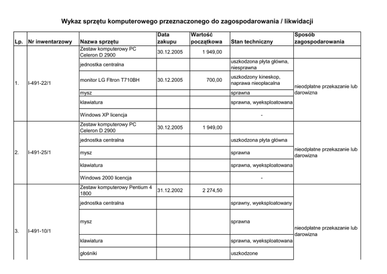 Wykaz sprzętu komputerowego przeznaczonego do zagospodarowania / likwidacji Lp. Nr inwentarzowy Nazwa sprzętu Zestaw komputerowy PC Celeron D 2900 Data zakupu 30.12.2005 Wartość początkowa 1 949,00 uszkodzona płyta główna, niesprawna jednostka centralna 1. I-491-22/1 monitor LG Fltron T710BH Stan techniczny 30.12.2005 700,00 uszkodzony kineskop, naprawa nieopłacalna mysz sprawna klawiatura sprawna, wyeksploatowana Windows XP licencja Zestaw komputerowy PC Celeron D 2900 2. I-491-25/1 30.12.2005 1 949,00 uszkodzona płyta główna mysz sprawna klawiatura sprawna, wyeksploatowana Windows 2000 licencja 3. nieodpłatne przekazanie lub darowizna - jednostka centralna Zestaw komputerowy Pentium 4 1800 Sposób zagospodarowania nieodpłatne przekazanie lub darowizna 31.12.2002 2 274,50 jednostka centralna sprawny, wyeksploatowany mysz sprawna nieodpłatne przekazanie lub darowizna I-491-10/1 klawiatura sprawna, wyeksploatowana głośniki uszkodzone Windows XP licencja - drukarka HP 840 C 31.12.2002 450,00 sprawna, wyeksploatowana uszkodzona, naprawa nieopłacalna 4. I-491-13/3 drukarka HP 840 C 30.12.2001 450,00 5. I-491-24/6 drukarka HP 3650 30.12.2003 388,30 6. I-803-1/3 drukarka HP 710 C 30.12.1999 690,00 7. I-491-13/7 listwa przepięciowa 30.12.2001 - 8. I-491-14/6 głośniki 30.12.2003 - 9. I-491-15/4 mysz 29.11.2004 - 10. I-491-19/6 głośniki 02.09.2005 - 11. I-491-32/2 mysz 19.12.2008 - Sporządził: Dorota Dylak Gostyń dnia 10.12.10 r. nieodpłatne przekazanie lub darowizna nieodpłatne przekazanie lub sprawna, wyeksploatowana darowizna nieodpłatne przekazanie lub sprawna, wyeksploatowana darowizna nieodpłatne przekazanie lub uszkodzona darowizna nieodpłatne przekazanie lub uszkodzone darowizna nieodpłatne przekazanie lub uszkodzona darowizna nieodpłatne przekazanie lub uszkodzone darowizna nieodpłatne przekazanie lub uszkodzona darowizna