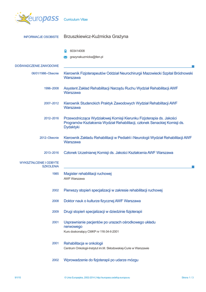 Curriculum Vitae INFORMACJE OSOBISTE Brzuszkiewicz-Kuźmicka Grażyna 603414008 [email protected] DOŚWIADCZENIE ZAWODOWE 06/01/1986–Obecnie Kierownik Fizjoterapeutów Oddział Neurochirurgii Mazowiecki Szpital Bródnowski Warszawa 1996–2008 Asystent Zakład Rehabilitacji Narządu Ruchu Wydział Rehabilitacji AWF Warszawa 2007–2012 Kierownik Studenckich Praktyk Zawodowych Wydział Rehabilitacji AWF Warszawa 2012–2016 Przewodnicząca Wydziałowej Komisji Kierunku Fizjoterapia ds. Jakości Programów Kształcenia Wydział Rehabilitacji, członek Senackiej Komisji ds. Dydaktyki 2012–Obecnie 2013–2016 Kierownik Zakładu Rehabilitacji w Pediatrii i Neurologii Wydział Rehabilitacji AWF Warszawa Członek Uczelnianej Komisji ds. Jakości Kształcenia AWF Warszawa WYKSZTAŁCENIE I ODBYTE SZKOLENIA 1985 Magister rehabilitacji ruchowej AWF Warszawa 2002 Pierwszy stopień specjalizacji w zakresie rehabilitacji ruchowej 2008 Doktor nauk o kulturze fizycznej AWF Warszawa 2009 Drugi stopień specjalizacji w dziedzinie fizjoterapii 2001 Usprawnianie pacjentów po urazach ośrodkowego układu nerwowego Kurs doskonalący CMKP nr 116-34-II-2001 2001 Rehabilitacja w onkologii Centrum Onkologii-Instytut im.M. Skłodowskiej-Curie w Warszawie 2002 9/1/15 Wprowadzenie do fizjoterapii po udarze mózgu © Unia Europejska, 2002-2014 | http://europass.cedefop.europa.eu Strona 1 / 3 Curriculum Vitae Brzuszkiewicz-Kuźmicka Grażyna Narodowy Program Profilaktyki i Leczenia Udaru Mózgu 2006 Ilościowa analiza chodu w praktyce klinicznej Kurs doskonalący CMKP nr 1-728-51-003-2006 2006 Rehabilitacja dzieci ryzyka Kurs specjalizacyjny CMKP nr 1-728-04-001-2006 2006 Rehabilitacja chorych z chorobami układu krążenia Kurs specjalizacyjny CMKP nr 1-728-02-007-2006 2006 Podstawy neurorehabilitacji Kurs specjalizacyjny CMKP nr 05-728-07-221-2006 2006 Współczesne kierunki w zakresie protezowania i aparatowania kończyn dolnych,górnych i tułowia Kurs specjalizacyjny CMKP nr 05-728-05-210-2006 2007 Podstawy praktyczne i teoretyczne PNF Kurs specjalizacyjny CMKP nr 6-002/00/010-011-1007 2012 Opieka geriatryczna Kurs doskonalący CMKP nr F/2-744-007-2012 INFORMACJE DODATKOWE Publikacje Renata Szczepaniak, Grażyna Brzuszkiewicz-Kuźmicka,Marek Szczepkowski, Teresa Pop, Zbigniew Śliwiński. Ocena aktywności ruchowej i sprawności fizycznej kobiet po 65 roku życia, ze zdiagnozowaną osteoporozą. Przegląd Medyczny Uniwersytetu Rzeszowskiego i Narodowego Instytutu Leków w Warszawie. 2014, (1): 62-73 Maria Kłoda, Grażyna Brzuszkiewicz-Kuźmicka, Janina Grzegorzewska, Dariusz Białoszewski. Ocena stabilności posturalnej pacjentów z chorobą Parkinsona. Postępy Rehabilitacji. 2013, 27, (1): 5-11 Grażyna Brzuszkiewicz-Kuźmicka, Stanisław Kuźmicki, Janusz Domaniecki. Relationships between kinesiptherapy methods used in rehabilitation and the course of lost function recovery following surgical treatment of cranio-cerebral trauma. Brain Injury. 2012, 26, (12):1431-1438 Grażyna Brzuszkiewicz-Kuźmicka, Stanisław Kuźmicki, Wiesław Tomaszewski. Powrót utraconych funkcji u chorych poddanych rehabilitacji po operacyjnym leczeniu pourazowych krwiaków przymózgowych. Fizjoterapia Polska. 2010, 10, (4): 271-279 Grażyna Brzuszkiewicz-Kuźmicka,Stanisław Kuźmicki, Janusz Domaniecki. Różnice i podobieństwa między metodą tradycyjną a wybranymi wzorcami koncepcji PNF i elementami metody Bobath w usprawnianiu chorych po operacyjnym leczeniu pourazowych krwiaków przymózgowych. Fizjoterapia Polska. 2008, 8, (1): 35-42 Projekty 9/1/15 Ocena globalnych wzorców ruchu wg Prechtla u niemowląt z zaburzeniami w jakości napięcia © Unia Europejska, 2002-2014 | http://europass.cedefop.europa.eu Strona 2 / 3 Curriculum Vitae Brzuszkiewicz-Kuźmicka Grażyna mięśniowego. Kierownik projektu (2015-2018) Optymalizacja oceny stanu funkcjonalnego oraz momentu rozpoczęcia fizjoterapii u chorych po operacyjnym leczeniu pourazowych krwiaków przymózgowych. Kierownik projektu (2009-2011) Czynniki determinujące wyniki ultrawczesnej rehabilitacji chorych po urazie czaszkowo-mózgowym. Kierownik projektu (2007-2008) Dyplomy i nagrody Srebrny medal Prezydenta Rzeczpospolitej Polskiej za wieloletnią służbę (2011) Nagroda Zarządu Głównego PTF za wkład w rozwój Fizjoterapii Polskiej Pięciokrotnie wyróżniona Nagrodą Rektora Akademii Wychowania Fizycznego Józefa Piłsudskiego w Warszawie Członkostwo Konsultant Wojewódzki w dziedzinie fizjoterapii dla obszaru mazowieckiego Prezes Zarządu Oddziału Mazowieckiego PTF Sekretarz Zarządu Głównego Polskiego Stowarzyszenia Świadomości Ciała w Rehabilitacji Członek Stowarzyszenia Neurochirurgii Polskiej 9/1/15 © Unia Europejska, 2002-2014 | http://europass.cedefop.europa.eu Strona 3 / 3