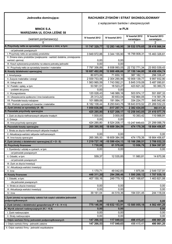 Jednostka dominująca: MINOX SA WARSZAWA UL ECHA LEŚNE 58