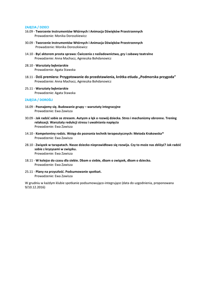 ZAJĘCIA / DZIECI 16.09 - Tworzenie Instrumentów Wtórnych i Animacja Dźwięków Przestrzennych Prowadzenie: Monika Doroszkiewicz 30.09 - Tworzenie Instrumentów Wtórnych i Animacja Dźwięków Przestrzennych Prowadzenie: Monika Doroszkiewicz 14.10 - Być aktorem prosta sprawa: Ćwiczenia z naśladownictwa, gry i zabawy teatralne Prowadzenie: Anna Machacz, Agnieszka Bohdanowicz 28.10 - Warsztaty bębniarskie Prowadzenie: Agata Stawska 18.11 - Dziś premiera: Przygotowanie do przedstawienia, krótka etiuda „Podmorska przygoda” Prowadzenie: Anna Machacz, Agnieszka Bohdanowicz 25.11 - Warsztaty bębniarskie Prowadzenie: Agata Stawska ZAJĘCIA / DOROŚLI 16.09 - Poznajemy się. Budowanie grupy – warsztaty integracyjne Prowadzenie: Ewa Zawisza 30.09 - Jak radzić sobie ze stresem. Autyzm a lęk o rozwój dziecka. Stres i mechanizmy obronne. Trening relaksacji. Warsztaty redukcji stresu i uwalniania napięcia Prowadzenie: Ewa Zawisza 14.10 - Kompetentny rodzic. Wstęp do poznania technik terapeutycznych: Metoda Krakowska® Prowadzenie: Ewa Zawisza 28.10 - Związek w tarapatach. Nasze dziecko nieprawidłowo się rozwija. Czy to może nas zbliżyć? Jak radzić sobie z kryzysami w związku. Prowadzenie: Ewa Zawisza 18.11 - W kolejce do czasu dla siebie. Dbam o siebie, dbam o związek, dbam o dziecko. Prowadzenie: Ewa Zawisza 25.11 - Plany na przyszłość. Podsumowanie spotkań. Prowadzenie: Ewa Zawisza W grudniu w każdym klubie spotkanie podsumowująco-integrujące (data do uzgodnienia, proponowana 9/10.12.2016)
