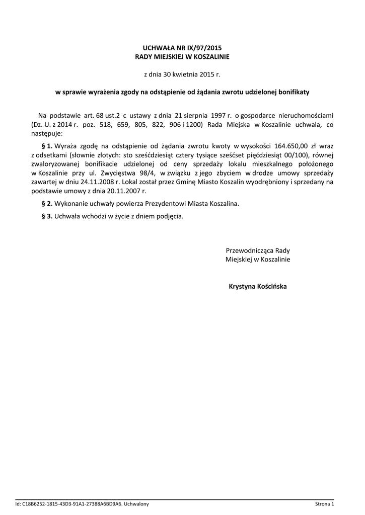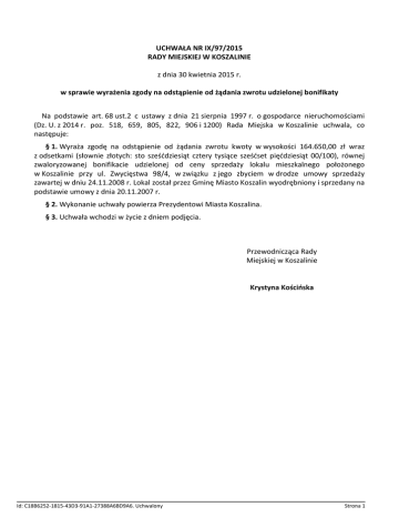 UCHWAŁA NR IX/97/2015 RADY MIEJSKIEJ W KOSZALINIE z dnia 30 kwietnia 2015 r. w sprawie wyrażenia zgody na odstąpienie od żądania zwrotu udzielonej bonifikaty Na podstawie art. 68 ust.2 c ustawy z dnia 21 sierpnia 1997 r. o gospodarce nieruchomościami (Dz. U. z 2014 r. poz. 518, 659, 805, 822, 906 i 1200) Rada Miejska w Koszalinie uchwala, co następuje: § 1. Wyraża zgodę na odstąpienie od żądania zwrotu kwoty w wysokości 164.650,00 zł wraz z odsetkami (słownie złotych: sto sześćdziesiąt cztery tysiące sześćset pięćdziesiąt 00/100), równej zwaloryzowanej bonifikacie udzielonej od ceny sprzedaży lokalu mieszkalnego położonego w Koszalinie przy ul. Zwycięstwa 98/4, w związku z jego zbyciem w drodze umowy sprzedaży zawartej w dniu 24.11.2008 r. Lokal został przez Gminę Miasto Koszalin wyodrębniony i sprzedany na podstawie umowy z dnia 20.11.2007 r. § 2. Wykonanie uchwały powierza Prezydentowi Miasta Koszalina. § 3. Uchwała wchodzi w życie z dniem podjęcia. Przewodnicząca Rady Miejskiej w Koszalinie Krystyna Kościńska Id: C18B6252-1815-43D3-91A1-27388A6BD9A6. Uchwalony Strona 1 UZASADNIENIE w sprawie wyrażenia zgody na odstąpienie od żądania zwrotu udzielonej bonifikaty. Gmina Miasto Koszalin umową zawartą w formie aktu notarialnego z dnia 20.11.2007 r. wyodrębniła i sprzedała lokal mieszkalny oznaczony nr 4 przy ul. Zwycięstwa 98 na rzecz najemcy, Pani Ewy L.R. korzystającej z pierwszeństwa w nabyciu. Od ceny sprzedaży lokalu mieszkalnego zastosowana została bonifikata w kwocie: 153.255,00 zł, słownie złotych: sto pięćdziesiąt trzy tysiące dwieście pięćdziesiąt pięć 00/100, z zastrzeżonym ustawowym 5-cio letnim terminem jej zwrotu, w przypadku niedotrzymania warunków umowy. Pani Ewa L.R. umową zawartą w formie aktu notarialnego z dnia 24.11.2008 r., to jest przed upływem zastrzeżonego ustawą terminu sprzedała lokal przy ul. Zwycięstwa 98/4, na rzecz osoby nie będącej osobą bliską w rozumieniu przepisów ustawy o gospodarce nieruchomościami. W ustawowym terminie 12 miesięcy od daty zbycia lokalu, Pani Ewa L.R. nie wykazała, że na podstawie art. 68 ust. 2a pkt 5 ustawy o gospodarce nieruchomościami spełnia przesłanki zwolnienia ze zobowiązania zwrotu kwoty równej udzielonej bonifikaty po jej waloryzacji, stąd Prezydent Miasta Koszalina pismem z dnia 27.11.2009 r. wezwał Panią Ewę L.R. do zapłaty kwoty: 164.650,00 zł, słownie złotych: sto sześćdziesiąt cztery tysiące sześćset pięćdziesiąt 00/100 równej udzielonej bonifikacie po jej waloryzacji. Pani Ewa L.R. pismem z dnia 28 grudnia 2009 r. poinformowała, że w dniu 14.06.2008 r. zawarła z deweloperem umowę rezerwacji lokalu mieszkalnego przy ul. Wojska Polskiego w Kołobrzegu, od której odstąpiła ze względu na trudności z uzyskaniem kredytu, a następnie w dniu 10.03.2009 r. zawarła kolejną umowę przedwstępną ustanowienia odrębnej własności i sprzedaży lokalu przy ul. Wylotowej w Kołobrzegu, przy czym ostateczny termin przeniesienia własności lokalu został ustalony tą umową do dnia 30.12.2010 r. Faktycznie przeniesienie własności lokalu na rzecz Pani Ewy L.R. nastąpiło umową zawartą w formie aktu notarialnego z dnia 05.11.2010 r. Zarówno wyodrębnienie i sprzedaż lokalu mieszkalnego jak i wtórne zbycie nastąpiło pod rządami znowelizowanej ustawy o gospodarce nieruchomościami. Zgodnie z art. 68 ust. 2 ustawy z dnia 21 sierpnia 1997r. o gospodarce nieruchomościami (Dz. U. z 2014 r. poz. 518 z późn. zm.), jeżeli nabywca nieruchomości zbył nieruchomość lub wykorzystał ją na inne cele niż cele uzasadniające udzielenie bonifikaty, przed upływem 10 lat, a w przypadku nieruchomości stanowiącej lokal mieszkalny przed upływem 5 lat, licząc od dnia nabycia, jest zobowiązany do zwrotu kwoty równej udzielonej bonifikacie po jej waloryzacji. Zwrot następuje na żądanie właściwego organu. Zgodnie z art. 68 ust 2a pkt 5 ustawy o gospodarce nieruchomościami, przepisu ust. 2 nie stosuje się w przypadku sprzedaży lokalu mieszkalnego, jeżeli środki uzyskane z jego sprzedaży przeznaczone zostaną w ciągu 12 miesięcy na nabycie innego lokalu mieszkalnego albo nieruchomości przeznaczonej lub wykorzystywanej na cele mieszkaniowe. Okres 12 miesięcy to maksymalny czas, jaki musi upłynąć od zbycia lokalu do nabycia innego lokalu mieszkalnego albo nieruchomości przeznaczonej lub wykorzystywanej na cele mieszkaniowe. W odniesieniu do przedmiotowej sprawy termin ustawowy wynikający z przepisu art. 68 ust. 2a pkt 5 upłynął przed datą nabycia lokalu mieszkalnego położonego w Kołobrzegu. Przedstawiony wyżej przypadek obowiązku zapłaty zwaloryzowanej równowartości bonifikaty stanowi zobowiązanie wynikające z ustawy, które zaktualizowało się w momencie przedwczesnego zbycia lokalu mieszkalnego nabytego od gminy, a następnie w związku z przekroczeniem ustawowego terminu 12 miesięcy na nabycie innego lokalu mieszkalnego albo nieruchomości przeznaczonej lub wykorzystanej na cele mieszkaniowe. Pani Ewa L.R za całe środki uzyskane ze sprzedaży lokalu mieszkalnego położonego w Koszalinie nabyła Id: C18B6252-1815-43D3-91A1-27388A6BD9A6. Uchwalony Strona 1 inny lokal mieszkalny położony w Kołobrzegu przekraczając termin nabycia lokalu wyznaczony przez ustawodawcę. Literalna wykładnia art. 68 ust 2a pkt 5 stawia Panią Ewę L.R. w niezwykle trudnej sytuacji, zmuszając nawet do zbycia zakupionego w Kołobrzegu lokalu mieszkalnego, w celu zaspokojenia roszczeń gminy o zwrot bonifikaty. Taki rygoryzm nie tylko nie sprzyja poprawie sytuacji mieszkaniowej Pani Ewy L.R. ale wielokrotnie pogorszy jej sytuację życiową. Zgodnie z art. 68 ust. 2c właściwy organ może odstąpić od żądania zwrotu udzielonej bonifikaty, w innych przypadkach niż określone w ust. 2a cytowanej ustawy, za zgodą odpowiednio wojewody, rady lub sejmiku. Gmina Miasto Koszalin skierowała sprawę z