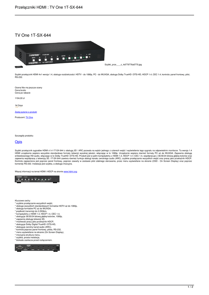 Przełączniki HDMI : TV One 1T-SX-644 TV One 1T-SX-644 Szybki_prze____c_4d779776a0770.jpg Szybki przełącznik HDMI 4x1 wersja 1.4, obsługa rozdzielczości: HDTV - do 1080p, PC - do WUXGA, obsługa Dolby TrueHD i DTS-HD, HDCP 1.4, CEC 1.4, kontrola: panel frontowy, pilot, RS-232. Ocena Nie ma jeszcze oceny Cena brutto Cena po rabacie 1104,00 zł Zadaj pytanie o produkt Producent: TV One Szczegóły produktu Opis Szybki przełącznik sygnałów HDMI v1.4 1T-SX-644 z obsługą 3D / ARC pozwala na wybór jednego z czterech wejść i wyświetlenie tego sygnału na odpowiednim monitorze. Ta wersja 1.4 HDMI urządzenia wspiera wszystkie standardowe formaty telewizji wysokiej jakości, włączając w to 1080p. Urządzenie wspiera również formaty PC aż do WUXGA. Zapewnia obsługę embedowanego HD-audio, włączając w to Dolby TrueHD i DTS-HD. Produkt jest w pełni kompatybilny z HDMI 1.4, HDCP 1.4 i CEC 1.4, współpracuje z 36/30/24 bitową głębią kolorów oraz zapewnia współpracę z telewizją 3D. 1T-SX-644 zawiera również funkcje obsługi kanału zwrotnego audio (ARC), szybkie przełączanie wszystkich wejść oraz pracę jako przekaźnik HDCP. Kontrola zapewniona jest poprzez panel frontowy, poprzez zawarty w zestawie pilot zdalnego sterowania, przez menu wyświetlane na ekranie (OSD - On Screen Display) oraz poprzez komendy RS-232. Instalacja jest szybka, a obsługa intuicyjna. Więcej informacji na temat HDMI i HDCP na stronie www.hdmi.org. Kluczowe cechy: * szybkie przełączanie wszystkich wejść, * obsługa wszystkich standardowych formatów HDTV aż do 1080p, * obsługa formatów PC aż do WUXGA, * prędkość transmisji do 2.25Gb/s, * kompatybilny z HDMI 1.4, HDCP 1.4, CEC 1.4, * obsługuje 36/30/24 bitową głębię kolorów, 1080p, * zapewnia obsługę telewizji 3D, * możliwość pracy jako przekaźnik HDCP, * obsługuje Dolby Digital TrueHD i DTS-HD, * obsługuje zwrotny kanał audio (ARC), * kontrola poprzez panel frontowy, pilota, RS-232, * menu wyświetlane na ekranie (On Screen Display), * intuicyjna struktura menu, * szybka, prosta instalacja, * blokada zasilacza przed rozłączeniem. 1/2 Przełączniki HDMI : TV One 1T-SX-644 Specyfikacja techniczna Obsługiwane wejścia: Format wejścia HDMI wersja 1.4 Typ sygnału wejściowego HDMI (oraz PC wideo aż do WUXGA) Obsługiwane wyjścia: Format wyjścia HDMI wersja 1.4 Typ sygnału wyjściowego HDMI Charakterystyka sygnału: Pasmo częstotliwości 2.25Gbps (pojedyńcze połączenie) Zgodność HDMI 1.4, HDCP 1.4 i CEC 1.4 Głębia kolorów 36/30/24 Bit, 1080p Praca przekaźnik wsparcie dla przekazywania HDCP Obsługiwane audio: Zembedowane audio Dolby® Digital TrueHD i DTS-HD Kanał zwrotny obsługa kanału zwrotnego audio (ARC) Połączenia wejścia/wyjścia: Konektory wejściowe 4x żeński HDMI typu A Konektory wyjściowe 1x żeński HDMI typu A Kontrola urządzenia: Panel frontowy przyciski panelu frontowego i OSD Pilot IR pilot zdalnego sterowania i OSD RS-232 wybór wejścia i kontorla systemu Środowiskowe: Temperatura pracy od 0° do +40° C Teperatura przechowywania od -10° do +60° C Wilgotność pracy od 20% do 90%, bez kondensacji Wilgotność przechowywania od 20% do 90%, bez kondensacji Gwarancja: Ograniczona gwarancja 3 lata Mechaniczne: Wymiary (Wys x Sze x Gł) 30x200x102mm Waga 592g Zasilanie: Zewnętrzny zasilacz 100~240VAC na 5VDC/2A Zawarte akcesoria: 1x zasilacz US, UK lub Euro 1x instrukcja obsługi, 1x pilot Pliki do pobrania Specyfikacja w języku angielskim. Instrukcja obsługi w języku angielskim. English 1T-SX-644 HDMI v1.4 FAST Switcher with 3D / ARC allows selection of any of 4 inputs for display on an HDMI compliant display device. This version 1.4 HDMI device supports all standard High Definition Television formats, including 1080p. It also supports PC formats through WUXGA. It provides embedded HD-Audio capability, including Dolby® TrueHD and DTS-HD. The product is fully HDMI 1.4, HDCP 1.4 and CEC1.4 compliant and supports Deep Color 36/30/24 Bit, 1080p @50Hz plus it provides.3D Television Support. Audio Return Channel Support (ARC), Fast Switching of all inputs and operation as an HDCP Repeater is included. Control is via the Front Panel, an included, full-featured remote control which controls both the selection of inputs and also accesses an OSD (On Screen Display) for system control or via RS-232 commands. Installation is fast and operation is intuitive. 2/2 Powered by TCPDF (www.tcpdf.org)