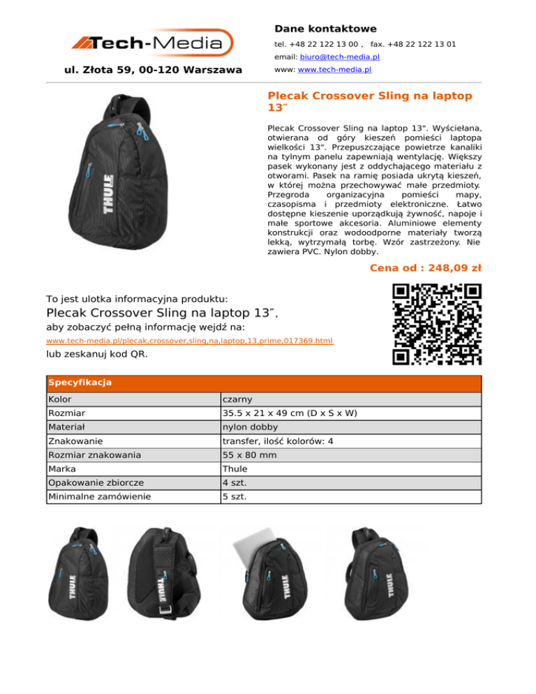 Dane kontaktowe tel. +48 22 122 13 00 , fax. +48 22 122 13 01 email: [email protected] ul. Złota 59, 00-120 Warszawa www: www.tech-media.pl Plecak Crossover Sling na laptop 13″ Plecak Crossover Sling na laptop 13". Wyściełana, otwierana od góry kieszeń pomieści laptopa wielkości 13". Przepuszczające powietrze kanaliki na tylnym panelu zapewniają wentylację. Większy pasek wykonany jest z oddychającego materiału z otworami. Pasek na ramię posiada ukrytą kieszeń, w której można przechowywać małe przedmioty. Przegroda organizacyjna pomieści mapy, czasopisma i przedmioty elektroniczne. Łatwo dostępne kieszenie uporządkują żywność, napoje i małe sportowe akcesoria. Aluminiowe elementy konstrukcji oraz wodoodporne materiały tworzą lekką, wytrzymałą torbę. Wzór zastrzeżony. Nie zawiera PVC. Nylon dobby. Cena od : 248,09 zł To jest ulotka informacyjna produktu: Plecak Crossover Sling na laptop 13″ , aby zobaczyć pełną informację wejdź na: www.tech-media.pl/plecak,crossover,sling,na,laptop,13,prime,017369.html lub zeskanuj kod QR. Specyfikacja Kolor czarny Rozmiar 35.5 x 21 x 49 cm (D x S x W) Materiał nylon dobby Znakowanie transfer, ilość kolorów: 4 Rozmiar znakowania 55 x 80 mm Marka Thule Opakowanie zbiorcze 4 szt. Minimalne zamówienie 5 szt.
