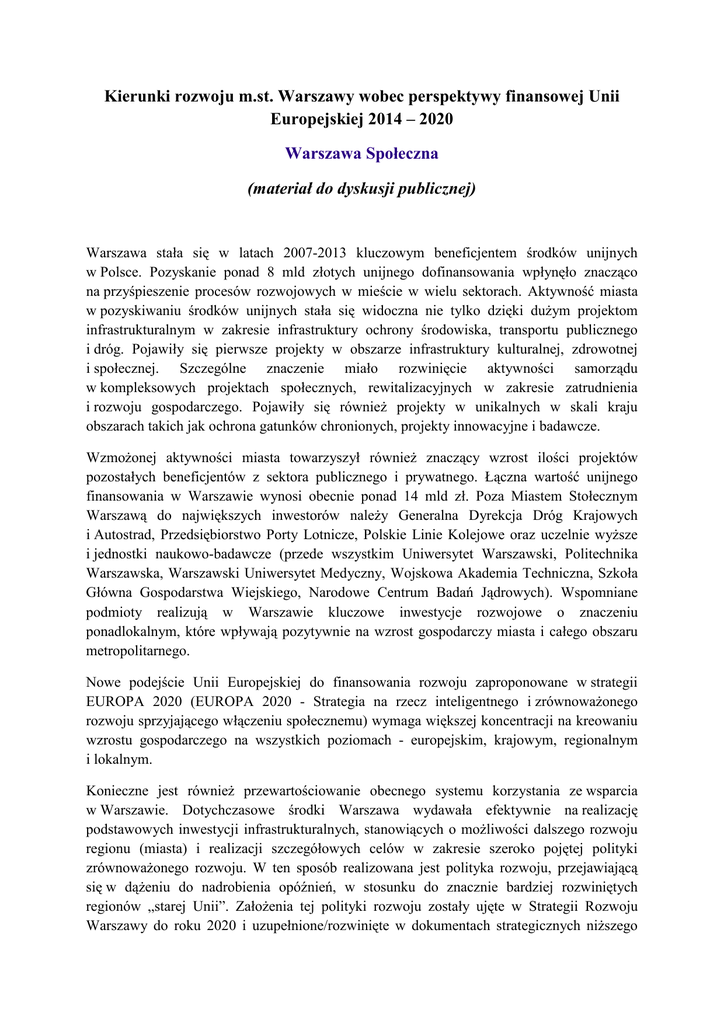 Kierunki rozwoju m.st. Warszawy wobec perspektywy finansowej Unii Europejskiej 2014 – 2020 Warszawa Społeczna (materiał do dyskusji publicznej) Warszawa stała się w latach 2007-2013 kluczowym beneficjentem środków unijnych w Polsce. Pozyskanie ponad 8 mld złotych unijnego dofinansowania wpłynęło znacząco na przyśpieszenie procesów rozwojowych w mieście w wielu sektorach. Aktywność miasta w pozyskiwaniu środków unijnych stała się widoczna nie tylko dzięki dużym projektom infrastrukturalnym w zakresie infrastruktury ochrony środowiska, transportu publicznego i dróg. Pojawiły się pierwsze projekty w obszarze infrastruktury kulturalnej, zdrowotnej i społecznej. Szczególne znaczenie miało rozwinięcie aktywności samorządu w kompleksowych projektach społecznych, rewitalizacyjnych w zakresie zatrudnienia i rozwoju gospodarczego. Pojawiły się również projekty w unikalnych w skali kraju obszarach takich jak ochrona gatunków chronionych, projekty innowacyjne i badawcze. Wzmożonej aktywności miasta towarzyszył również znaczący wzrost ilości projektów pozostałych beneficjentów z sektora publicznego i prywatnego. Łączna wartość unijnego finansowania w Warszawie wynosi obecnie ponad 14 mld zł. Poza Miastem Stołecznym Warszawą do największych inwestorów należy Generalna Dyrekcja Dróg Krajowych i Autostrad, Przedsiębiorstwo Porty Lotnicze, Polskie Linie Kolejowe oraz uczelnie wyższe i jednostki naukowo-badawcze (przede wszystkim Uniwersytet Warszawski, Politechnika Warszawska, Warszawski Uniwersytet Medyczny, Wojskowa Akademia Techniczna, Szkoła Główna Gospodarstwa Wiejskiego, Narodowe Centrum Badań Jądrowych). Wspomniane podmioty realizują w Warszawie kluczowe inwestycje rozwojowe o znaczeniu ponadlokalnym, które wpływają pozytywnie na wzrost gospodarczy miasta i całego obszaru metropolitarnego. Nowe podejście Unii Europejskiej do finansowania rozwoju zaproponowane w strategii EUROPA 2020 (EUROPA 2020 - Strategia na rzecz inteligentnego i zrównoważonego rozwoju sprzyjającego włączeniu społecznemu) wymaga większej koncentracji na kreowaniu wzrostu gospodarczego na wszystkich poziomach - europejskim, krajowym, regionalnym i lokalnym. Konieczne jest również przewartościowanie obecnego systemu korzystania ze wsparcia w Warszawie. Dotychczasowe środki Warszawa wydawała efektywnie na realizację podstawowych inwestycji infrastrukturalnych, stanowiących o możliwości dalszego rozwoju regionu (miasta) i realizacji szczegółowych celów w zakresie szeroko pojętej polityki zrównoważonego rozwoju. W ten sposób realizowana jest polityka rozwoju, przejawiającą się w dążeniu do nadrobienia opóźnień, w stosunku do znacznie bardziej rozwiniętych regionów „starej Unii”. Założenia tej polityki rozwoju zostały ujęte w Strategii Rozwoju Warszawy do roku 2020 i uzupełnione/rozwinięte w dokumentach strategicznych niższego rzędu w takich obszarach jak transport, ochrona środowiska, rozwój zrównoważony, polityka społeczna, rozwój gospodarczy. Dziś Warszawa rozpoczyna kolejny etap swojego rozwoju. Proces pozyskania rekordowych środków unijnych zbiegł się w czasie i miał również wpływ na rozwój gospodarczy i społeczny miasta. W tym czasie odnotowano gwałtowny wzrost pozycji Warszawy na arenie międzynarodowej (potwierdzony wieloma rankingami i badaniami). Aby podtrzymać pozytywne trendy wzrostu gospodarczego konieczny jest dalszy rozwój infrastruktury transportowej. Niezbędna jest też realizacja przyjętego zrównoważonego planu zmierzającego do redukcji zanieczyszczeń. Ważnym elementem jest również doskonalenie narzędzi włączenia społecznego, które muszą być dostosowane do zróżnicowanych potrzeb lokalnych na terenie Warszawy. Wyzwania globalizacji wymagają również konsekwentnej polityki w zakresie kreowania trwałych podstaw rozwoju gospodarczego opartego o rozwój kapitału intelektualnego, kreatywność, innowacje i potencjał badawczo-rozwojowy. Zgodnie z zaleceniami Strategii Rozwoju Kraju, Krajowej Strategii Rozwoju Regionalnego, Koncepcji Przestrzennego Rozwoju Kraju konieczne jest również ciągłe doskonalenie jakości zarządzania. Dotyczy to zarówno nowych instrumentów w zakresie zarządzania rozwojem - zarządzania wieloszczeblowego, jak również obejmuje nowy model włączania środowisk społecznych, gospodarczych i naukowych w nurt przemian społecznogospodarczych tak, by stały się one aktywnym partnerem dla planowania i realizacji działań rozwojowych. Niniejszy dokument stanowi materiał wyjściowy do dyskusji publicznej w zakresie kształtowania polityki rozwoju w ścisłym powiązaniu z wykorzystaniem możliwości finansowania kluczowych działań ze środków europejskich. Wskazane kierunki rozwoju zostały podzielone na trzy kluczowe obszary zgodnie z podejściem określonym w dokumencie strategicznym EUROPA 2020. Kluczowym uzasadnieniem dla takiej struktury dokumentu jest spodziewana koncentracja interwencji środków unijnych w układzie: 1. Warszawa Innowacyjna – rozwój inteligentny (ang. smart growth), 2. Warszawa Społeczna – rozwój sprzyjający włączeniu społecznemu (ang. inclusive growth), 3. Warszawa Zrównoważona – rozwój zrównoważony (ang. sustainable growth). Europejski Fundusz Społeczny (EFS) i Europejska Współpraca Terytorialna (EWT) Z uwagi na fakt, że środki pochodzące ze źródeł EFS i EWT mają charakter nieinwestycyjny tzn. co do zasady nie mogą finansować projektów infrastrukturalnych oraz ze względu na wielkość projektów (w przeważającej części nie przekraczają 1 mln zł) system ich wdrażania był oparty na innych założeniach i miał charakter bardziej masowy. Kluczową rolę odgrywała aktywność lokalna poszczególnych dzielnic i dzielnicowych jednostek organizacyjnych (ośrodki pomocy społecznej, szkoły). Niewielka skala projektów, a także zakres kompetencji dzielnic sprawiły, że to 