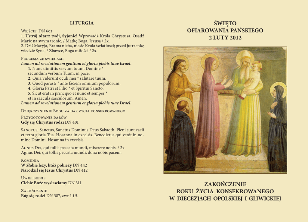 LITURGIA Wejście: DN 602 1. Ustrój ołtarz twój, Syjonie! Wprowadź Króla Chrystusa. Osadź Marię na swym tronie, / Matkę Boga, Jezusa / 2x. 2. Dziś Maryja, Brama nieba, niesie Króla światłości; przed jutrzenkę wiedzie Syna, / Zbawcę, Boga miłości / 2x. ŚWIĘTO OFIAROWANIA PAŃSKIEGO 2 LUTY 2012 Procesja ze świecami Lumen ad revelationem gentium et gloria plebis tuae Israel. 1. Nunc dimittis servum tuum, Domine * secundum verbum Tuum, in pace. 2. Quia viderunt oculi mei * salutare tuum. 3. Quod parasti * ante faciem omnium populorum. 4. Gloria Patri et Filio * et Spiritui Sancto. 5. Sicut erat in principio et nunc et semper * et in saecula saeculorum. Amen. Lumen ad revelationem gentium et gloria plebis tuae Israel. Dziękczynienie Bogu za dar życia konsekrowanego Przygotowanie darów Gdy się Chrystus rodzi DN 401 Sanctus, Sanctus, Sanctus Dominus Deus Sabaoth. Pleni sunt caeli et terra gloria Tua. Hosanna in excelsis. Benedictus qui venit in nomine Domini. Hosanna in excelsis. Agnus Dei, qui tollis peccata mundi, miserere nobis. / 2x Agnus Dei, qui tollis peccata mundi, dona nobis pacem. Komunia W żłobie leży, któż pobieży DN 442 Narodził się Jezus Chrystus DN 412 Uwielbienie Ciebie Boże wysławiamy DN 311 Zakończenie Bóg się rodzi DN 387, zwr 1 i 5. ZAKOŃCZENIE ROKU ŻYCIA KONSEKROWANEGO W DIECEZJACH OPOLSKIEJ I GLIWICKIEJ DZIĘKCZYNIENIE BOGU ZA DAR ŻYCIA KONSEKROWANEGO Ks. Biskup: Drodzy bracia i siostry, kończąc uroczyście Rok Życia Konsekrowanego w naszych diecezjach w Święto Ofiarowania Pańskiego zapraszam was wszystkich wraz ze mną do dziękczynienia Panu za dar życia konsekrowanego, które Duch Święty wzbudza w Kościele. Wy, tutaj obecni, poświęceni Służbie Bożej, w zadziwiającej różnorodności powołań w Kościele, odnówcie zobowiązanie naśladowania Chrystusa posłusznego, ubogiego i czystego, aby Chrystus Pan – światło narodów, poprzez wasze ewangeliczne świadectwo zabłysnął w Kościele i zajaśniał światu. Chwila ciszy Błogosławiony bądź Panie, Ojcze Święty, ponieważ w swej nieskończonej dobroci, głosem Ducha Świętego w każdym czasie powołujesz mężczyzn i kobiety, aby, poświęceni Tobie już w chrzcie świętym, byli w Kościele znakiem radykalnego naśladowania Chrystusa, żywym świadectwem Ewangelii, zwiastowaniem wartości Królestwa oraz proroctwem nowego i ostatecznego Miasta – niebieskiego Jeruzalem. Wszyscy: Tobie, Ojcze cześć i chwała ! Siostry: Wychwalamy Cię, Ojcze i błogosławimy Cię za to, że w Chrystusie Jezusie, Twoim Synu, dałeś nam doskonały obraz posłusznego Sługi, który czyni z Twojej woli swój pokarm, ze służby normę życia, z miłości wzajemnej najwyższe prawo Królestwa. Bracia: Dzięki Ci, Ojcze, za dar Chrystusa, Syna Twojej Służebnicy Maryi, Sługę posłusznego aż do śmierci. Z radością potwierdzamy dziś nasze zobowiązanie do posłuszeństwa Ewangelii, głosowi Kościoła i naszej regule życia. Wszyscy: Tobie, Ojcze cześć i chwała ! Siostry: Wychwalamy Cię, Ojcze, i błogosławimy Cię za to, że w Chrystusie Jezusie, naszym Bracie, dałeś nam przykład Daru z samego siebie: On, będąc bogaty, dla nas stał się ubogi, ogłosił błogosławionymi ubogich w Duchu i najmniejszym otworzył skarbnice Królestwa. Bracia: Dzięki Ci, Ojcze, za dar Chrystusa, Syna Człowieczego, cichego, pokornego i ubogiego, który nie miał miejsca, gdzie mógłby głowę oprzeć. Pełni radości potwierdzamy dziś nasze zobowiązanie do życia w umiarze i surowości, by pragnienie posiadania przezwyciężać radością daru, a dobrami świata posługiwać się dla świadectwa Ewangelii i w służbie człowiekowi. Wszyscy: Tobie, Ojcze cześć i chwała ! Siostry: Wychwalamy Cię, Ojcze i błogosławimy Cię za to, że w Chrystusie Jezusie, Synu Dziewiczej Matki Maryi, dałeś nam najwyższy przykład Miłości konsekrowanej. On, Baranek bez skazy, żył miłując Ciebie i braci, umarł na krzyżu przebaczając i otwierając bramy Królestwa. Bracia: Dzięki Ci, Ojcze, za dar Chrystusa, dziewiczego Oblubieńca Kościoła-Oblubienicy. Z radością potwierdzamy dziś nasze zobowiązanie do strzeżenia czystości naszego serca i niewinności naszego ciała, by żyć miłością niepodzielną dla Twojej chwały i dla zbawienia człowieka. Wszyscy: Tobie, Ojcze cześć i chwała ! Ks. Biskup: Wejrzyj Ojcze z dobrocią na twoich synów i twoje córki – stałych w wierze, radosnych w nadziei i rozpalonych Twoją miłością. Niech staną się, dzięki Twojej łasce, odblaskiem twego światła, narzędziem Ducha pokoju i przedłużeniem obecności Chrystusa między ludźmi, który żyje i króluje na wieki wieków. Amen.
