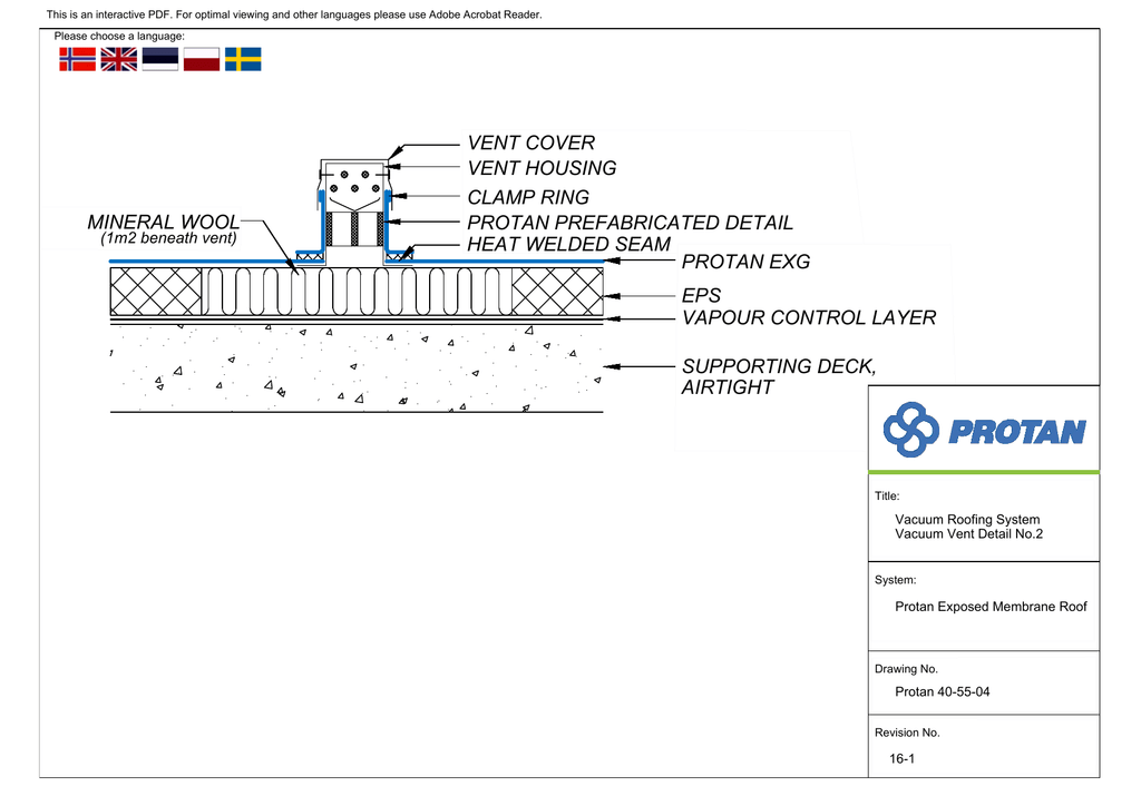 This is an interactive PDF. For optimal viewing and other languages please use Adobe Acrobat Reader. Please choose a language: MINERAALVILL MINERALULL MINERAL WOOL beneath vent) (1m2 (1m2 pod kominkiem) (1m2 under tuuluti ventil) all) VENT COVER TUULUTI VENTILHATT KATE PERFOROWANA TUULUTI VENTIL VENT HOUSING KORPUSOBUDOWA KOMINKA OPASKA ZACISKOWA CLAMP KINNITUSKLAMBER KLEMRING RING PROTAN PREFABRICATED TORUKATE PREFABRIKERT PREFABRICERAD DETALJ DETAIL STOSDETALJ HEAT KEEVISLIIDE VARMLUFTSVETS WELDED SEAM PROTAN EXG MEMBRANA PROTAN EXG EPS DAMPSPERRE VAPOUR CONTROL LAYER PAROIZOLACJA SUPPORTING DECK, KANDEKONSTRUKTSIOON, AIRTIGHT KONSTRUKSJON KONSTRUKTION (LUFTTETT) Titel: Joonis: Tittel: Title: VacuumVacuum Vakuumtak System Vaakumkatus Vakuum Tak Roofing System Ventildetalj Kominek Ventil Vacuum Detalj Vent Vacuum - -Nr.2 Nr.2 Detail - detal No.2nr 2 System: Kaitsmata Protan Exponerade Membrana Eksponert Exposed ProtanMembrane kattega Takbelegg Eksponowana Tak katus Roof Ritning Nr Joonise Tegning Drawing rysunku: Nr. nr. Nr. No. Protan 40-55-04 Senaste Nr Versioon: Siste Revision rewizji: Rev. Rev. No. Nr. Nr. 16-1