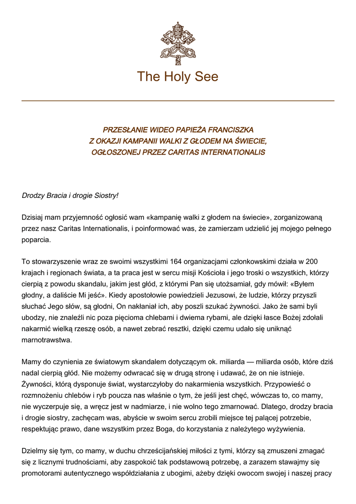 The Holy See PRZESŁANIE WIDEO PAPIEŻA FRANCISZKA Z OKAZJI KAMPANII WALKI Z GŁODEM NA ŚWIECIE, OGŁOSZONEJ PRZEZ CARITAS INTERNATIONALIS Drodzy Bracia i drogie Siostry! Dzisiaj mam przyjemność ogłosić wam «kampanię walki z głodem na świecie», zorganizowaną przez nasz Caritas Internationalis, i poinformować was, że zamierzam udzielić jej mojego pełnego poparcia. To stowarzyszenie wraz ze swoimi wszystkimi 164 organizacjami członkowskimi działa w 200 krajach i regionach świata, a ta praca jest w sercu misji Kościoła i jego troski o wszystkich, którzy cierpią z powodu skandalu, jakim jest głód, z którymi Pan się utożsamiał, gdy mówił: «Byłem głodny, a daliście Mi jeść». Kiedy apostołowie powiedzieli Jezusowi, że ludzie, którzy przyszli słuchać Jego słów, są głodni, On nakłaniał ich, aby poszli szukać żywności. Jako że sami byli ubodzy, nie znaleźli nic poza pięcioma chlebami i dwiema rybami, ale dzięki łasce Bożej zdołali nakarmić wielką rzeszę osób, a nawet zebrać resztki, dzięki czemu udało się uniknąć marnotrawstwa. Mamy do czynienia ze światowym skandalem dotyczącym ok. miliarda — miliarda osób, które dziś nadal cierpią głód. Nie możemy odwracać się w drugą stronę i udawać, że on nie istnieje. Żywności, którą dysponuje świat, wystarczyłoby do nakarmienia wszystkich. Przypowieść o rozmnożeniu chlebów i ryb poucza nas właśnie o tym, że jeśli jest chęć, wówczas to, co mamy, nie wyczerpuje się, a wręcz jest w nadmiarze, i nie wolno tego zmarnować. Dlatego, drodzy bracia i drogie siostry, zachęcam was, abyście w swoim sercu zrobili miejsce tej palącej potrzebie, respektując prawo, dane wszystkim przez Boga, do korzystania z należytego wyżywienia. Dzielmy się tym, co mamy, w duchu chrześcijańskiej miłości z tymi, którzy są zmuszeni zmagać się z licznymi trudnościami, aby zaspokoić tak podstawową potrzebę, a zarazem stawajmy się promotorami autentycznego współdziałania z ubogimi, ażeby dzięki owocom swojej i naszej pracy 2 mogli wieść godne życie. Wzywam wszystkie instytucje świata, cały Kościół i każdego z nas, jako jedną rodzinę ludzką, do dania głosu wszystkim osobom, które w milczeniu cierpią głód, aby ten głos stał się wołaniem zdolnym wstrząsnąć światem. Ta kampania ma być także zachętą dla nas wszystkich, abyśmy bardziej świadomie dokonywali naszych wyborów żywieniowych, bowiem często wiążą się one z marnowaniem żywności i niewłaściwym korzystaniem z zasobów, jakie mamy do dyspozycji. Jest ona również napomnieniem, aby przestać myśleć, że nasze postępowanie na co dzień nie ma wpływu na życie tych, którzy — czy są blisko, czy daleko — głód cierpią na własnej skórze. Proszę was z całego serca o wsparcie naszego Caritasu w tej szlachetnej kampanii, abyśmy działali jak jedna rodzina, zabiegająca o to, aby wszystkim zapewnić pożywienie. Prośmy Boga, aby dał nam łaskę zobaczenia świata, w którym nikt nigdy nie będzie umierał z głodu. A prosząc o tę łaskę, udzielam wam mojego błogosławieństwa. FRANCESCO © Copyright - Libreria Editrice Vaticana